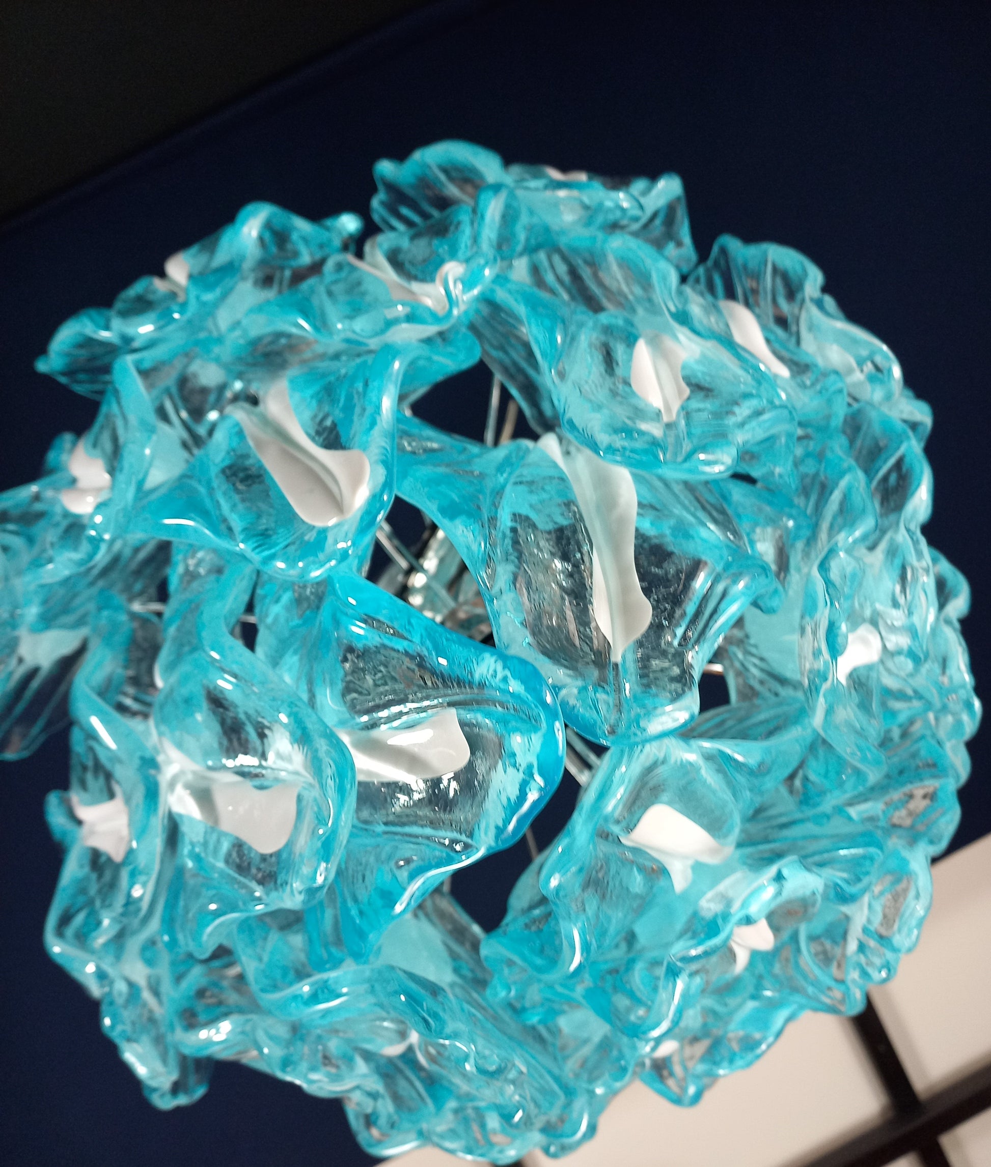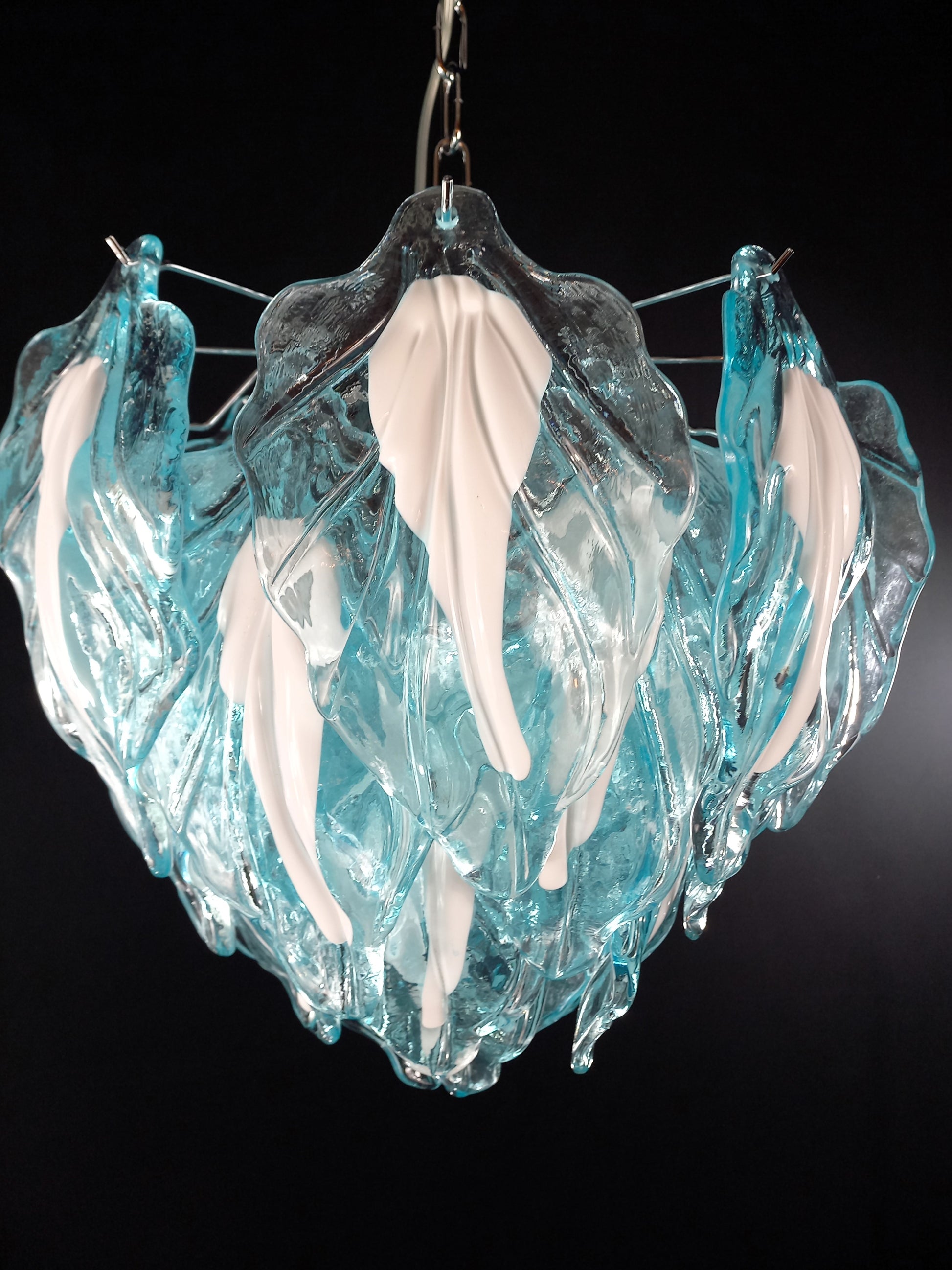 Lampadario stile Vintage che ricorda gli anni'80, artigianale di Murano. Di forma rotonda, adatto ad ogni ambiente. Questo lampadario è composto da n. 25 vetri foglie di Murano ,cristallo colore blu chiaro, con anima bianco latte . Il lampadario stile vintage ha riflessi di luce molto speciali visti dalle diverse angolazioni. I vetri foglia blu chiaro con anima bianca ricordano le grandi foglie d'inverno, quando sono ricoperte da ghiaccio e neve. Finitura in un bellissimo cromo lucido, molto elegante. Molto esclusivo, riempie la stanza con colore ma sobrietà. Con la sua forma riempitiva e completa non riuscirai a smettere di guardarlo, regala emozioni diverse sia da spento da con le luci accese, grazie ai suoi colori freddi e vivaci. Questo lampadario ha diametro 45 cm. ed altezza 40 cm. Porta n. 4 luci E27. Tutti i nostri lampadari sono creati e prodotti presso la nostra azienda, dai nostri Maestri.
