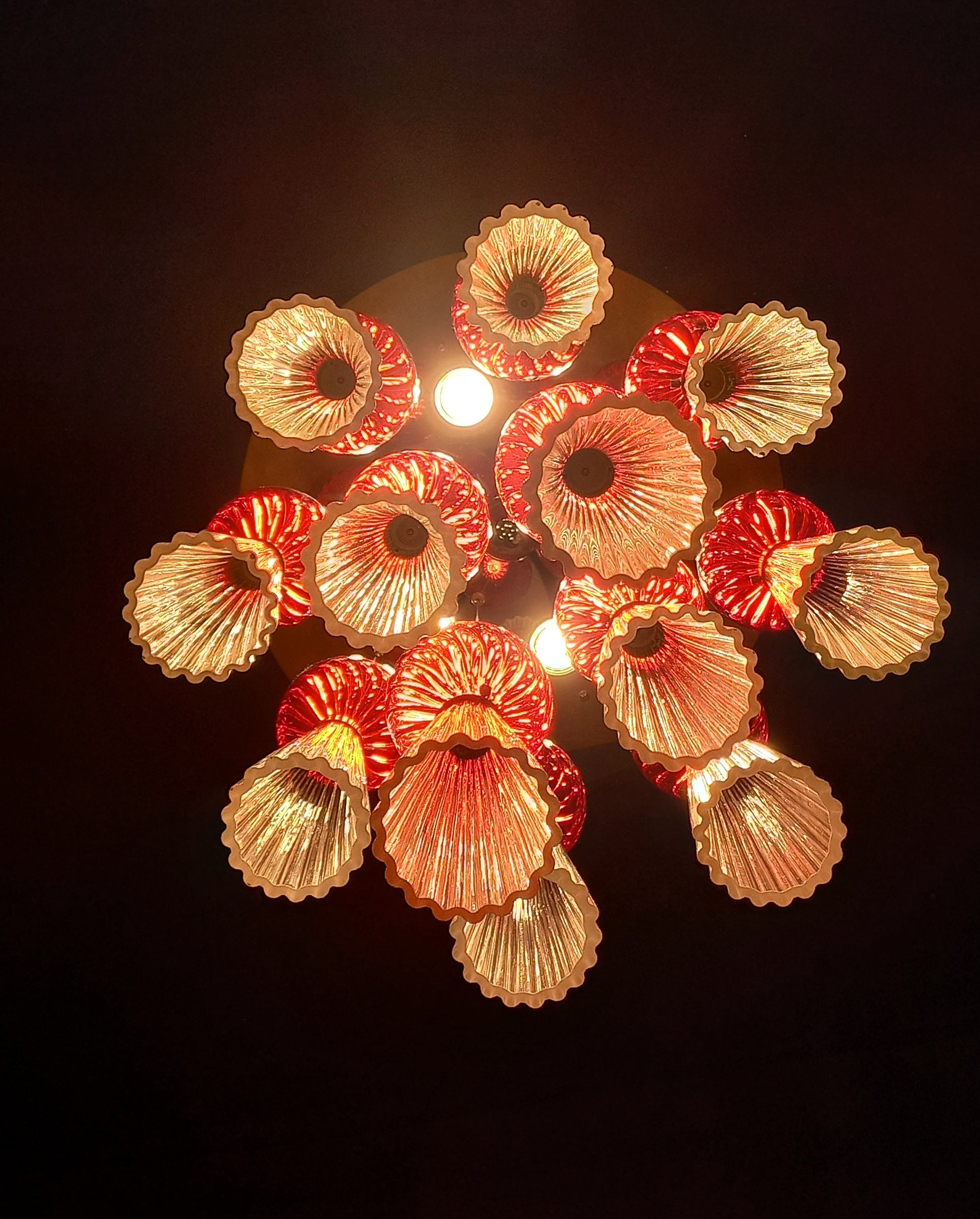 Introvabile ed imperiale lampadario con luci a Led. Questo lampadario plafoniera con attacco diretto a soffitto è composto da un piatto di acciaio cromo lucido da diametro 50 cm. con n. 6 luci a Led GU10 basso consumo, al quale sono appesi n. 12 vetri con cavetti di acciaio, regolabili in altezza, e che possono arrivare fino a 150 cm, consentendo così di regolare a proprio piacere e in base alle proprie esigenze le lunghezze dei vari cavetti di acciaio. I vetri appesi ai cavetti di acciaio sono degli splendidi vetri composti ognuno da una sfera di vetro di Murano in cristallo, soffiato e lavorato a mano, di colore rosso, e unita con un anello ad un ulteriore vetro di cristallo trasparente, sempre fatto a mano, che ricorda la forma di un cono rigato. Il risultato è una strepitosa plafoniera in cui le luci riflettono i bellissimi colori dei vetri, che si riflettono a loro volta nel piatto di acciaio riflettente. Un grande lampadario di design che arricchisce la vostra casa e regala colore ed armonia. Riepilogando: Plafoniera composta da un piatto di acciaio D. 50 cm. in cromo lucido riflettente, in cui sono incassate n. 6 luci a Led GU10. Dal piatto partono 12 cavetti di acciaio regolabili fino ad una lunghezza di 150 cm. , ai quali sono saldamente appesi 12 vetri artigianali, completamente soffiati e fatti a mano, composti da una sfera rossa soffiata e un vetro cono con trama rigata in cristallo di Murano, fatto a mano.