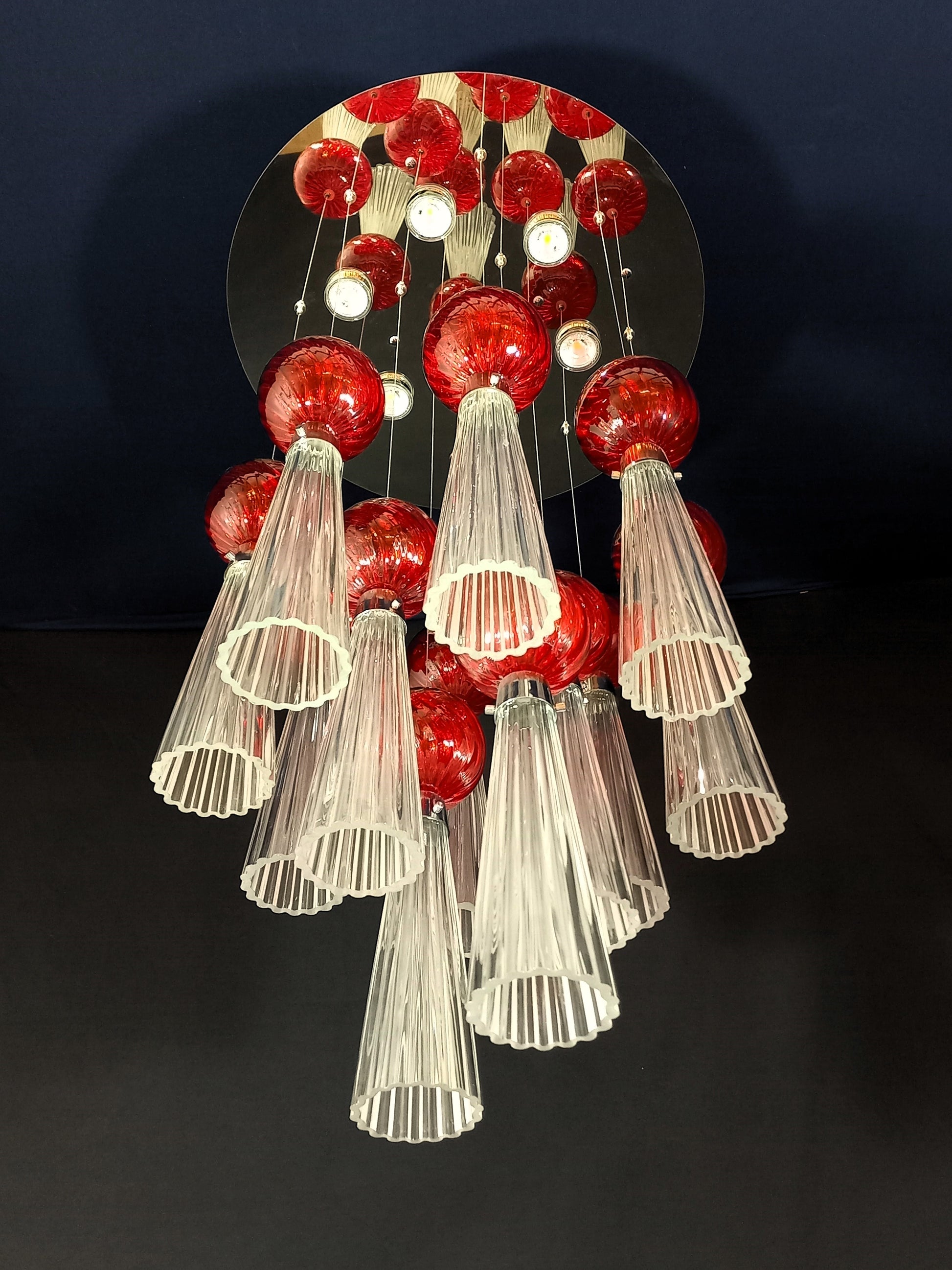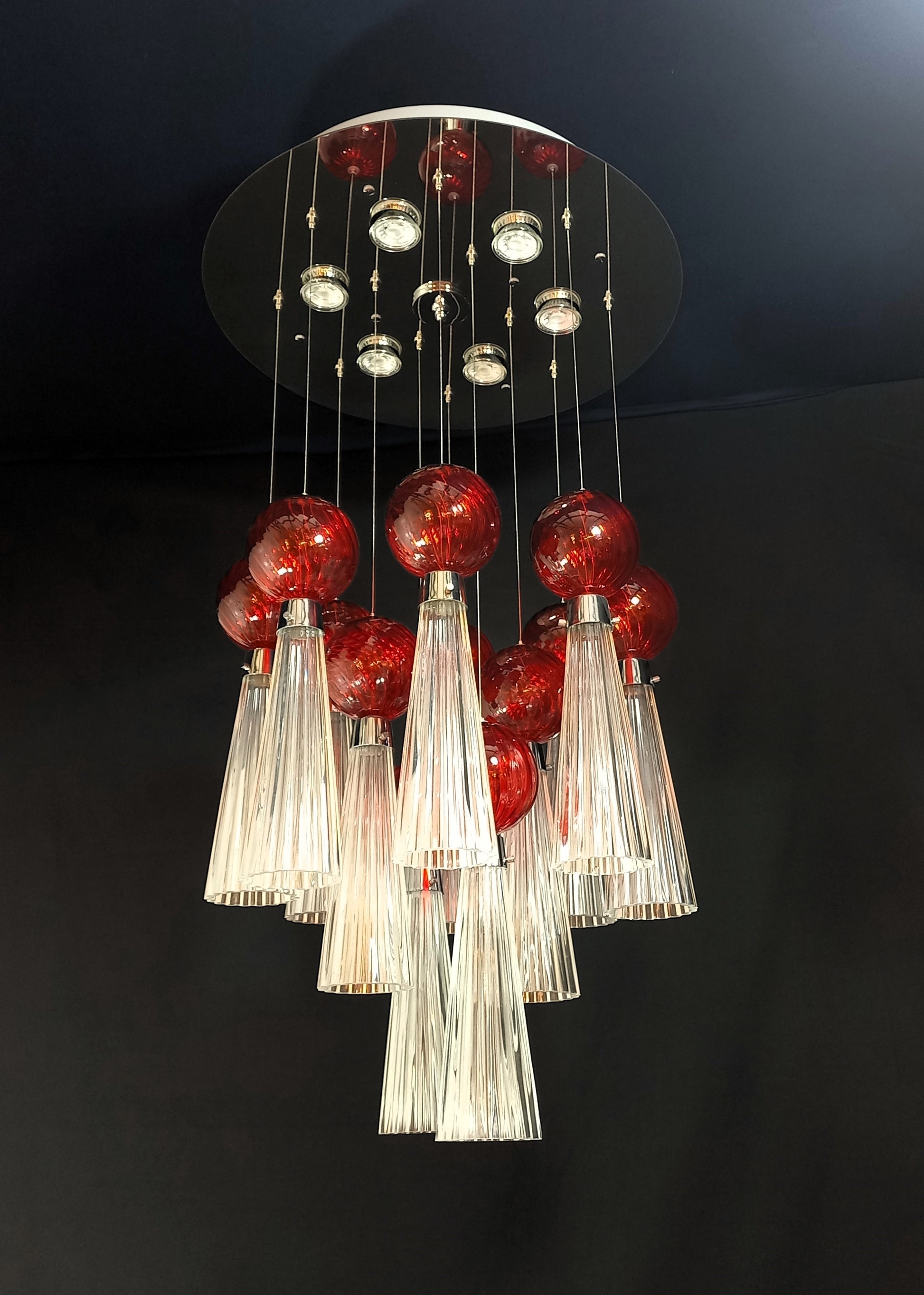 Abbiamo disponibile anche la versione più grande di questo lampadario, con piatto di acciaio che misura diametro 60 cm., n. 8 lampadine a led GU10, e n. 16 cavetti d'acciaio che possono arrivare fini ad una lunghezza di 150 cm. ai quali sono attaccati 16 vetri con sfera di vetro soffiata rossa, e cono di vetro con trama rigata in cristallo di Murano. Il prezzo per questa plafoniera invece è euro 1.350,00. Per qualunque richiesta scrivetemi pure una email e sarete ricontattati.
