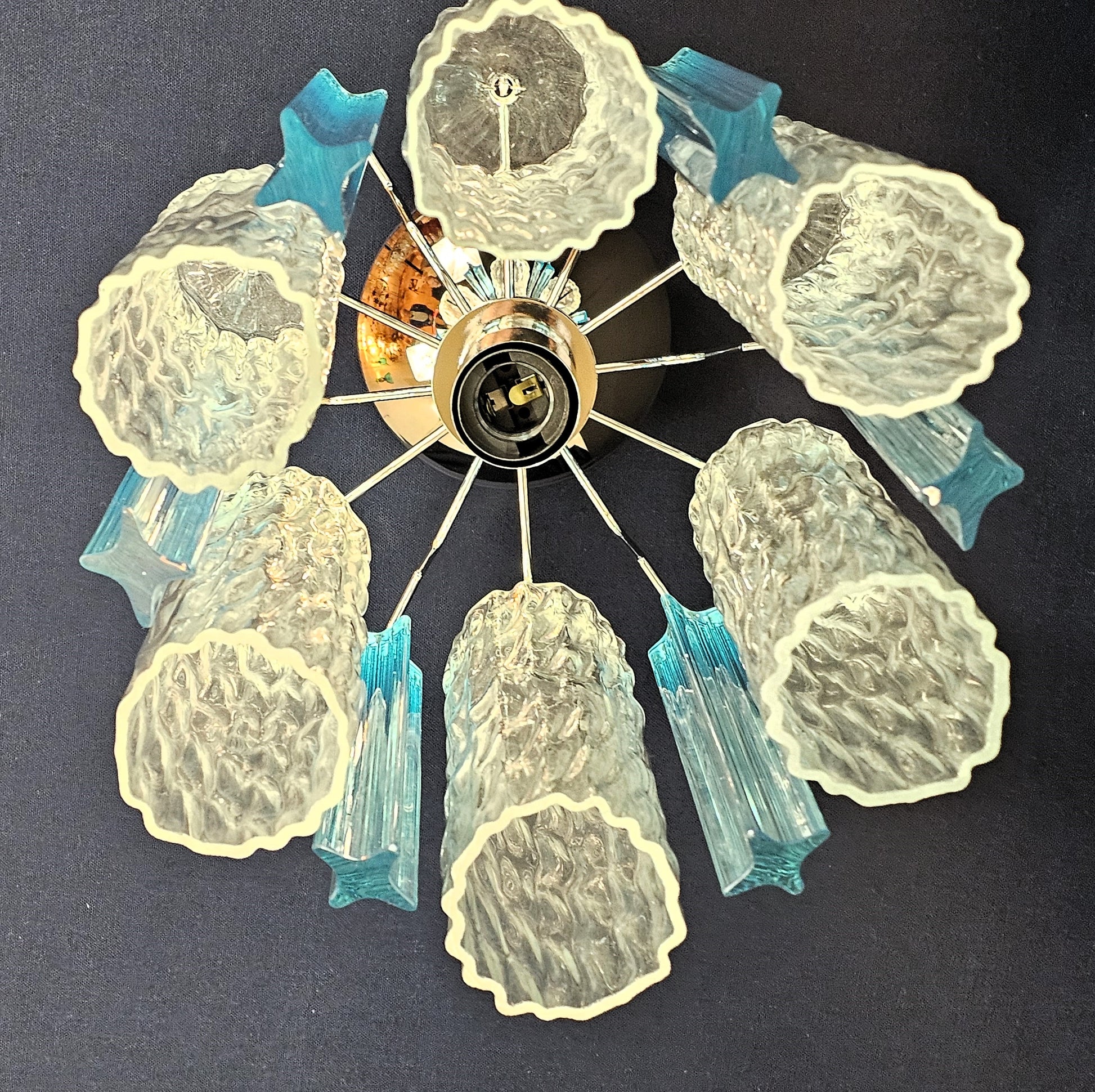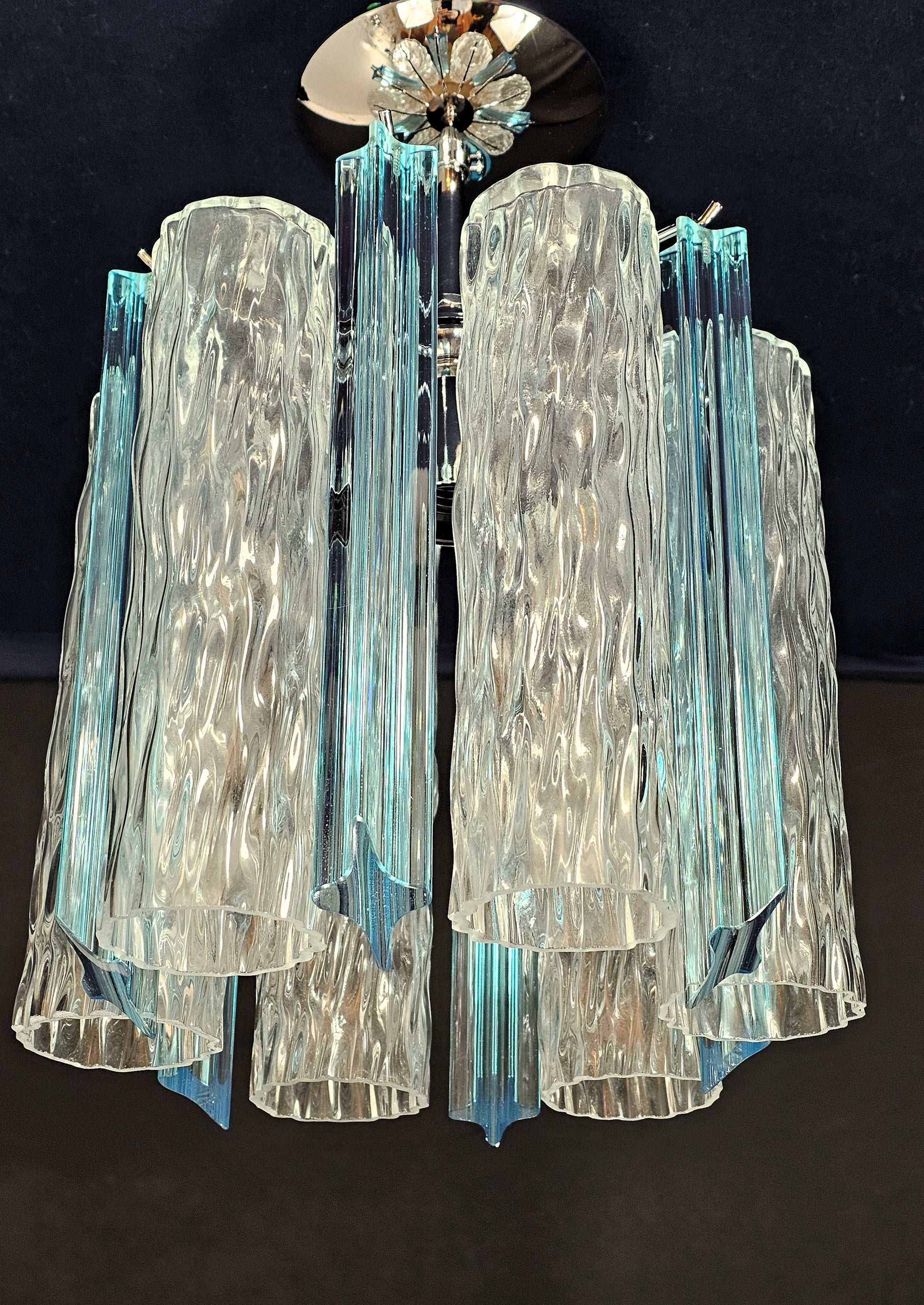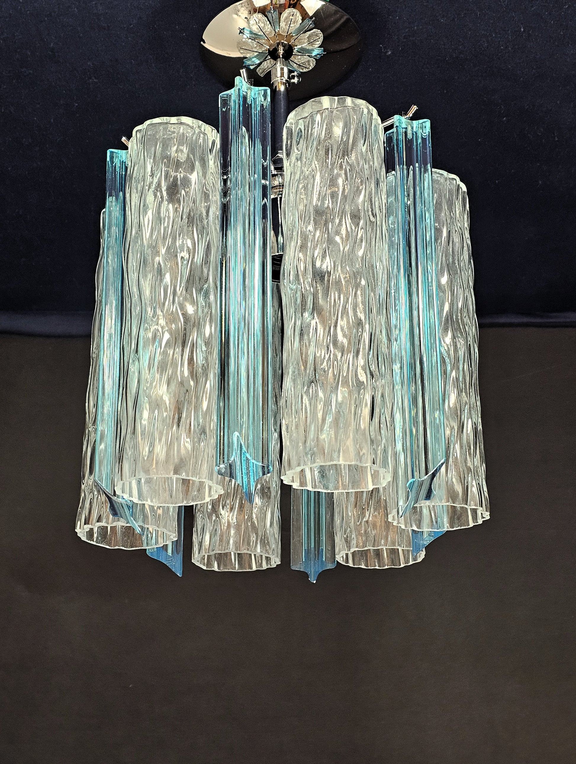 Plafoniera lampada Vintage di Murano, stile Barovier, anni'80. Con due diversi tipi di vetri di Murano, alternati. Sono presenti infatti vetri prismi quadriedri, in cristallo colore azzurro acquamare. E vetri di Murano tubi cilindro, dalla particolare trama increspata, in cristallo. Questa lampada ha un totale di n.12 vetri. Con uno stile che si intreccia tra il moderno e il vintage, questa plafoniera senza tempo si adatta perfettamente a tutti gli ambienti, creando molto design. La finitura del lampadario è cromo lucido, che permette di dare maggiormente risalto al colore azzurro acquamare e cristallo dei due tipi di vetri di Murano. Adattabile a qualsiasi ambiente, si può inserire da solo in piccole stanze, oppure in stanze più grandi si può usare in coppia dello stesso colore, o abbinato all'altra plafoniera della stessa serie, ma di colore cristallo e ambra. Le sue misure sono diametro 30 cm. ed altezza 40 cm. Porta n. 1 lampadina E27. Questa plafoniera è stata inventata ,ideata e creata da noi. E Vi ricordo che tutti i nostri lampadari sono prodotti artigianalmente a mano dai nostri Maestri, presso la nostra fabbrica.