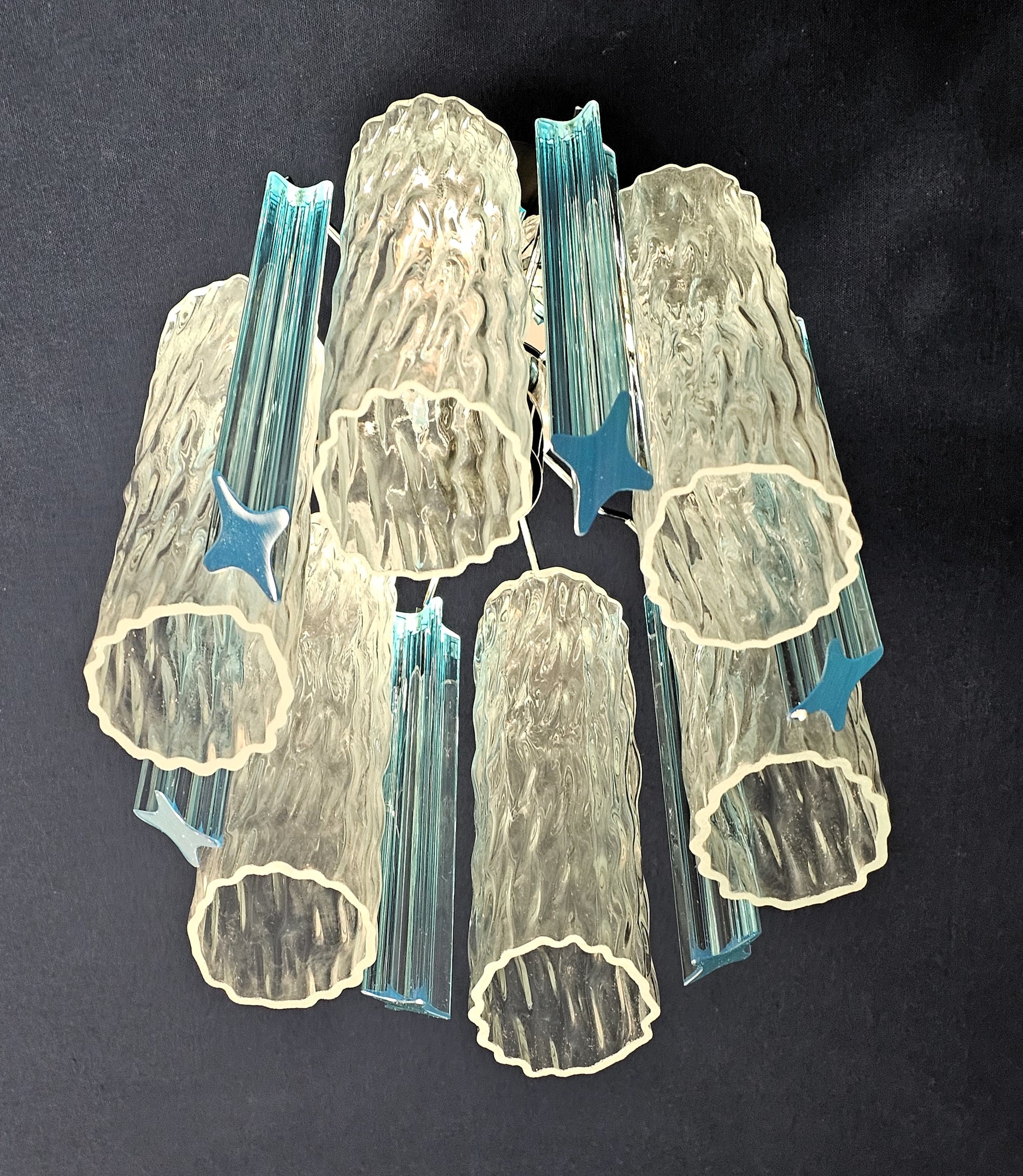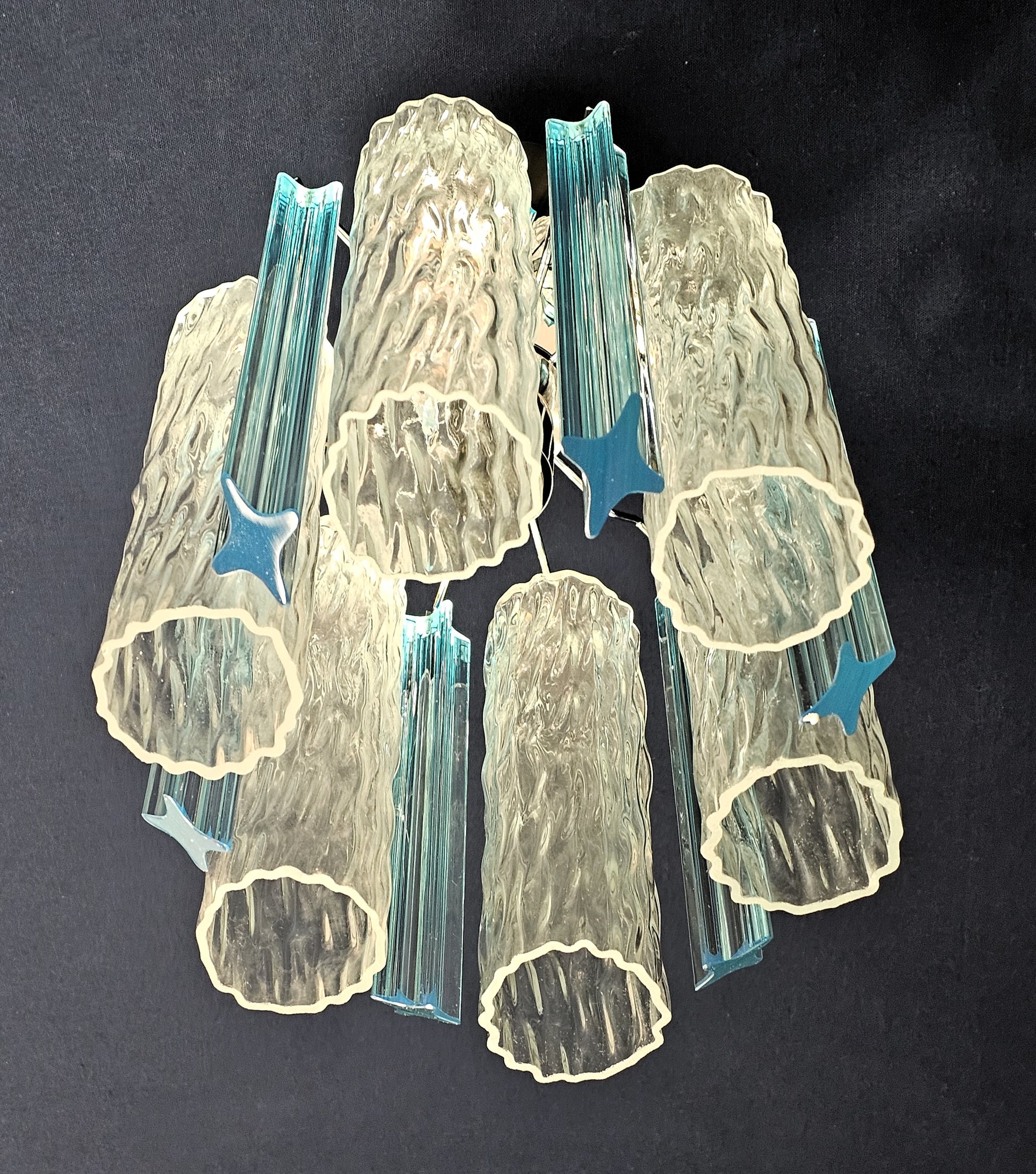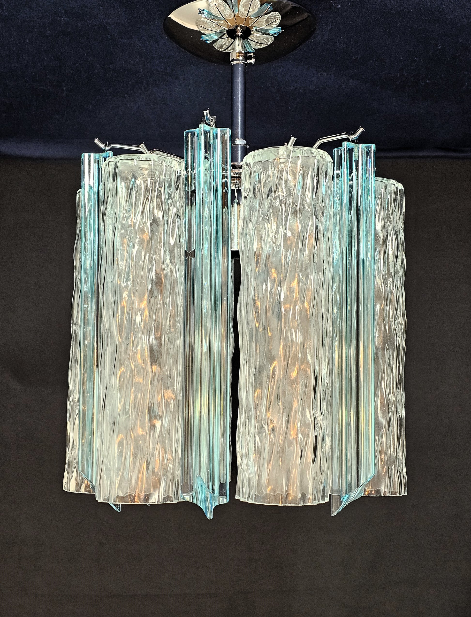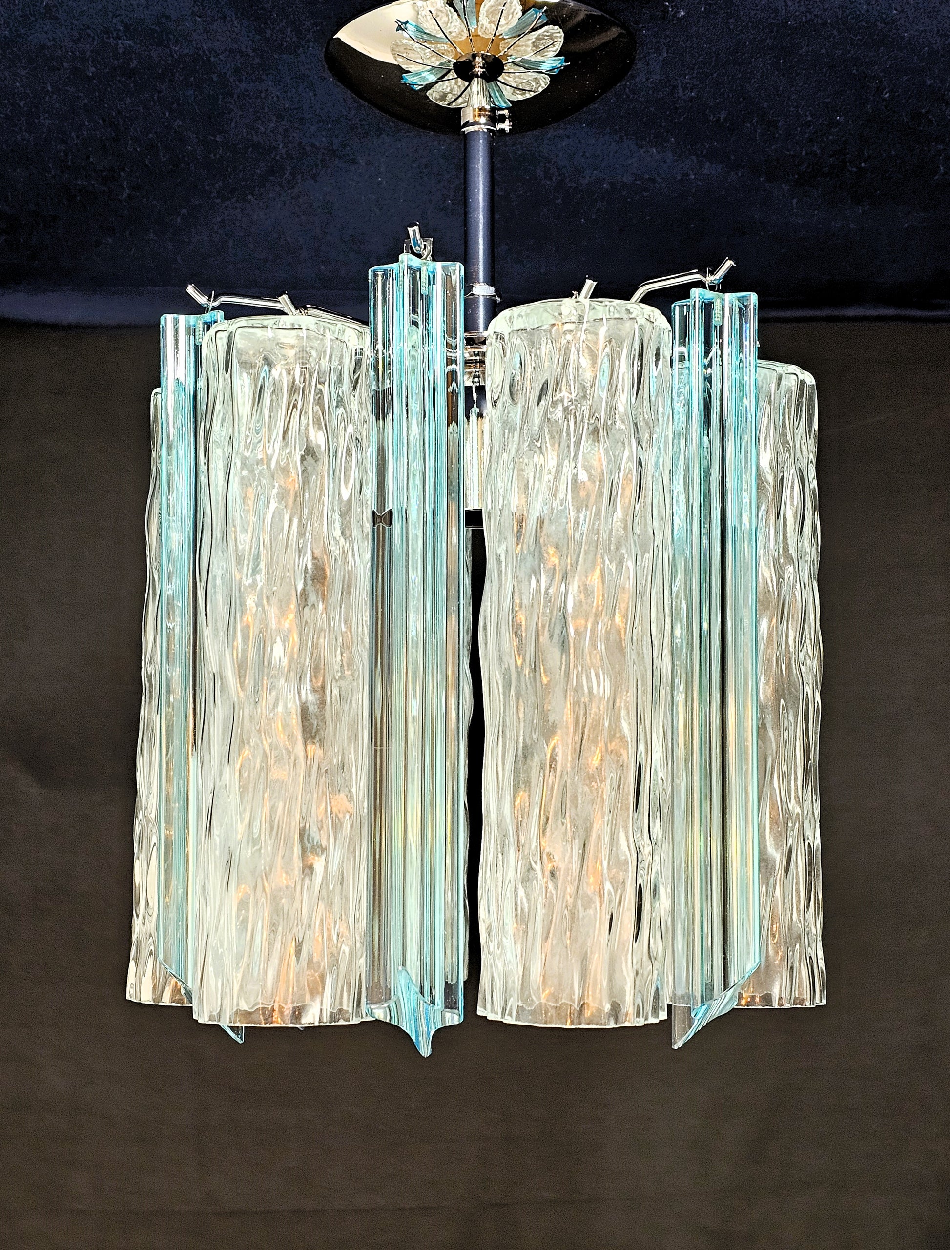 Plafoniera lampada Vintage di Murano, stile Barovier, anni'80. Con due diversi tipi di vetri di Murano, alternati. Sono presenti infatti vetri prismi quadriedri, in cristallo colore azzurro acquamare. E vetri di Murano tubi cilindro, dalla particolare trama increspata, in cristallo. Questa lampada ha un totale di n.12 vetri. Con uno stile che si intreccia tra il moderno e il vintage, questa plafoniera senza tempo si adatta perfettamente a tutti gli ambienti, creando molto design. La finitura del lampadario è cromo lucido, che permette di dare maggiormente risalto al colore azzurro acquamare e cristallo dei due tipi di vetri di Murano. Adattabile a qualsiasi ambiente, si può inserire da solo in piccole stanze, oppure in stanze più grandi si può usare in coppia dello stesso colore, o abbinato all'altra plafoniera della stessa serie, ma di colore cristallo e ambra. Le sue misure sono diametro 30 cm. ed altezza 40 cm. Porta n. 1 lampadina E27. Questa plafoniera è stata inventata ,ideata e creata da noi. E Vi ricordo che tutti i nostri lampadari sono prodotti artigianalmente a mano dai nostri Maestri, presso la nostra fabbrica.