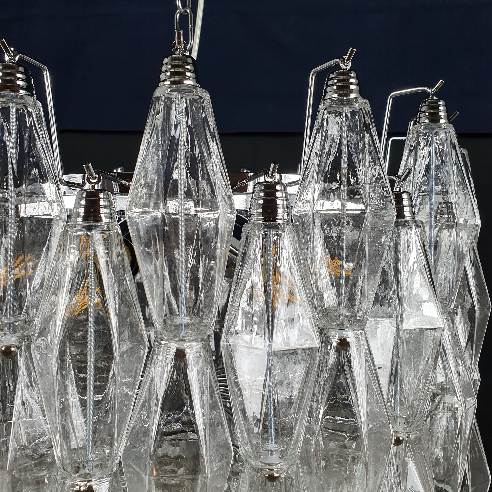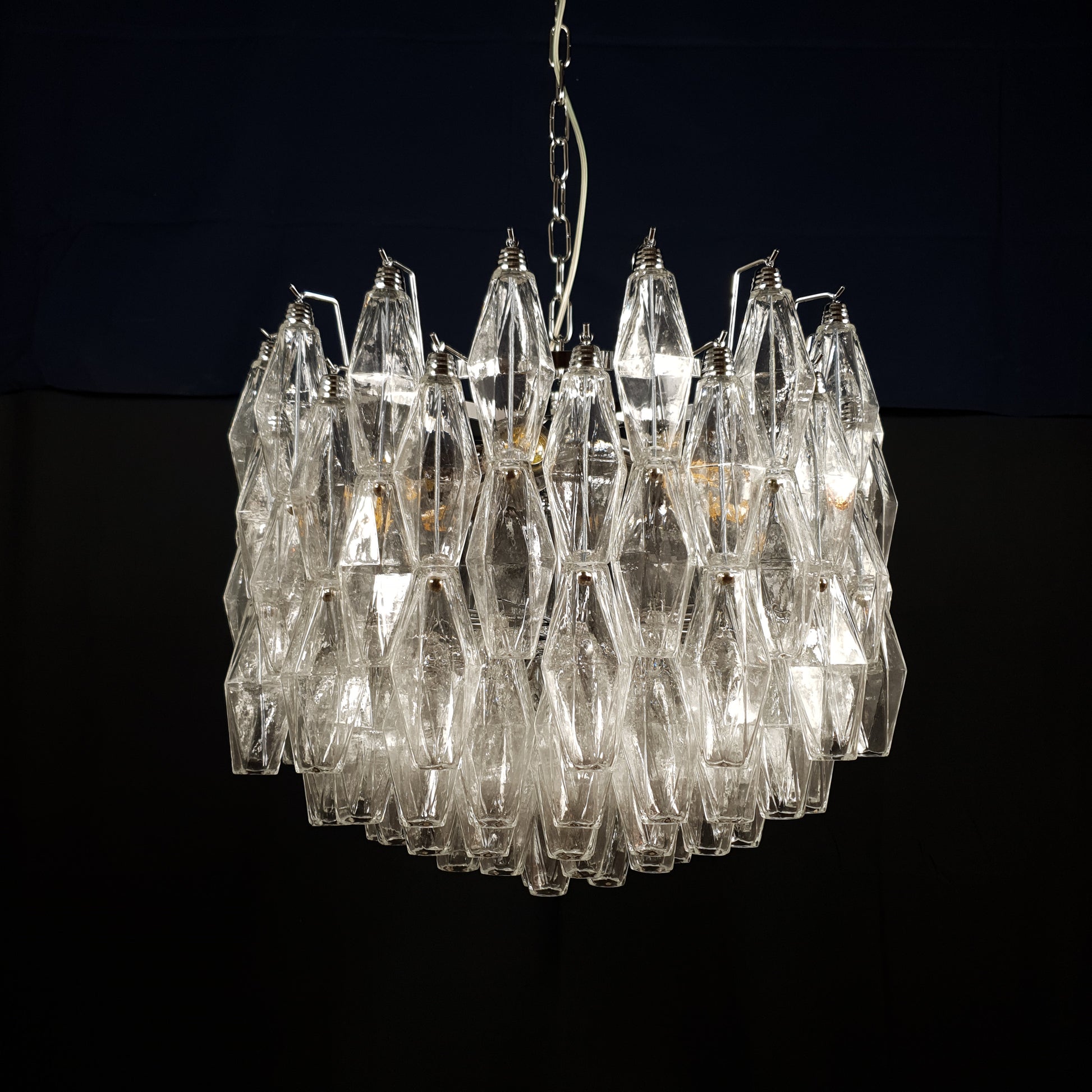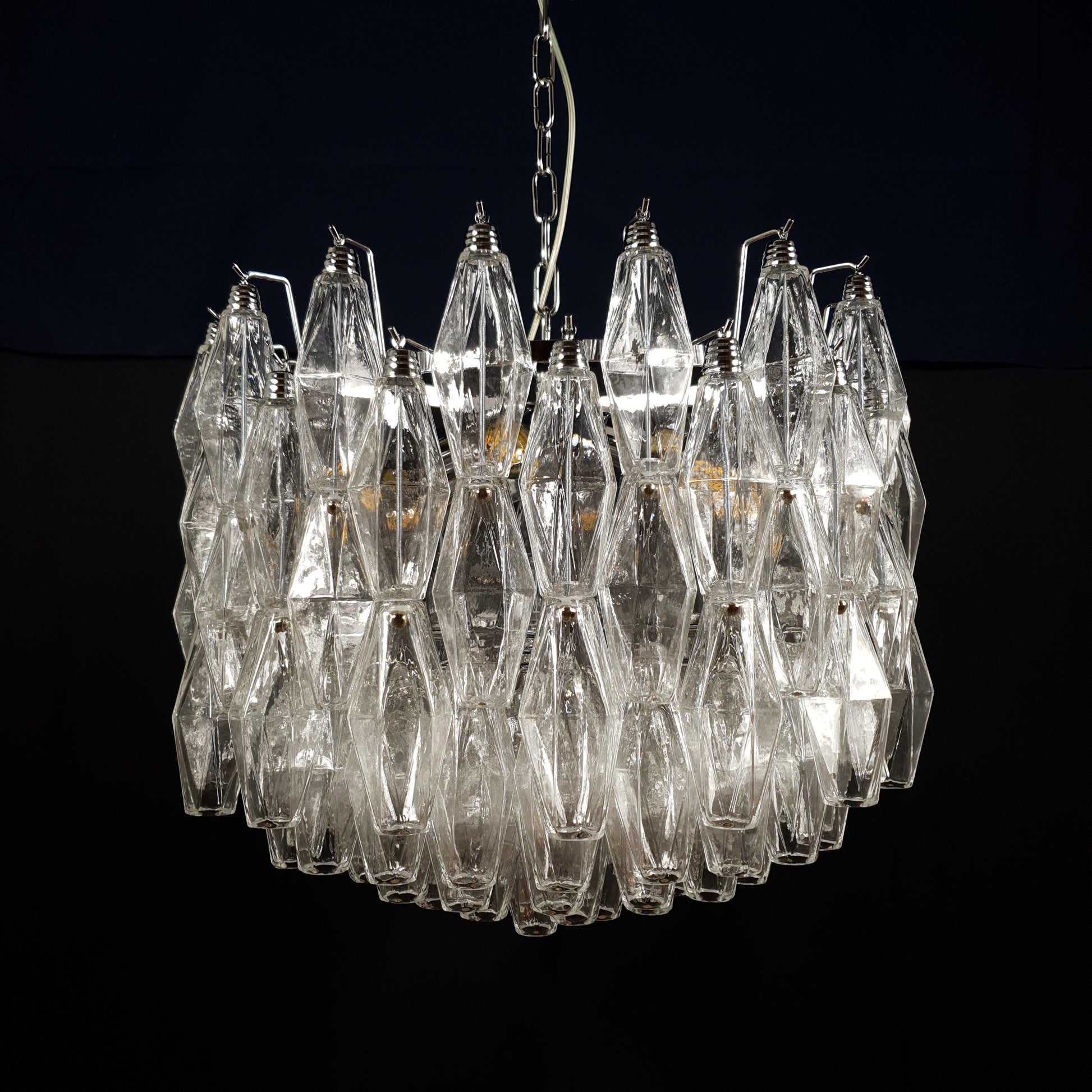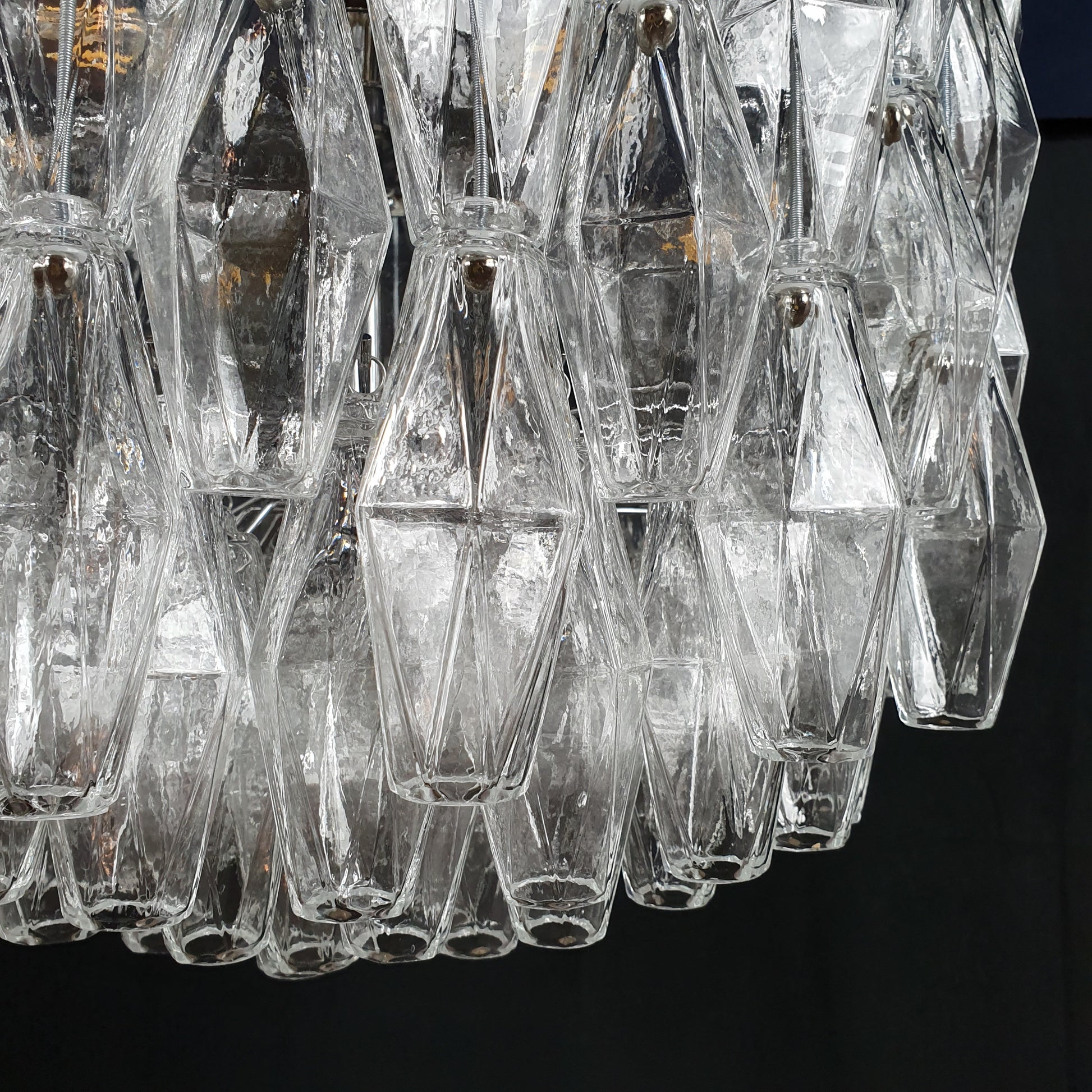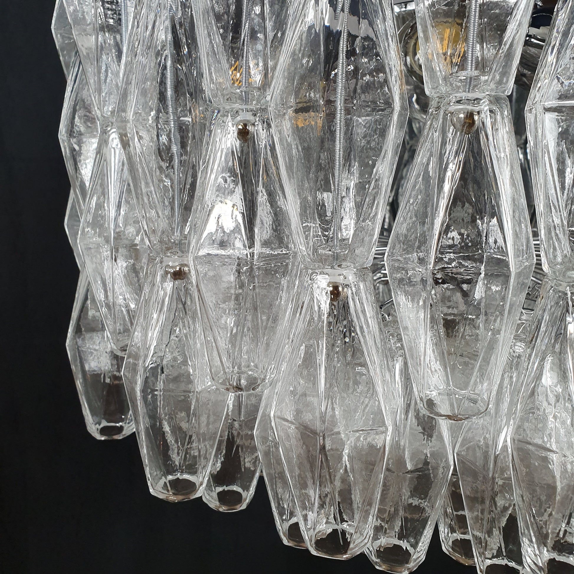Lampadario a poliedri Vintage di Murano. Stile Venini, anni'60. Maestrale lampadario a poliedri, con misure diametro 50 e altezza 40 cm. Finitura cromo lucido. Con vetri poliedri di Murano, soffiati a mano. Perfetto, stiloso, molto materico e fantastico da collocare in ogni stanza. Sorprendente il gioco di luci dovuto alle mille sfaccettature dei vetri. Questo lampadario è stato creato e prodotto dai nostri Maestri presso la nostra azienda. Designed and made in Murano, Italy.