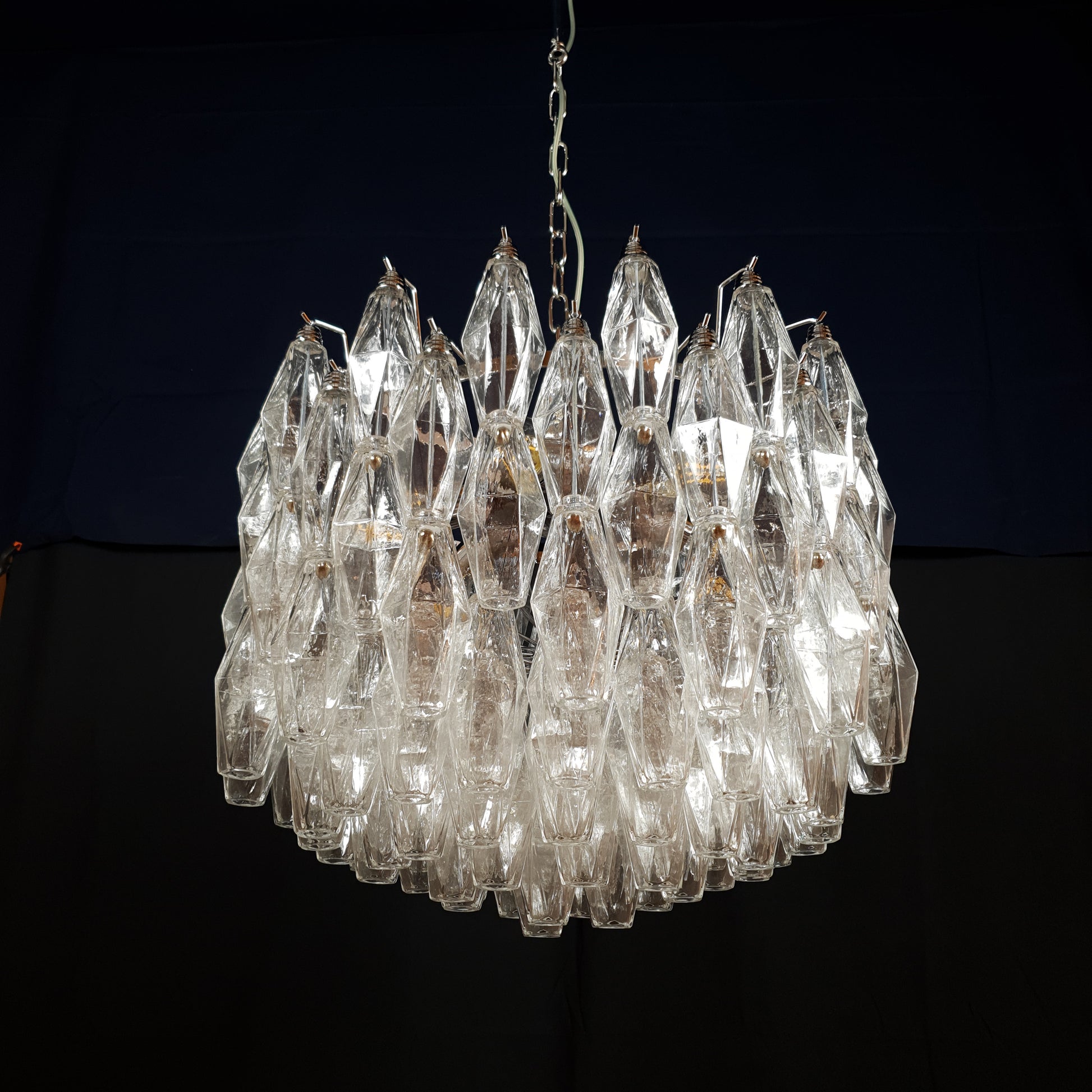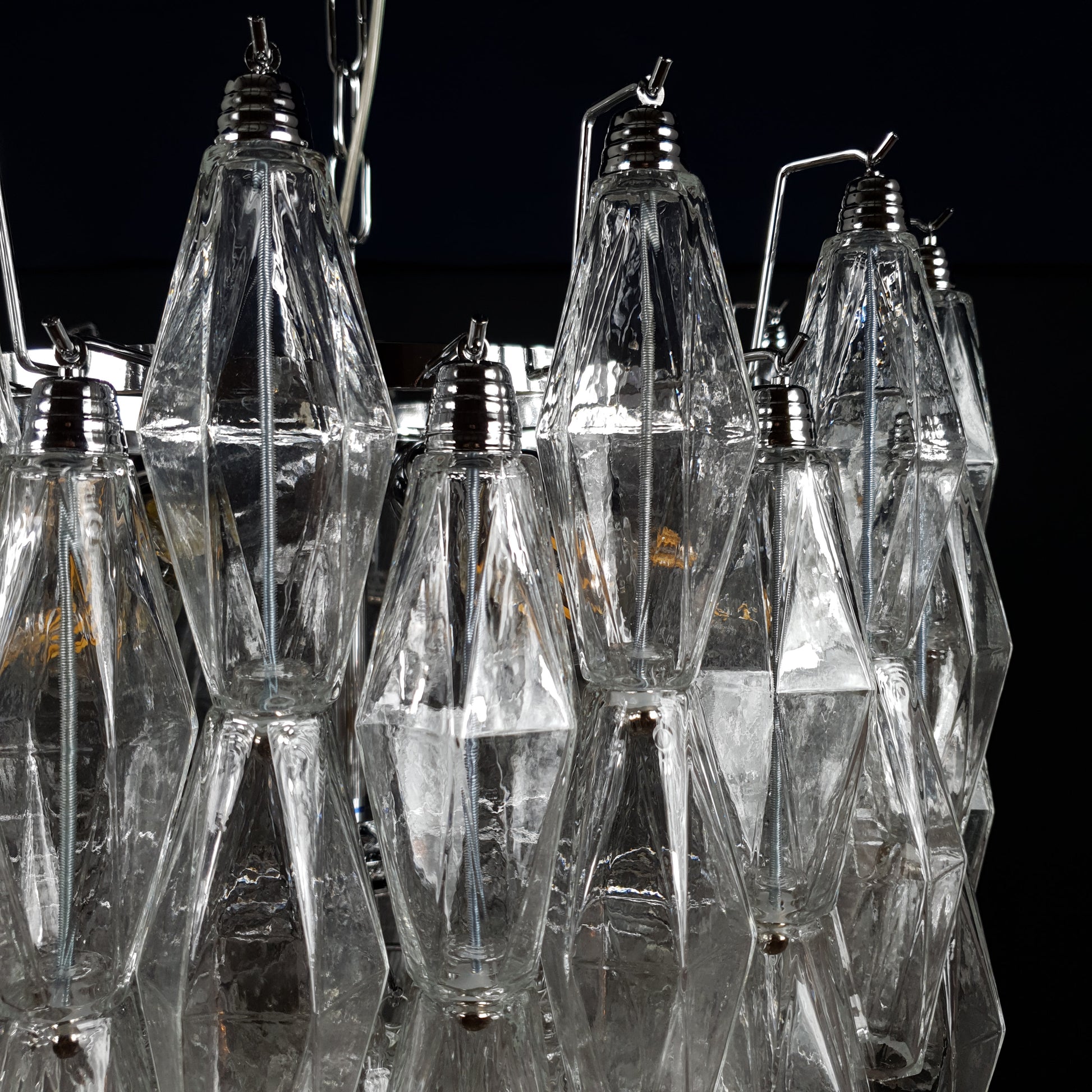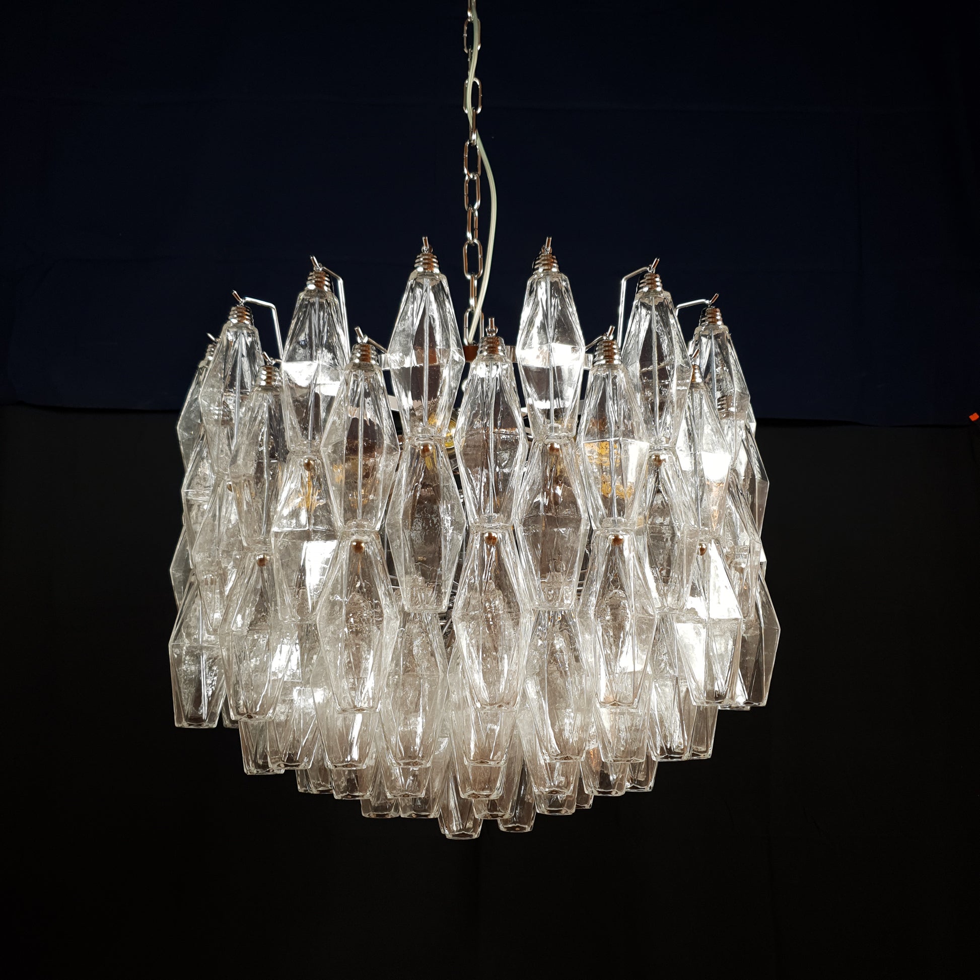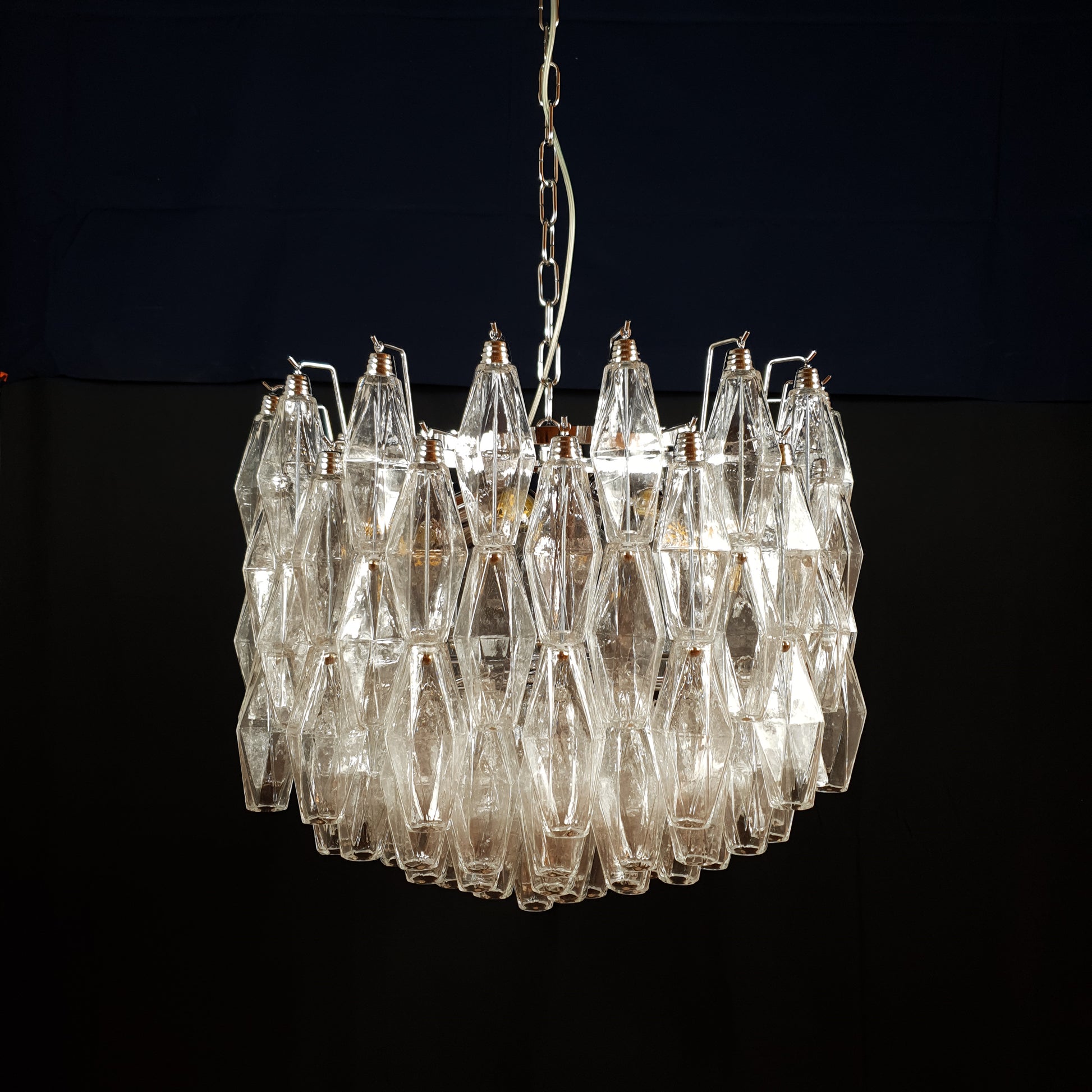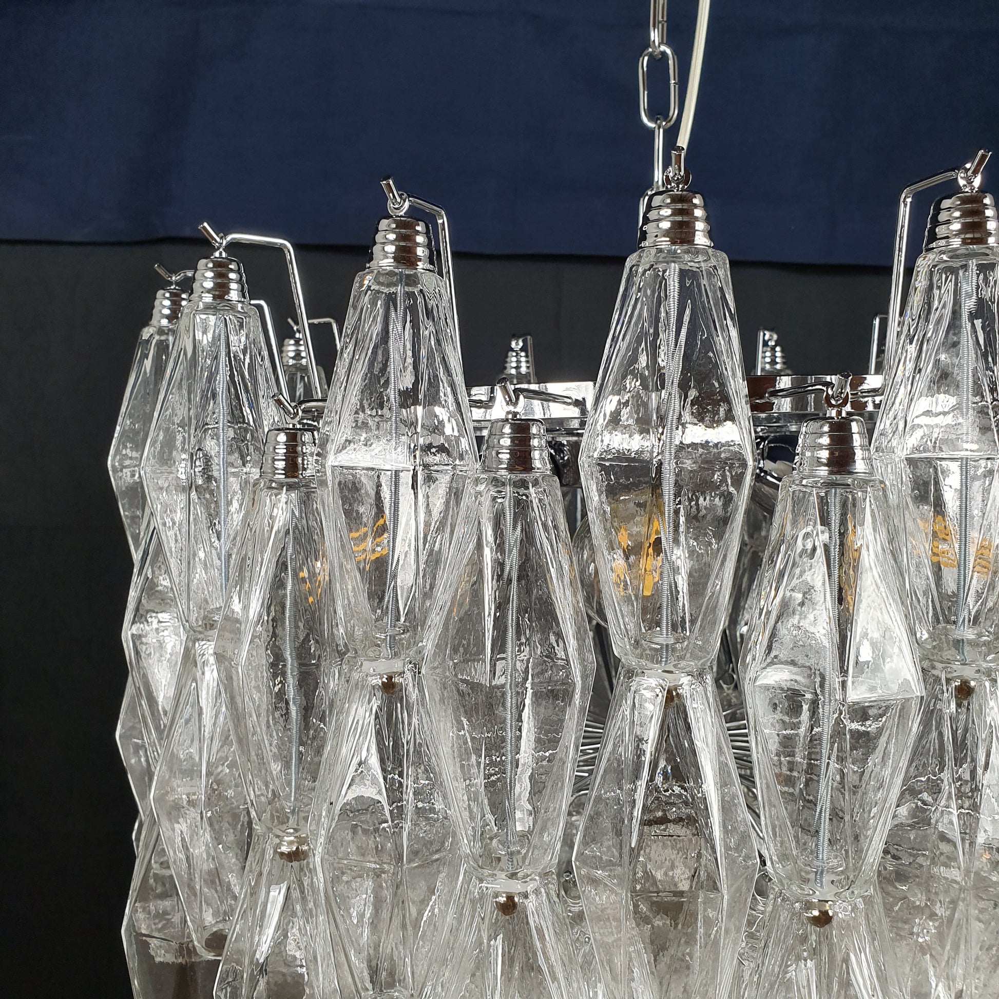 Lampadario a poliedri Vintage di Murano. Stile Venini, anni'60. Maestrale lampadario a poliedri, con misure diametro 50 e altezza 40 cm. Finitura cromo lucido. Con vetri poliedri di Murano, soffiati a mano. Perfetto, stiloso, molto materico e fantastico da collocare in ogni stanza. Sorprendente il gioco di luci dovuto alle mille sfaccettature dei vetri. Questo lampadario è stato creato e prodotto dai nostri Maestri presso la nostra azienda. Designed and made in Murano, Italy.