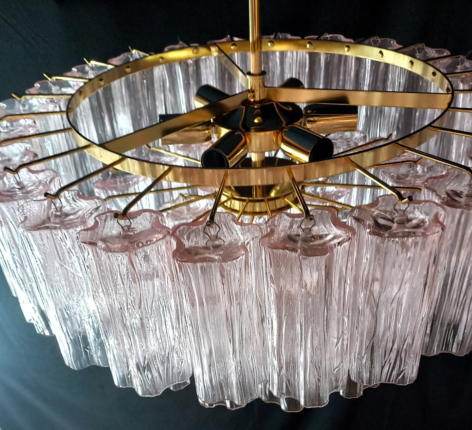 Lampadario a vetri tronchi artigianali, fatti a mano, di Murano, stile Barovier anni'80. Lampadario rotondo a molteplici piani di vetri, molto riempitivo. Con n. 49 vetri di Murano fatti a mano, tutti di colore rosa. I vetri sono lineari, per dare regolatezza e un senso di pace e tranquillità, ma comunque con riflessi di luce molto speciali visti dalle diverse angolazioni. Finitura in oro. Molto materico, riempie la stanza con eleganza e raffinatezza. Con la sua forma riempitiva e completa non riuscirai a smettere di guardarlo dalle mille angolazioni di luce. Visto da sotto è una cascata di vetri che ricordano un bouquet fiorito. Questo lampadario ha diametro 60 cm. ed altezza 53 cm. Porta n. 6 luci E14. Questo lampadario è stato creato e prodotto dai nostri Maestri, nella nostra azienda.