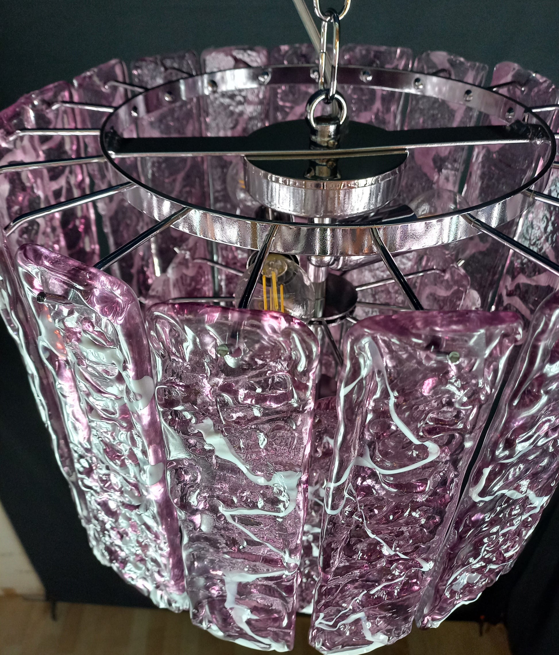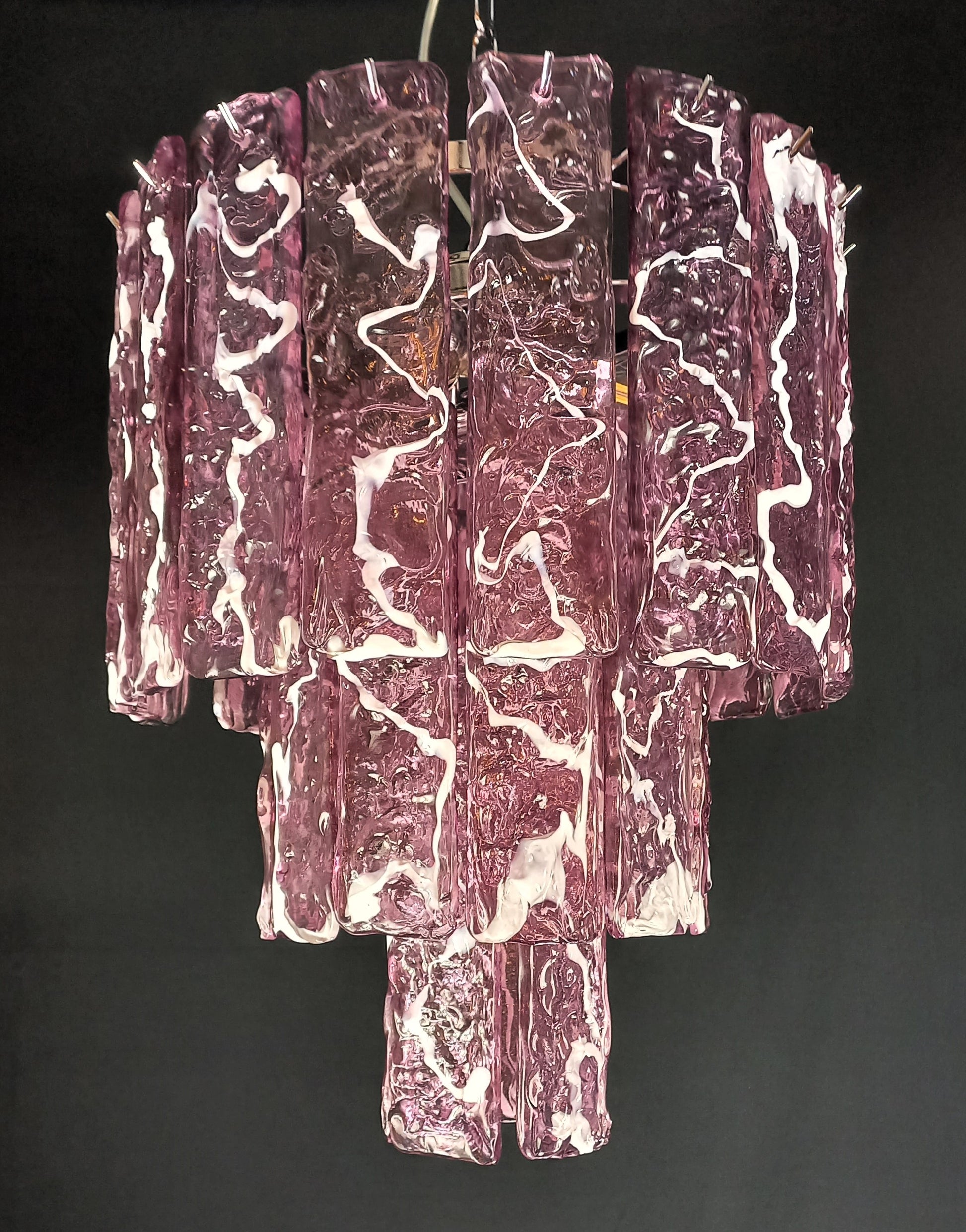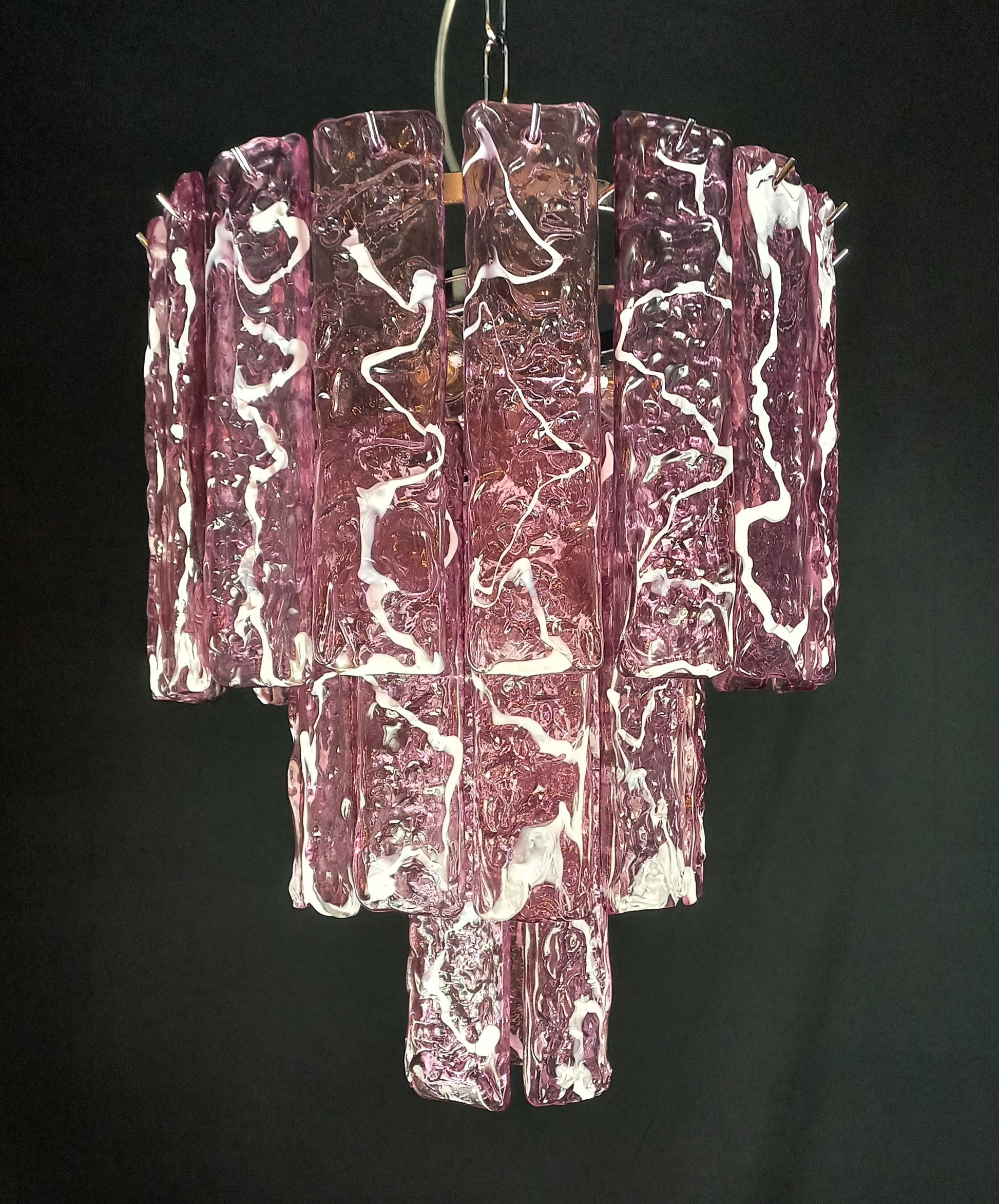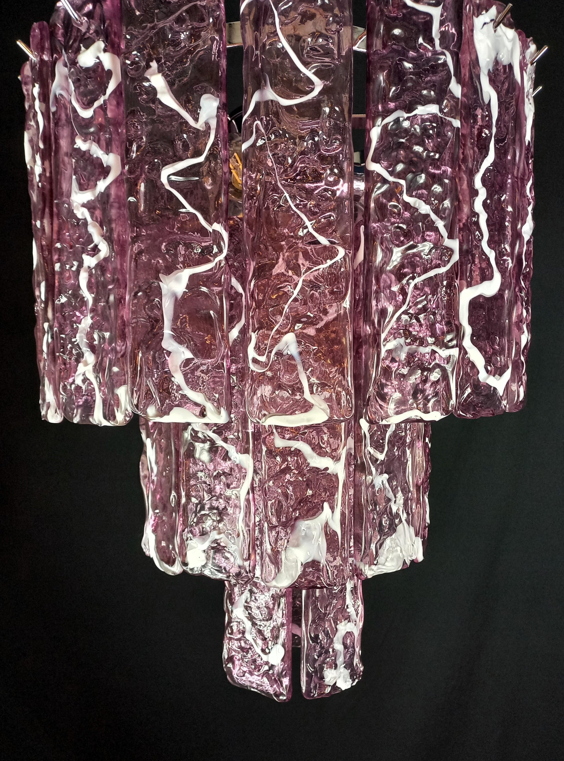Lampadario Vintage di Murano, fatto a mano, stile Murrina. Lampadario colorato ed allegro, adatto ad ogni tipo di stanza, e perfetto anche per essere abbinato ad altri lampadari della stessa linea. Si compone di tre piani di vetri listelli martellato fatti a mano, in cristallo colore ametista con anima bianca, molto particolari e lavorati con una trama che regala increspature e giochi di luce. Questo lampadario porta n. 35 vetri listelli di Murano, fatti a mano. Finitura cromo lucido. Riempie le vostre stanze e case con eleganza e raffinatezza. Questo lampadario ha diametro 40 cm. ed altezza 48 cm. Porta n. 4 luci E14. Questo lampadario è stato creato e prodotto dai nostri Maestri, nella nostra azienda.