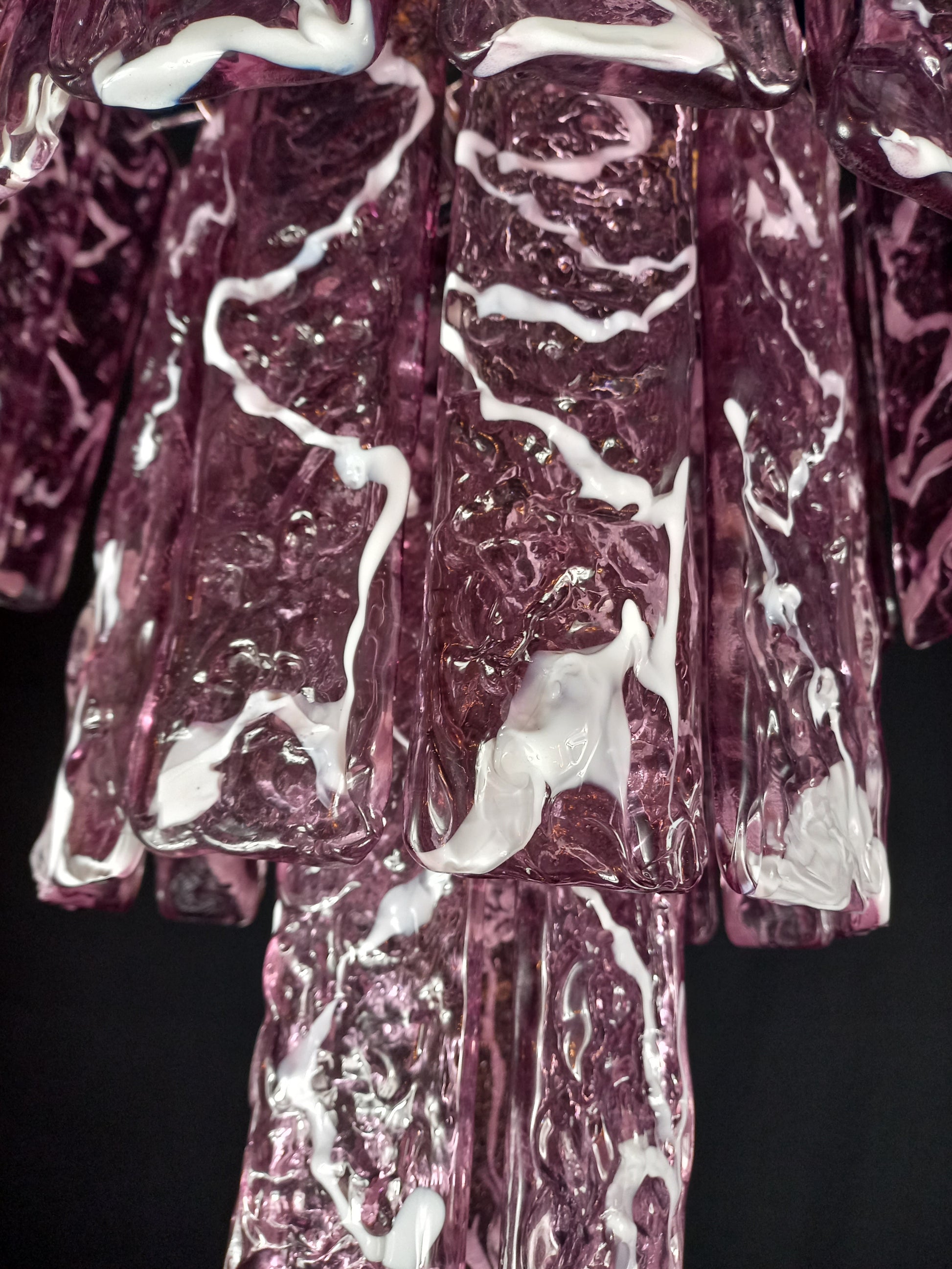 Lampadario art dèco Murano stile Murrina con Vetri di Murano listelli martellato, fatti a mano, cristallo ametista bianca. Designed and made in Murano, Italy.