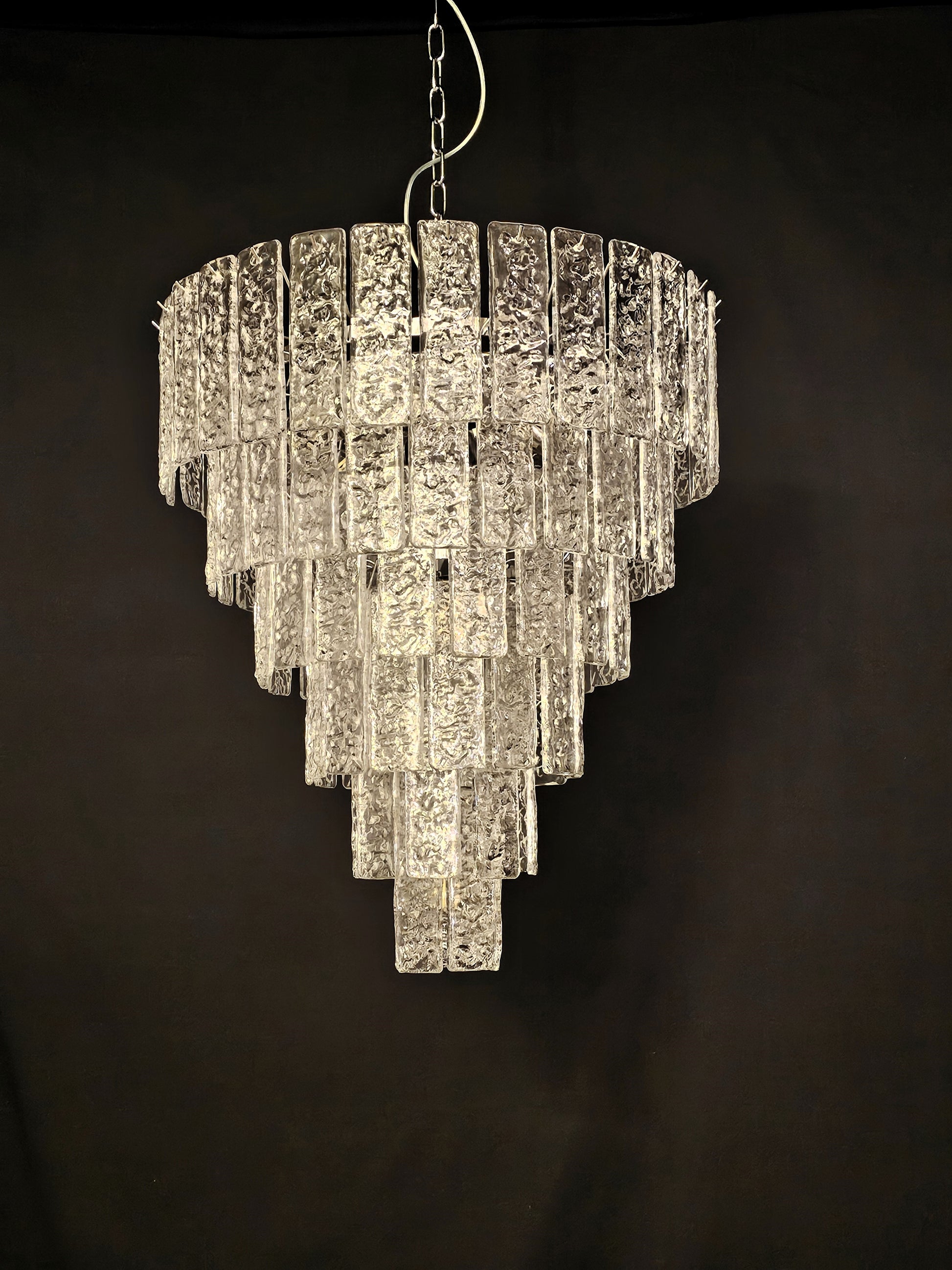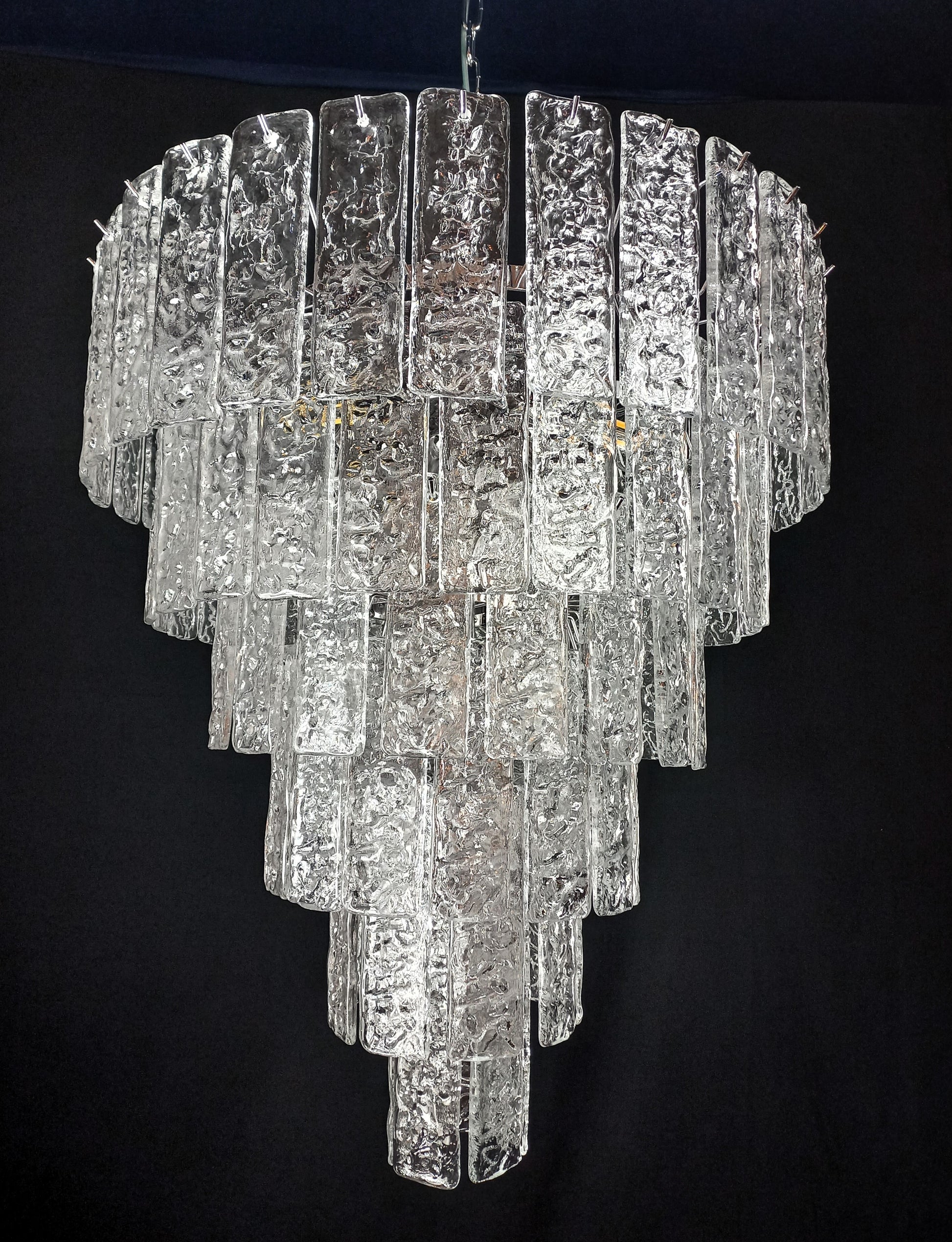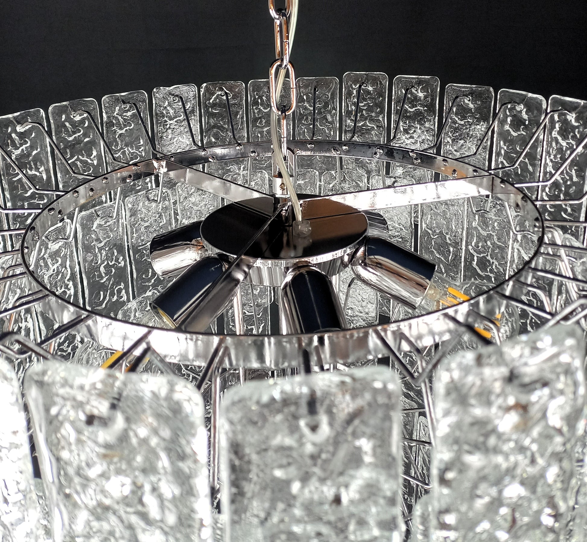 Lampadario artigianale di Murano, stile Murrina, anni'90. Lampadario con particolarissimi vetri listello in cristallo con trama martellata. Adatto ad ogni tipo di stanza e anche ad essere abbinato ad altri lampadari più piccoli, ma della stessa linea. Si compone di sei piani di vetri listelli cristallo, molto particolari e lavorati con una trama che regala increspature e giochi di luce. Questo lampadario porta n. 102 vetri listelli di Murano fatti a mano, ed è Adatto anche a stanze di grandi metrature. Finitura cromo lucido. Riempie la stanza con eleganza e raffinatezza. Questo lampadario ha diametro 65 cm. ed altezza 75 cm. Porta n. 9 luci E27 + n. 1 luce E14. Questo lampadario è stato creato e prodotto dai nostri Maestri, nella nostra azienda.
