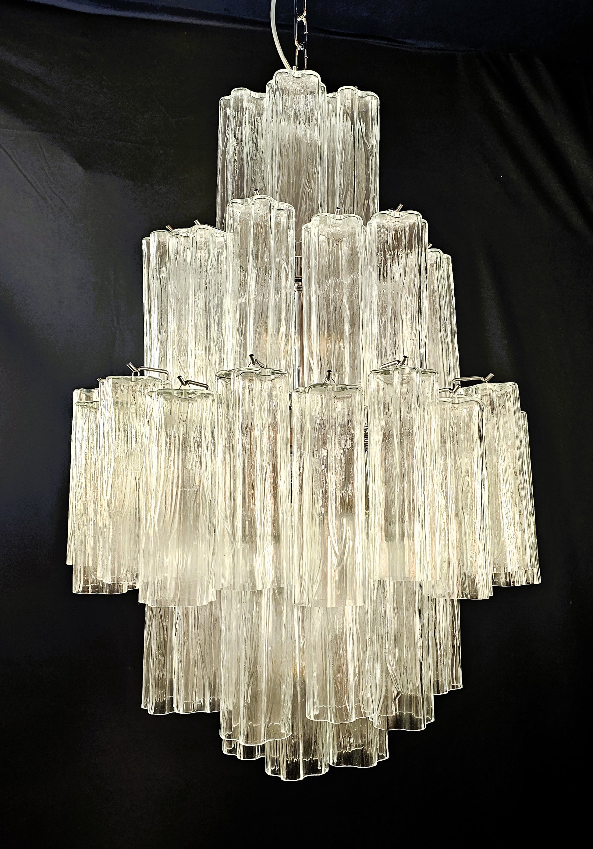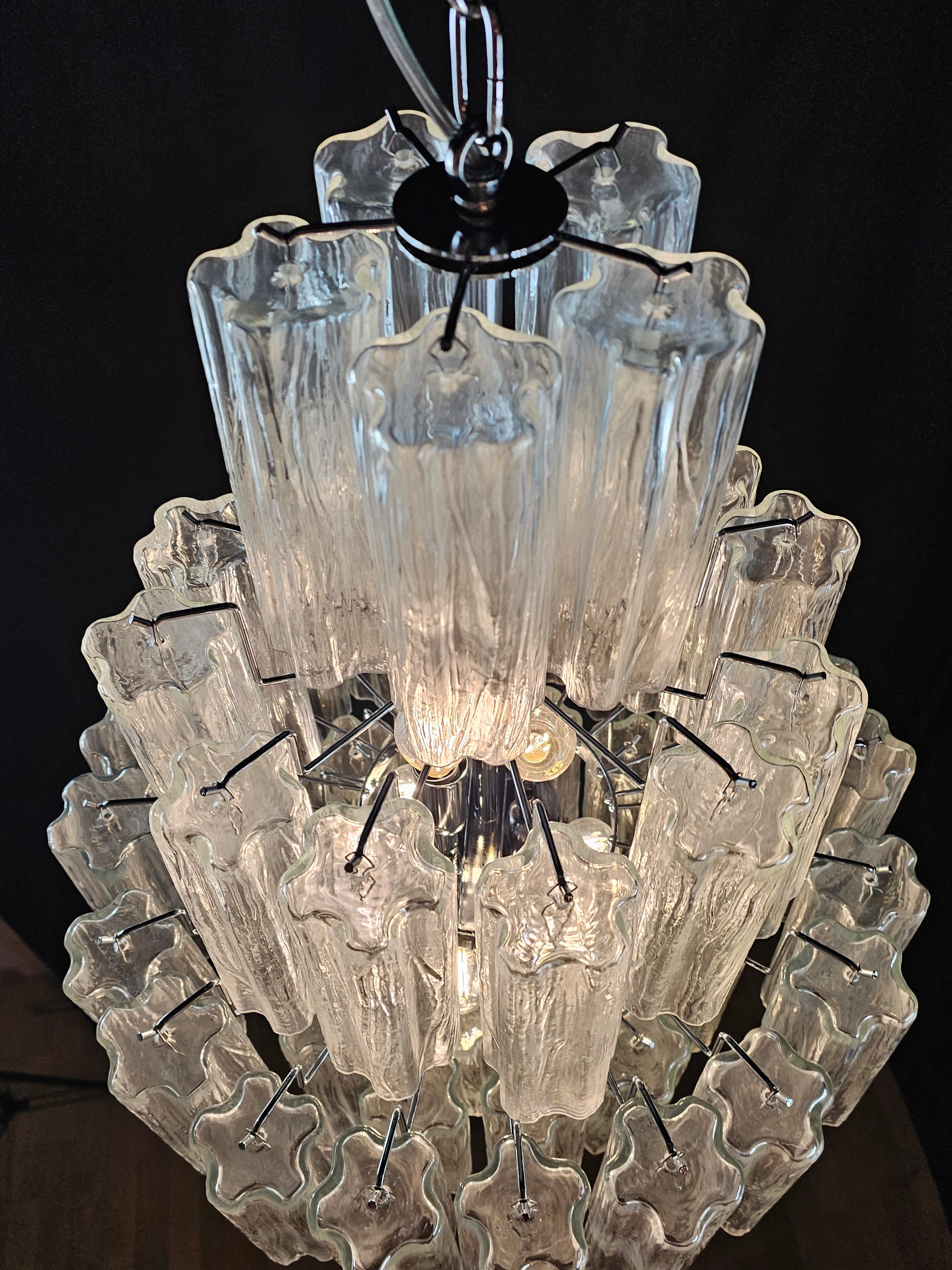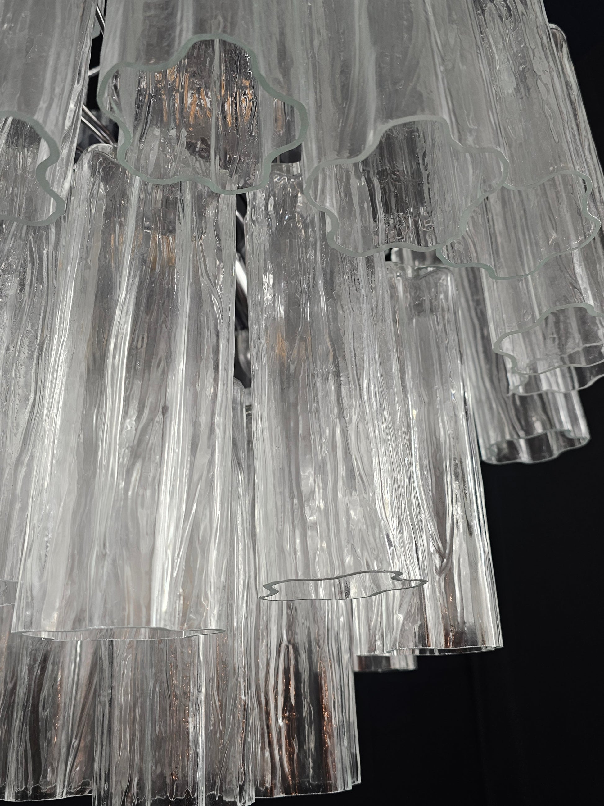 Lampadario fatto a mano di Murano, stile Barovier ispirato agli anni'80. Lampadario a molteplici piani di vetri, dalla caratteristica forma che qui a Murano chiamiamo "forma a pero". Con un totale di n. 54 vetri tronchi di Murano fatti a mano, in cristallo. I vetri sono alternati e non lineari, per dare movimento e riflessi di luce al lampadario dalle diverse angolazioni. Finitura cromo lucido. Molto materico, riempie la stanza con eleganza e raffinatezza. Con la sua forma riempitiva e completa non riuscirai a smettere di guardarlo dalle mille angolazioni di luce. Visto da sotto è una cascata di vetri che ricordano un bouquet fiorito. Questo lampadario ha diametro 55 cm. ed altezza 80 cm. Porta n. 6 luci E14. Questo lampadario è stato creato e prodotto dai nostri Maestri nella nostra azienda.