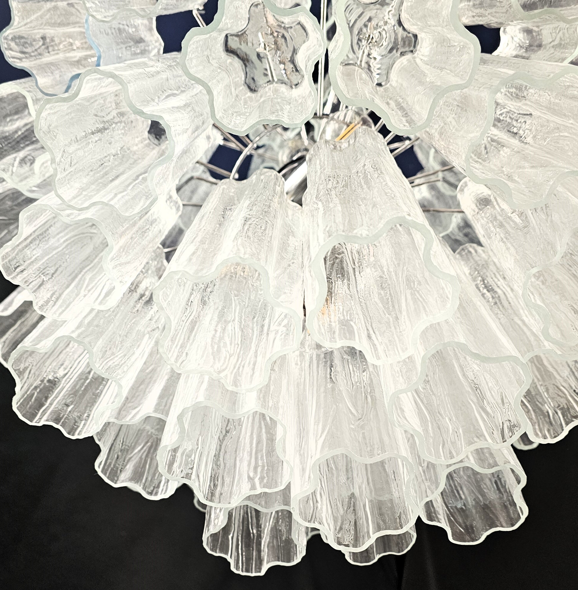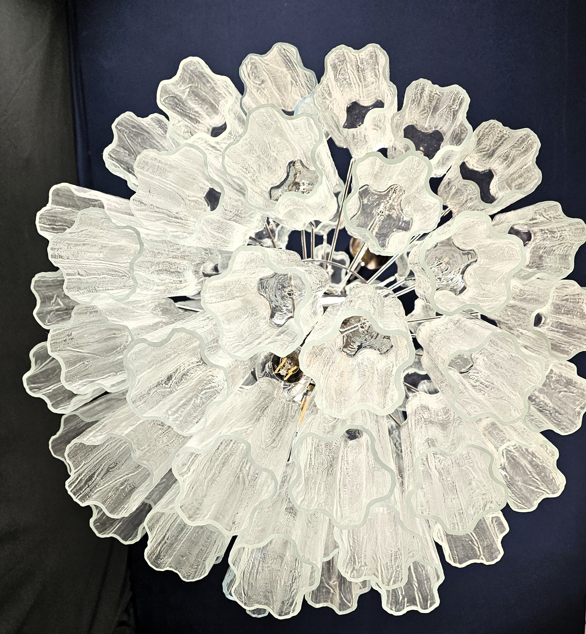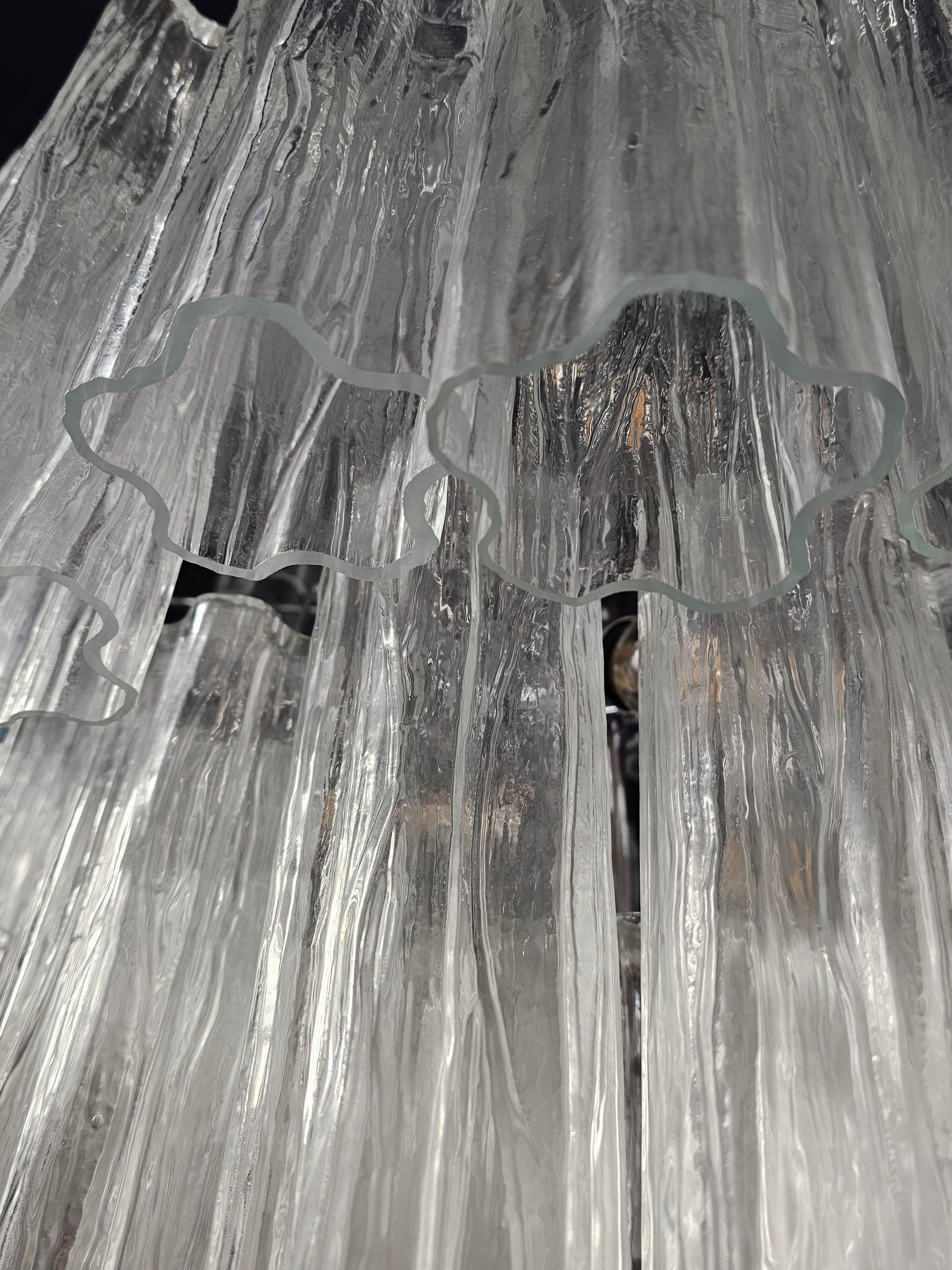 Lampadario fatto a mano di Murano, stile Barovier ispirato agli anni'80. Lampadario a molteplici piani di vetri, dalla caratteristica forma che qui a Murano chiamiamo "forma a pero". Con un totale di n. 54 vetri tronchi di Murano fatti a mano, in cristallo. I vetri sono alternati e non lineari, per dare movimento e riflessi di luce al lampadario dalle diverse angolazioni. Finitura cromo lucido. Molto materico, riempie la stanza con eleganza e raffinatezza. Con la sua forma riempitiva e completa non riuscirai a smettere di guardarlo dalle mille angolazioni di luce. Visto da sotto è una cascata di vetri che ricordano un bouquet fiorito. Questo lampadario ha diametro 55 cm. ed altezza 80 cm. Porta n. 6 luci E14. Questo lampadario è stato creato e prodotto dai nostri Maestri nella nostra azienda.
