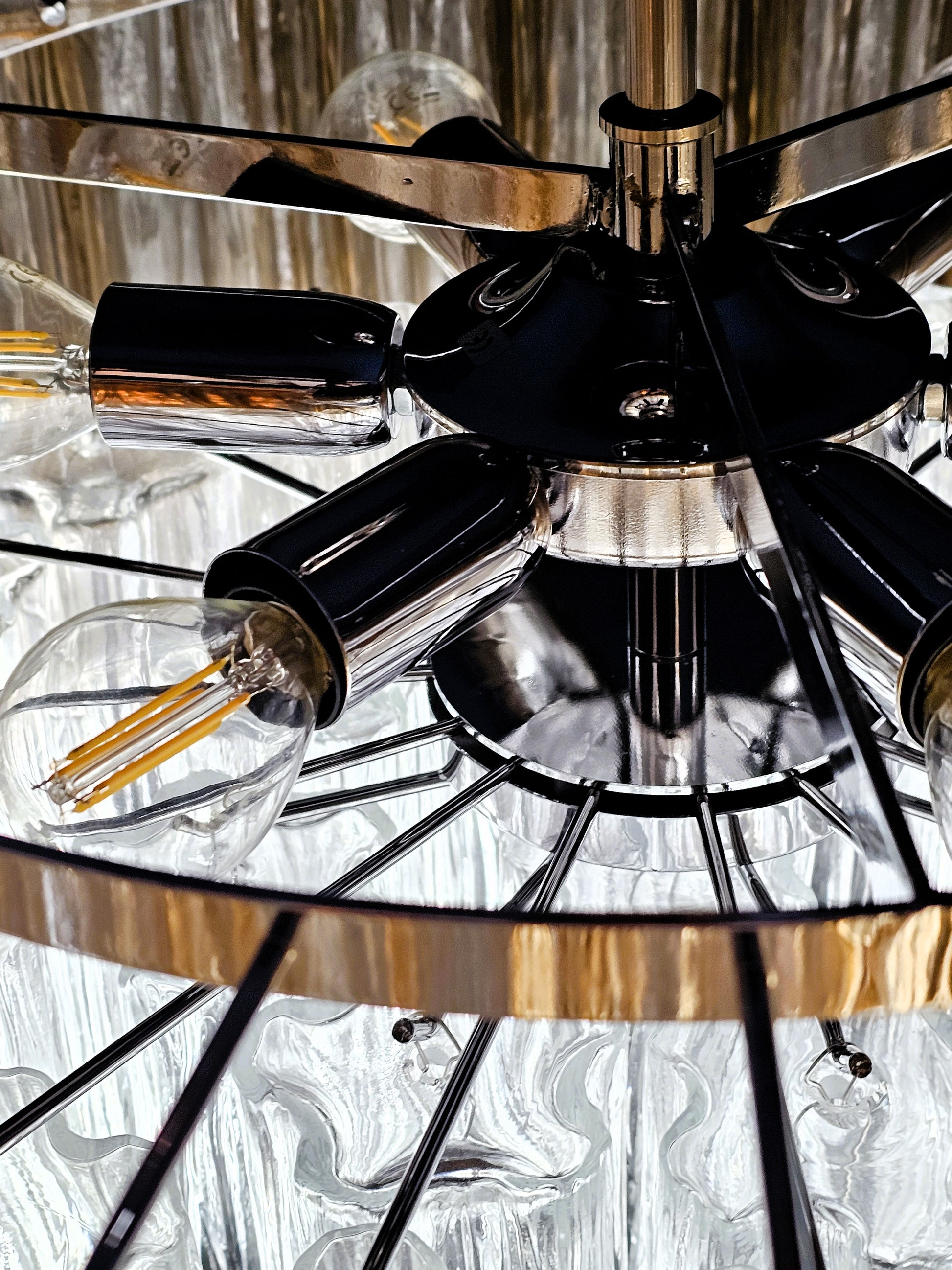 Lampadario Vintage Murano, stile Barovier, anni'80. Lampadario rotondo a molteplici piani di vetri, molto riempitivo. Con un totale di n. 49 vetri di Murano fatti a mano, in cristallo e fumè. Il giro di vetri esterni, ovvero il più largo, è composto tutto di vetri colore fumè. Il resto dei vetri invece sono in cristallo. I vetri sono lineari, per dare regolatezza e un senso di pace e tranquillità, ma comunque con riflessi di luce molto speciali visti dalle diverse angolazioni. Finitura cromo lucido. Molto materico, riempie la stanza con eleganza e raffinatezza. Con la sua forma riempitiva e completa non riuscirai a smettere di guardarlo dalle mille angolazioni di luce. Visto da sotto è una cascata di vetri che ricordano un bouquet fiorito. Questo lampadario ha diametro 60 cm. ed altezza 53 cm. Porta n. 6 luci E14. Questo lampadario è stato creato e prodotto dai nostri Maestri nella nostra azienda. Potete visionare il video del lampadario per gustarvi l'anteprima.