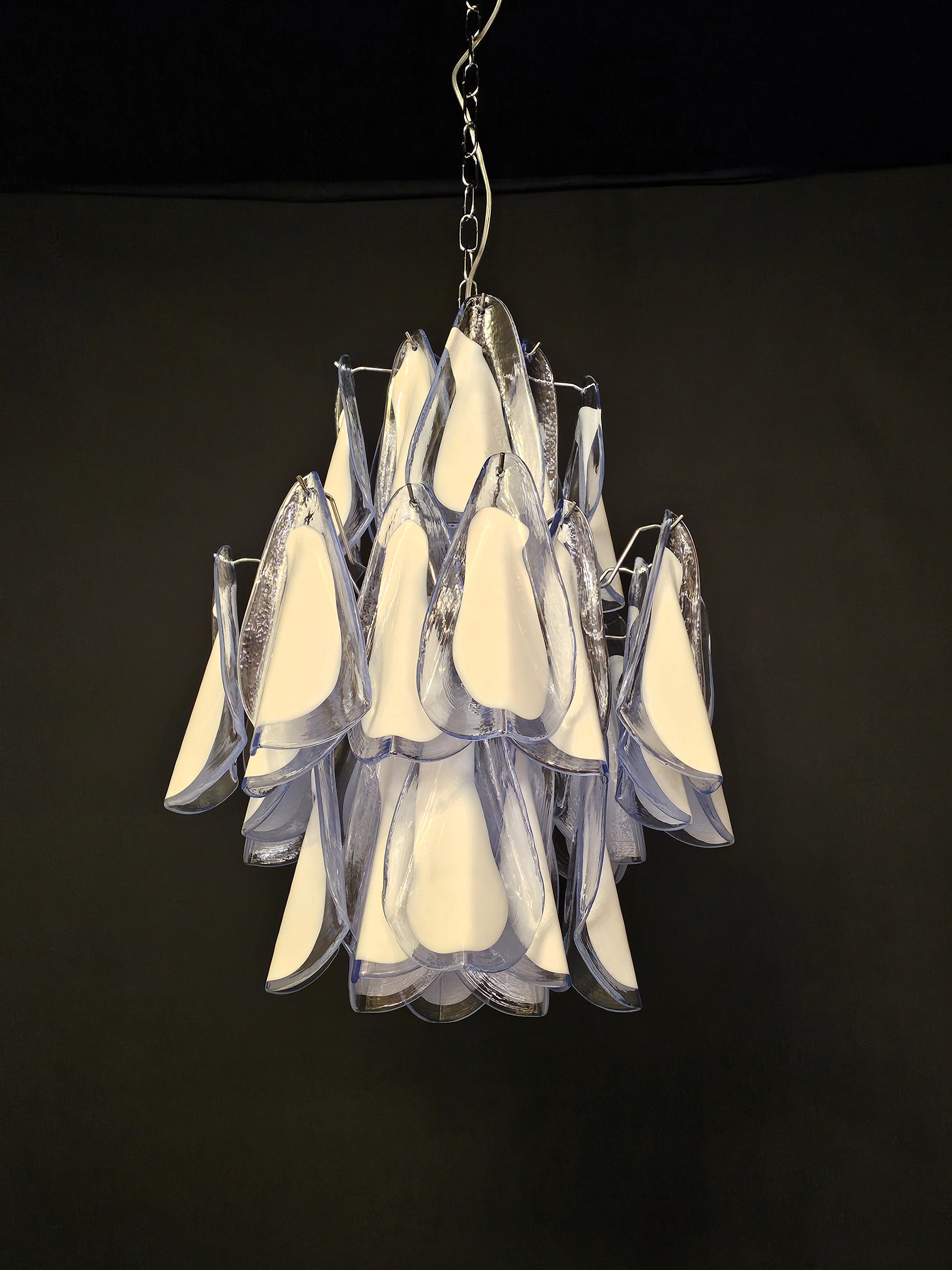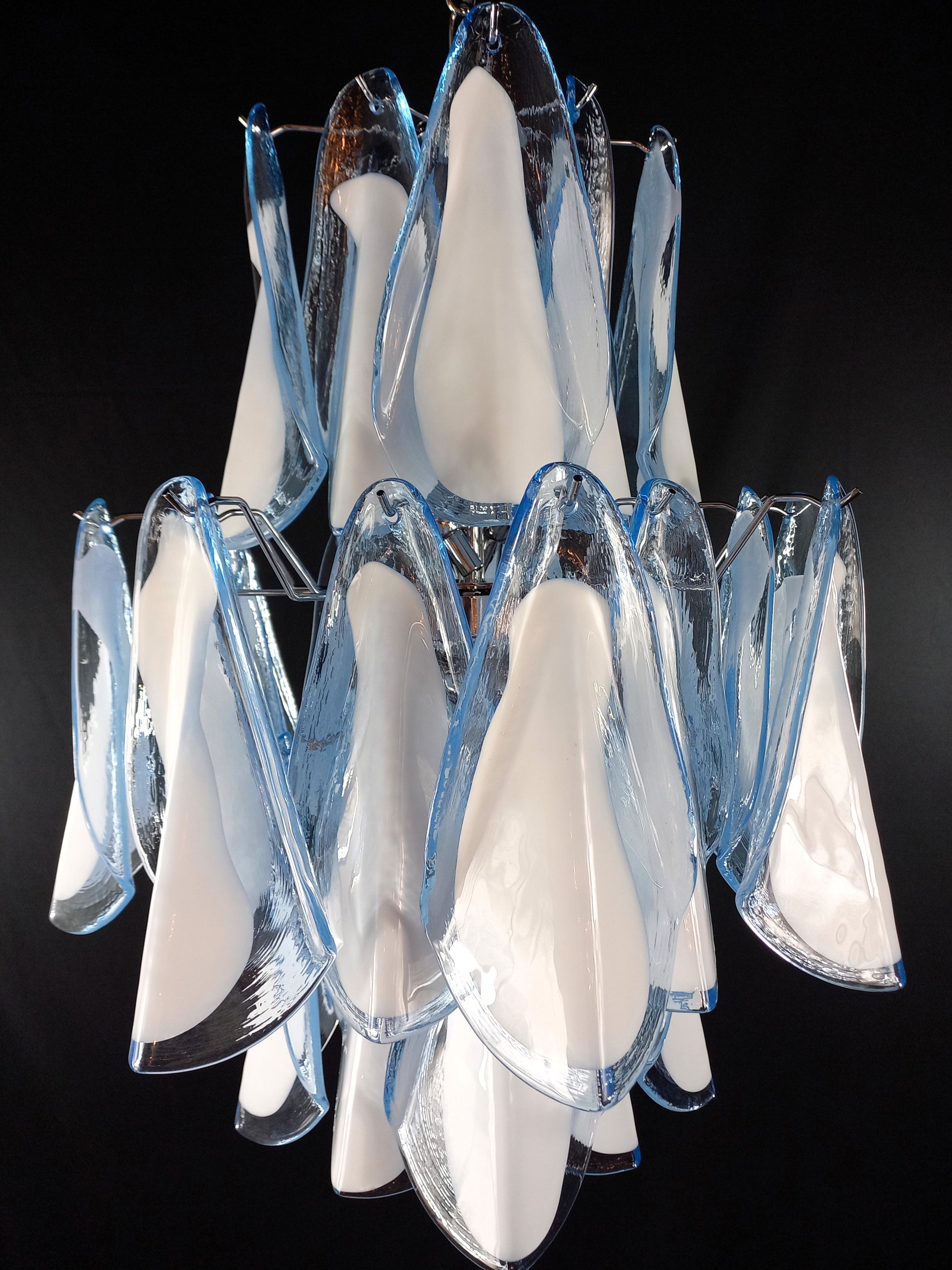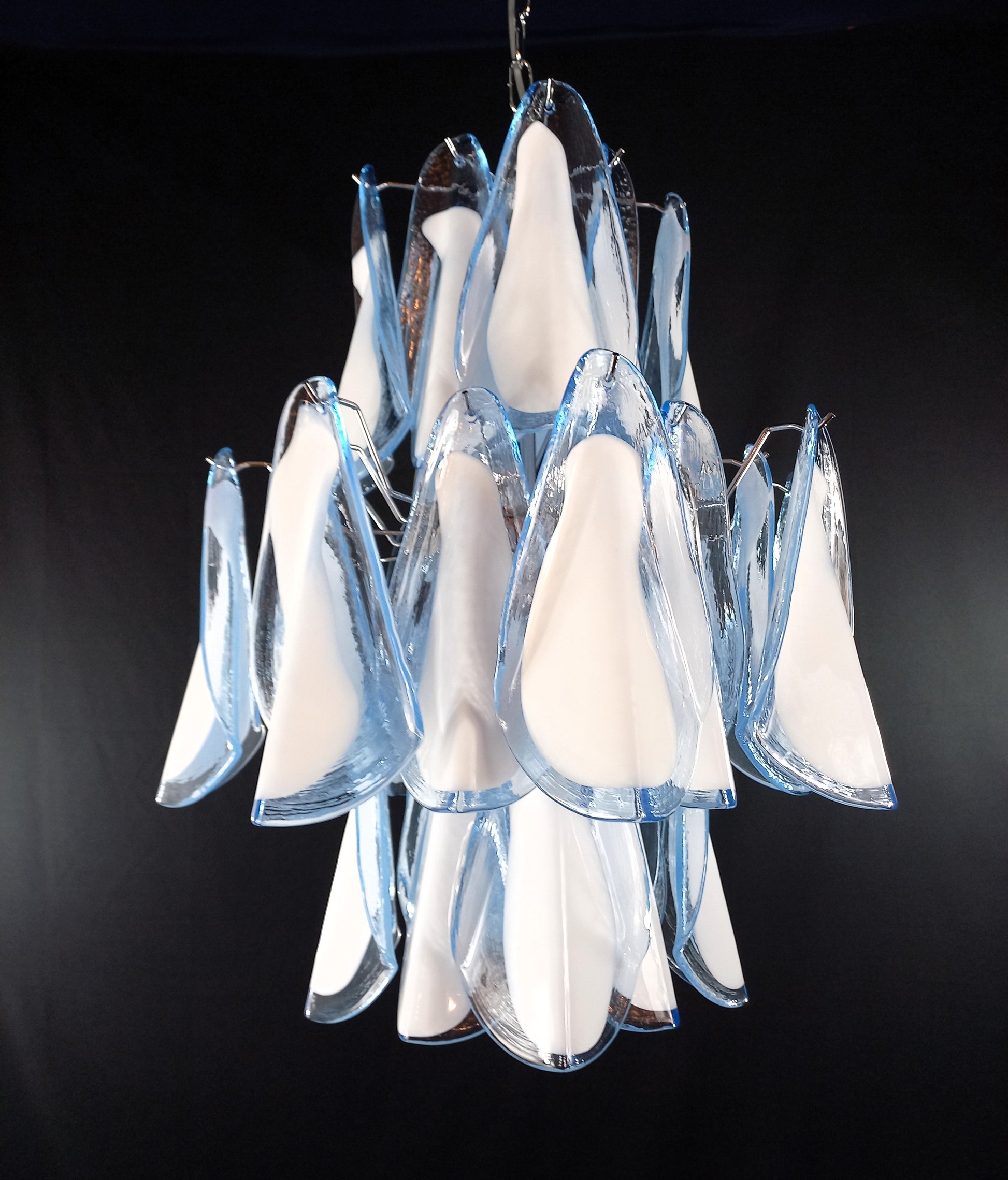 Lampadario di Murano stile Impero, artigianale e con vetri fatti a mano. Lampadario a stile Impero come lo definiamo qui a Murano, con molteplici piani di vetri, molto riempitivo. Con vetri che ricordano la forma della Rondine, cristallo di colore azzurro con anima bianco latte. Questo lampadario porta n. 32 vetri di Murano e ha riflessi di luce molto speciali visti dalle diverse angolazioni. I vetri rondine azzurri bianchi regalano un senso di primavera e libertà. Finitura in un bellissimo cromo lucido, molto elegante. Raffinato ed esclusivo, riempie la stanza con fascino. Con la sua forma riempitiva e completa non riuscirai a smettere di guardarlo dalle mille angolazioni di luce. Il lampadario visto da sotto è una cascata di vetri che ricordano uno stormo di rondini in volo. Questo lampadario ha diametro 50 cm. ed altezza 60 cm. Porta n. 5 luci E14. Questo lampadario è stato creato e prodotto dai nostri Maestri nella nostra azienda.
