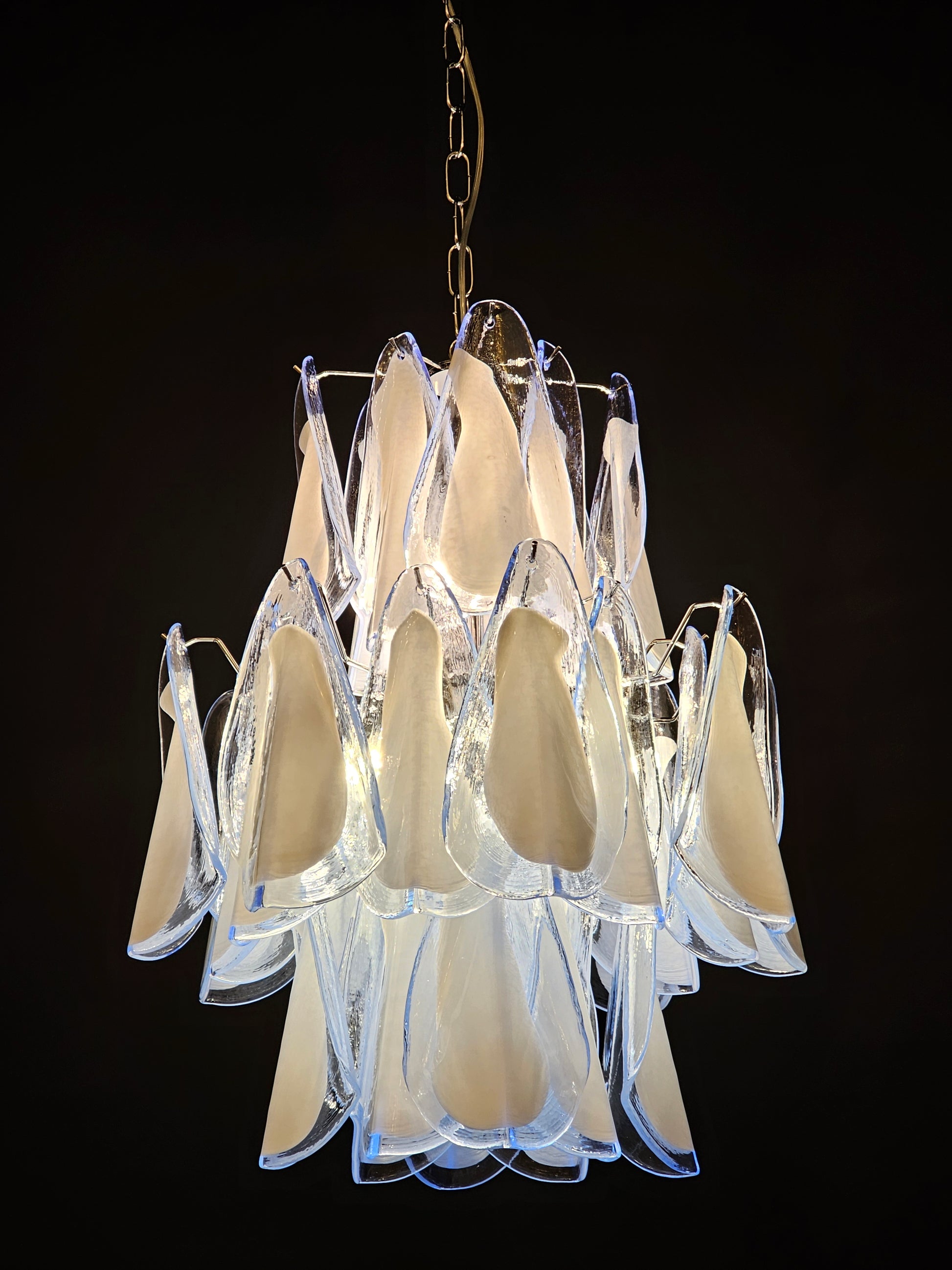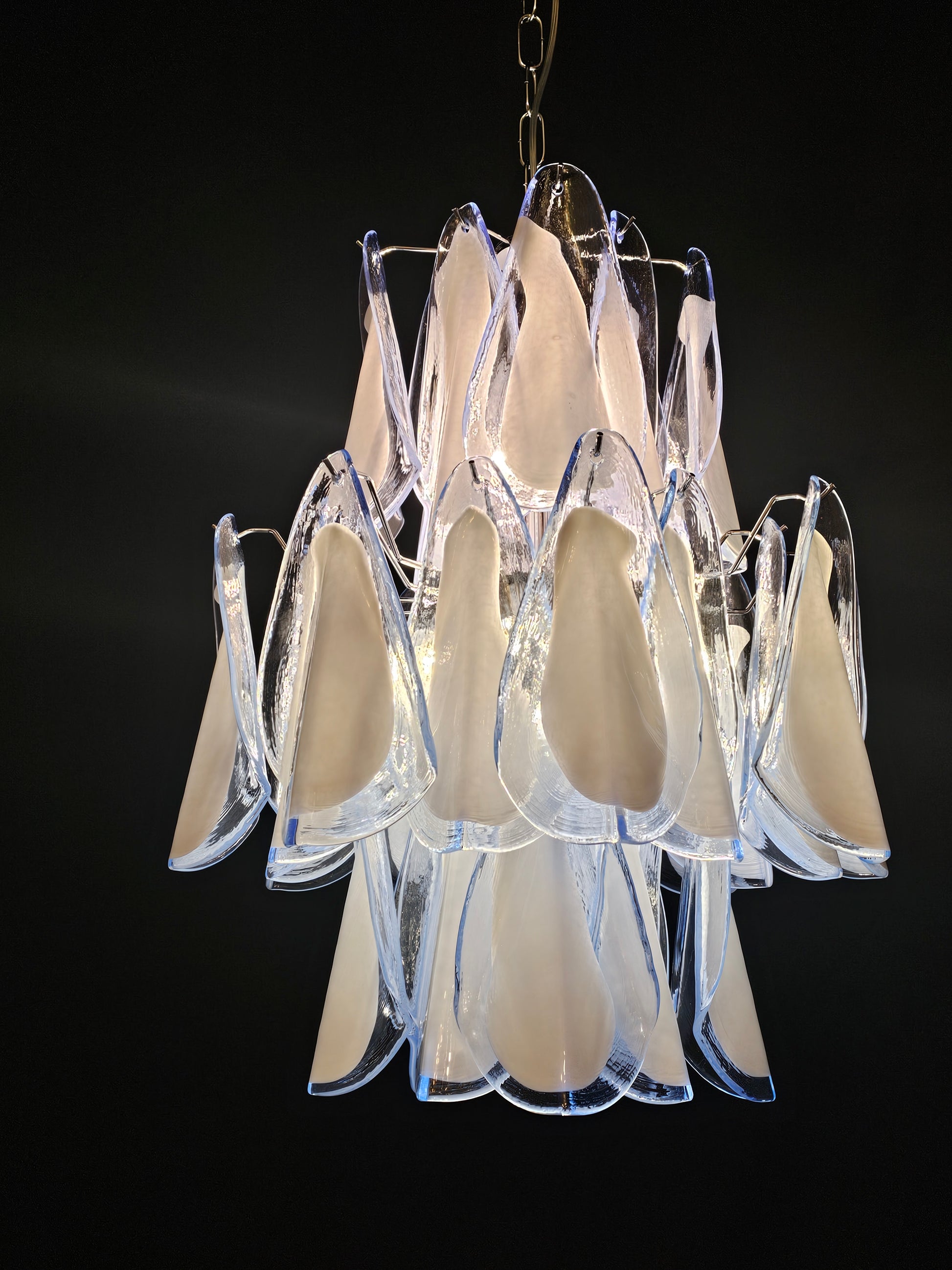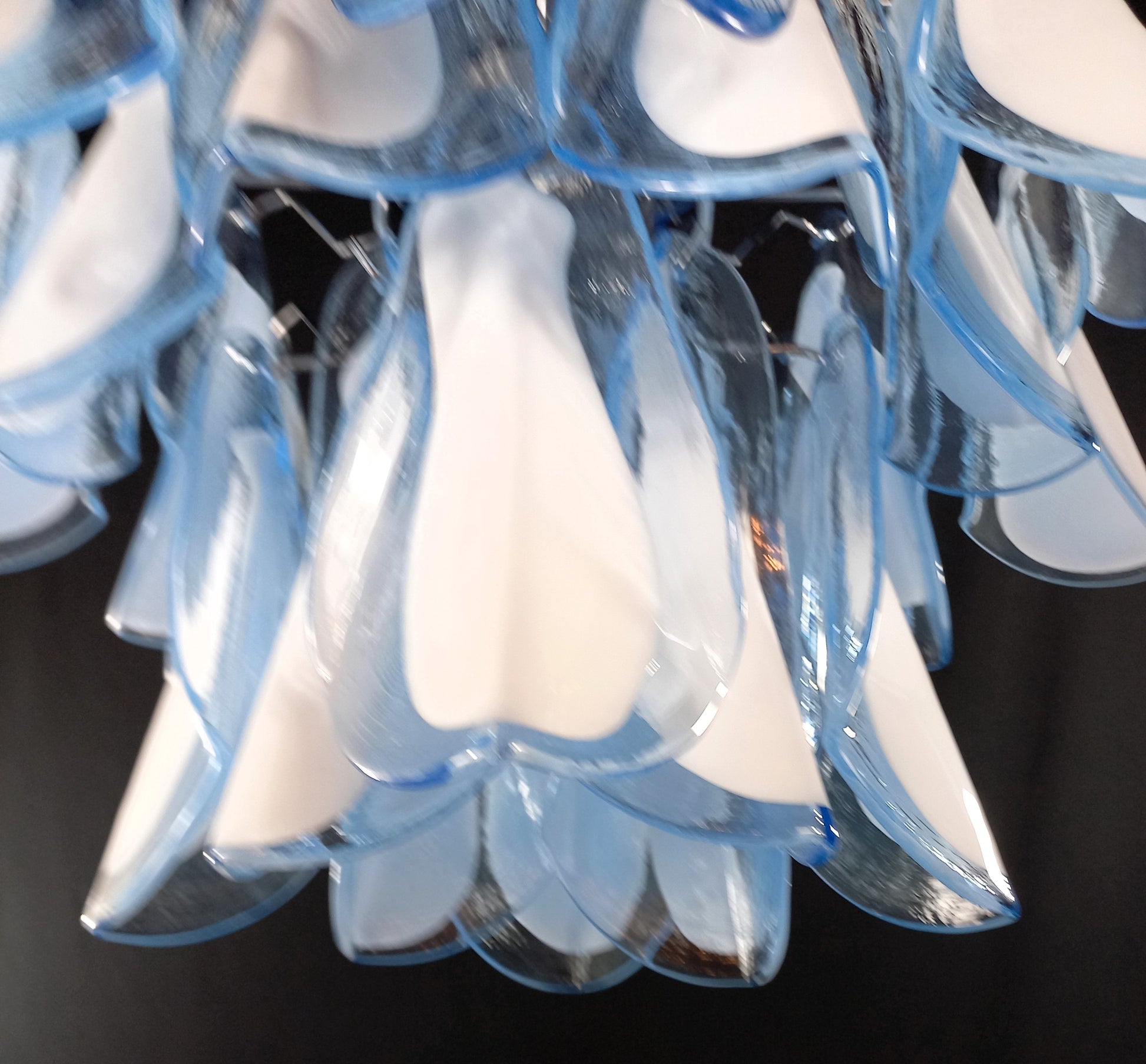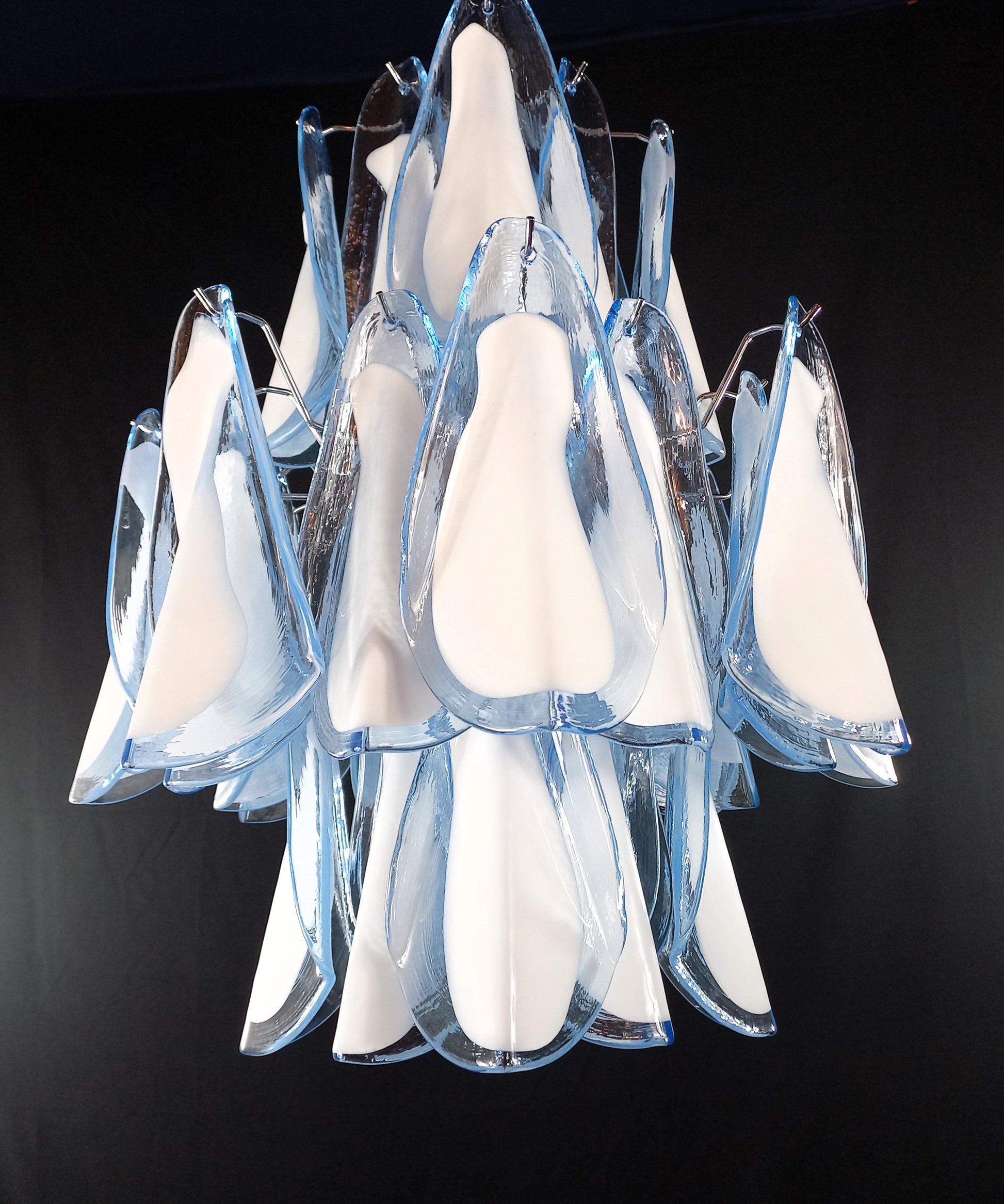 Lampadario di Murano stile Impero, artigianale e con vetri fatti a mano. Lampadario a stile Impero come lo definiamo qui a Murano, con molteplici piani di vetri, molto riempitivo. Con vetri che ricordano la forma della Rondine, cristallo di colore azzurro con anima bianco latte. Questo lampadario porta n. 32 vetri di Murano e ha riflessi di luce molto speciali visti dalle diverse angolazioni. I vetri rondine azzurri bianchi regalano un senso di primavera e libertà. Finitura in un bellissimo cromo lucido, molto elegante. Raffinato ed esclusivo, riempie la stanza con fascino. Con la sua forma riempitiva e completa non riuscirai a smettere di guardarlo dalle mille angolazioni di luce. Il lampadario visto da sotto è una cascata di vetri che ricordano uno stormo di rondini in volo. Questo lampadario ha diametro 50 cm. ed altezza 60 cm. Porta n. 5 luci E14. Questo lampadario è stato creato e prodotto dai nostri Maestri nella nostra azienda.