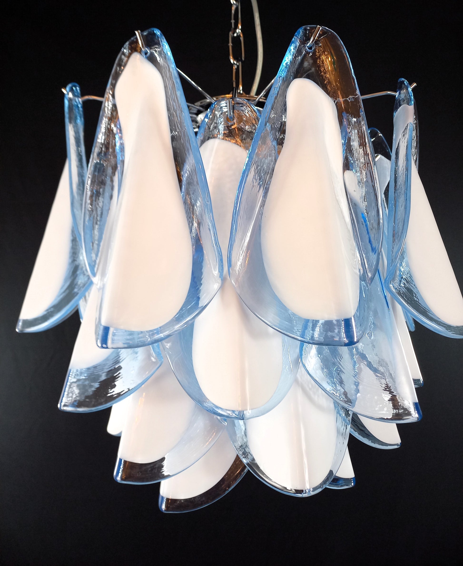 Lampadario di Murano con Vetri rondine di Murano fatti a mano in cristallo azzurro e anima bianca. Designed and made in Venice, Italy.