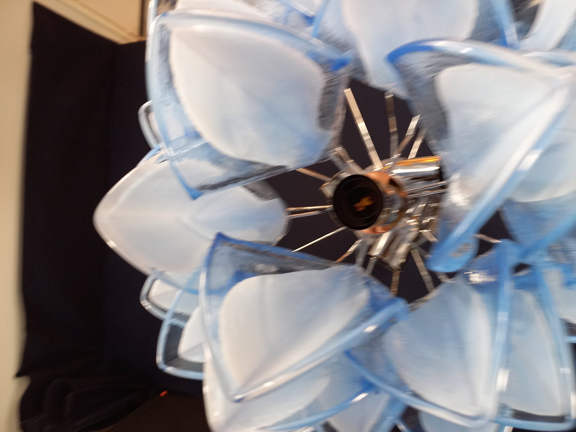 Lampadario di Murano, stile anni'70. Lampadario rotondo con molteplici piani di vetri, molto riempitivo. Con n. 25 vetri di Murano fatti a mano che ricordano la forma della Rondine, in cristallo di colore azzurro con anima bianca. Questo lampadario ha riflessi di luce molto speciali visti dalle diverse angolazioni. I vetri rondine azzurri e bianchi regalano un senso di primavera e libertà. Finitura in un bellissimo cromo lucido, molto elegante. Raffinato ed esclusivo, riempie la stanza con colore ma sobrietà. Con la sua forma riempitiva e completa non riuscirai a smettere di guardarlo dalle mille angolazioni di luce. Il lampadario visto da sotto è una cascata di vetri che ricordano uno stormo di rondini in volo. Questo lampadario ha diametro 45 cm. ed altezza 40 cm. Porta n. 4 luci E27. Questo lampadario è stato creato e prodotto dai nostri Maestri nella nostra azienda.