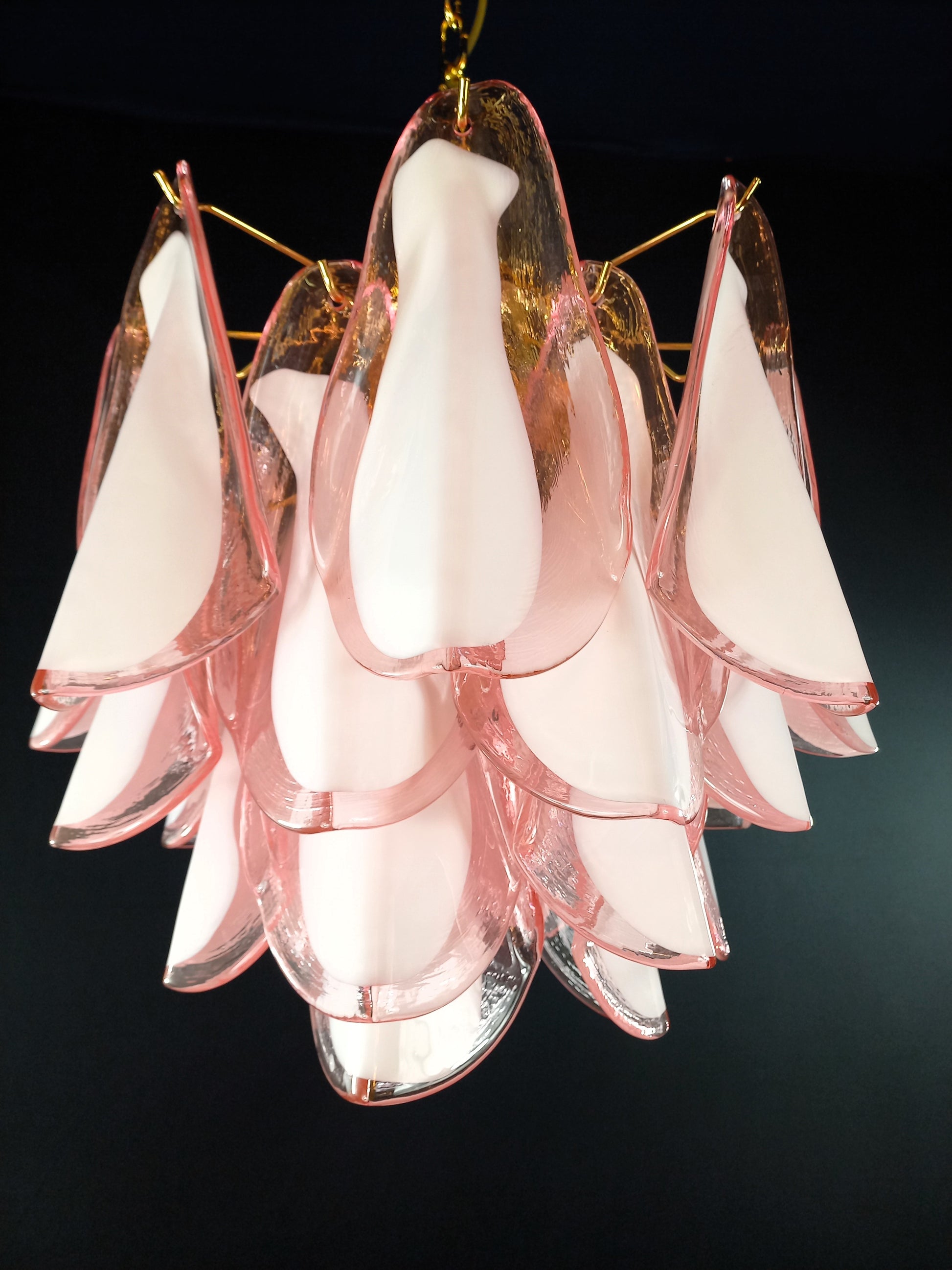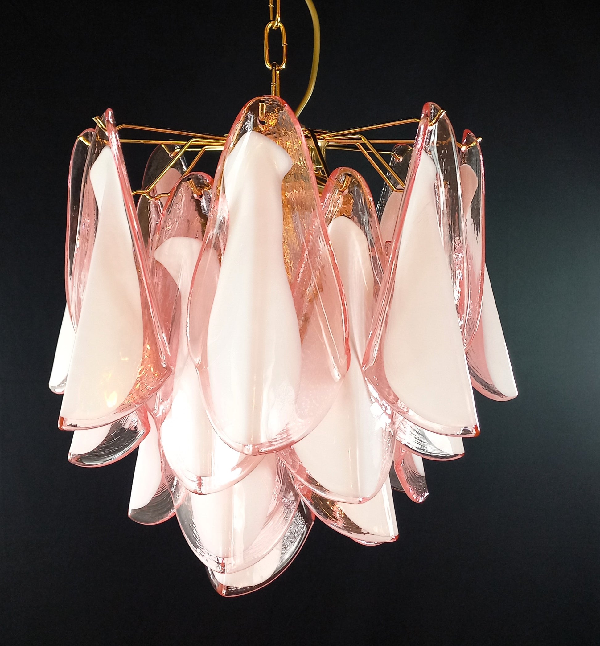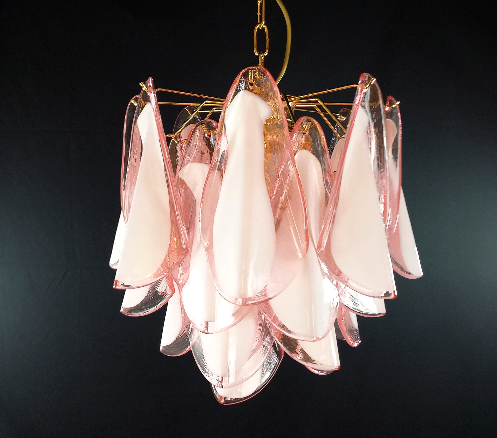 Lampadario di Murano con Vetri rondine di Murano fatti a mano in cristallo rosa e anima bianca. Designed and made in Venice, Italy.