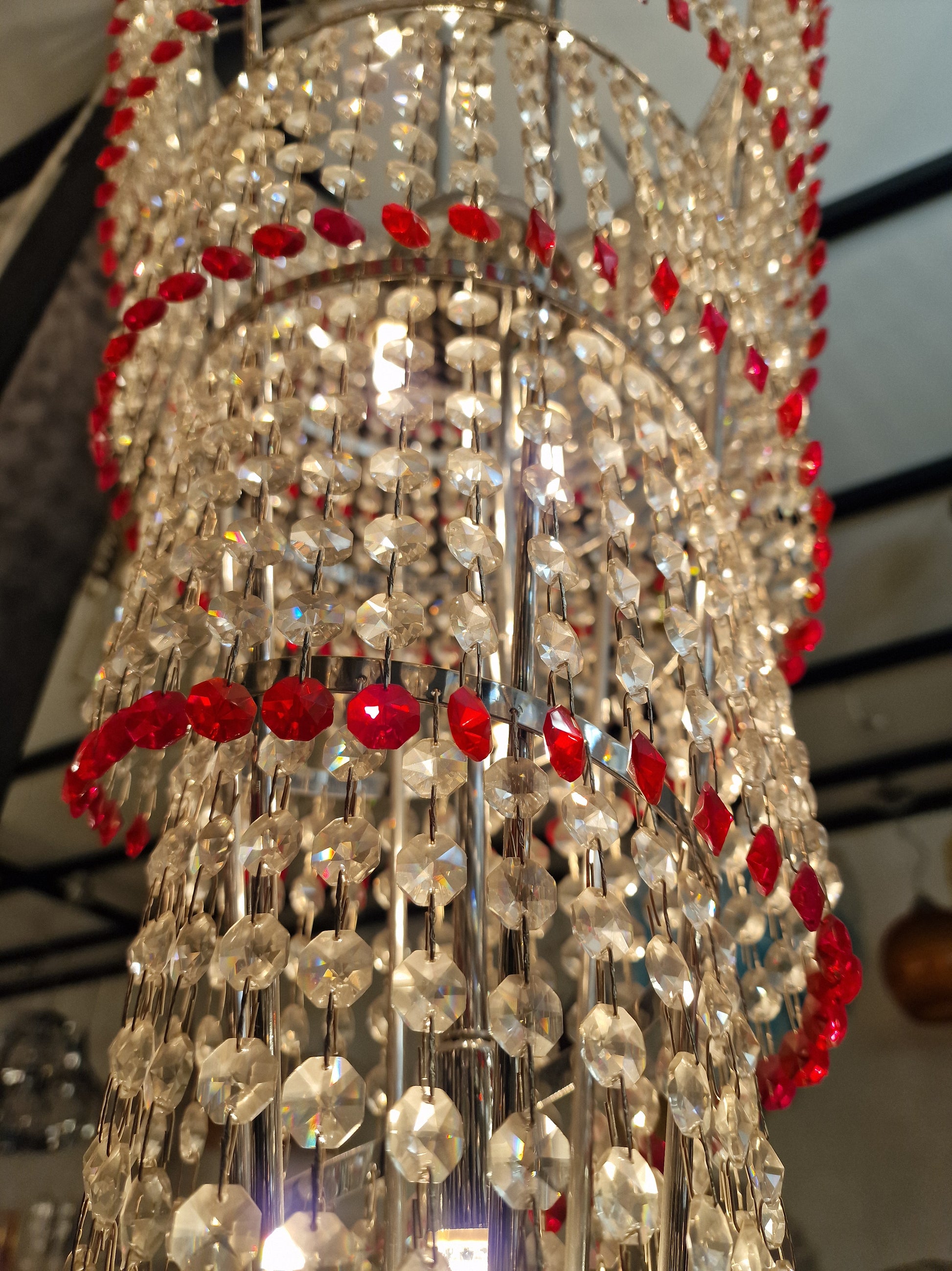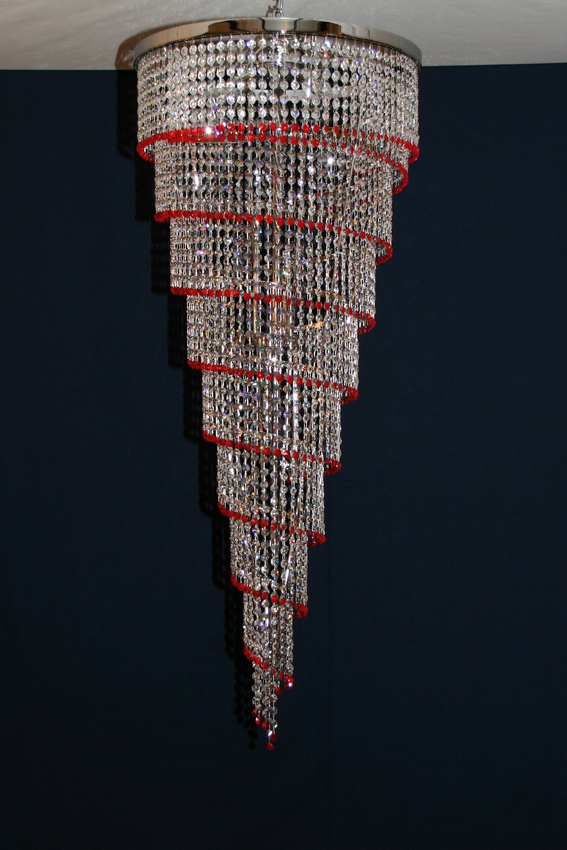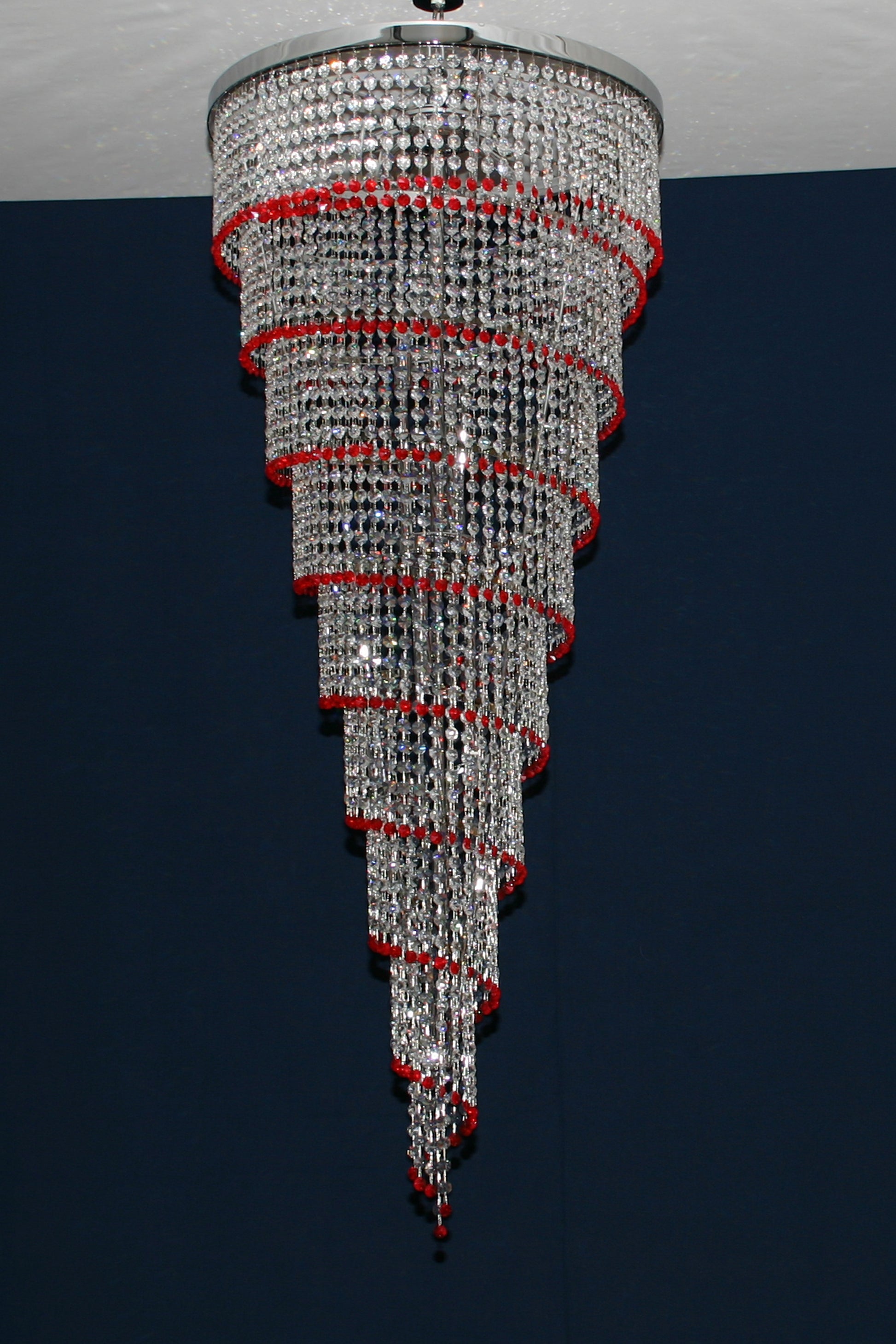 Lampadario Spirale Vintage Murano, stile Murrina. Bellissima e suggestiva spirale piena di cristalli tipo swarovsky, fatti a mano, di colore cristallo e rosso. Ha misura diametro 53 e altezza 130 cm. Finitura in cromo lucido. Brillante, luminosa e raffinata, regala giochi di luce ed infiniti riflessi a tutta la stanza. Imponente e regale, facilmente collocabile in molti ambienti. Questa spirale è stata creata e prodotta dai nostri Maestri nella nostra azienda. Designed and Made in Murano ,Italy.