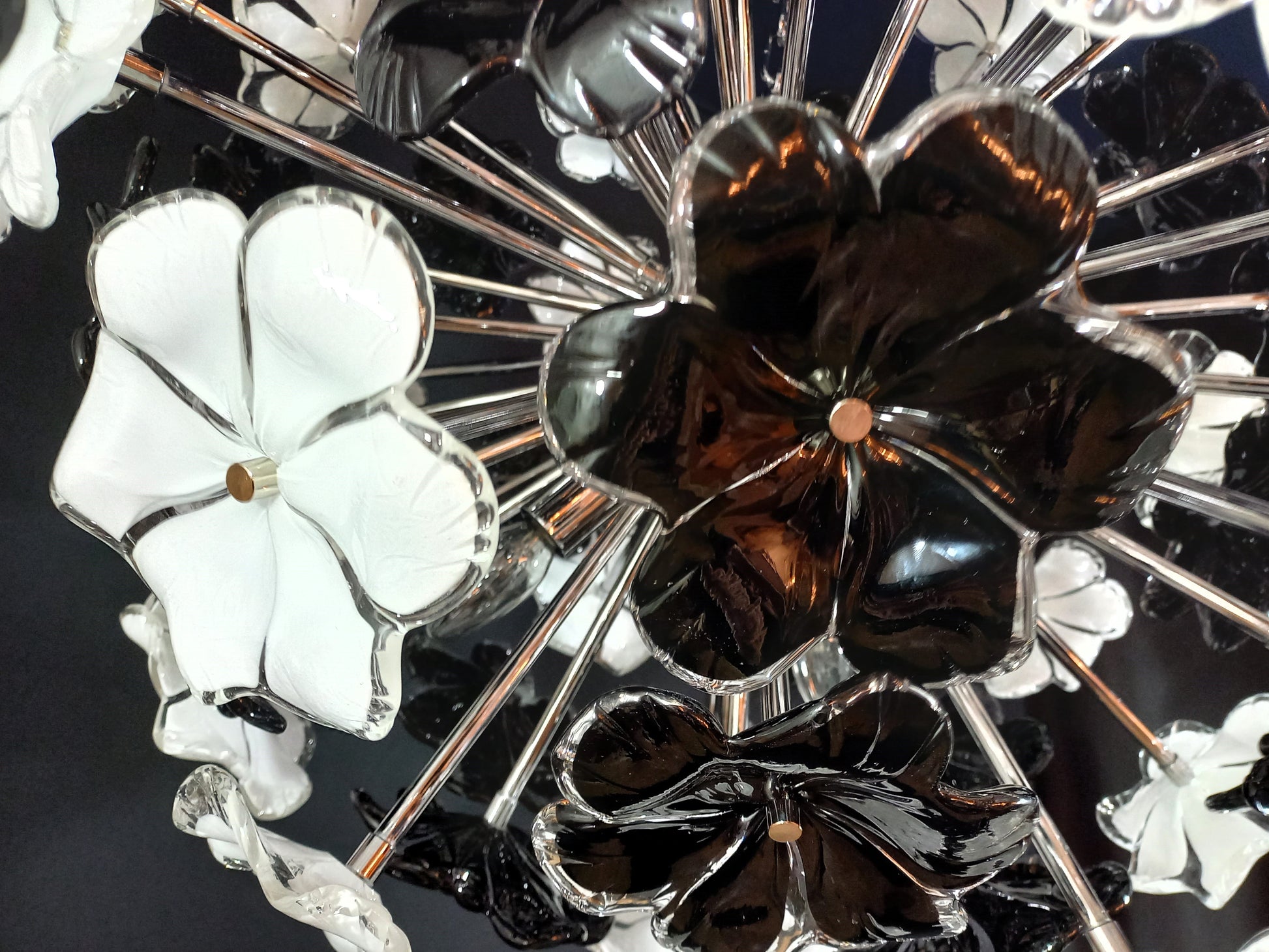 Lampadario di Murano modello Sputnik artigianale. Spettacolare Sputnik in cromo lucido, con aste di lunghezza alternata che regalano movimento e rendono il lampadario molto riempitivo e di design. I vetri sono tutti fiori in vetro di Murano, fatti interamente a mano, in modo artigianale. I vetri sono creati, modellati e tagliati nella loro forma a mano, per questo ogni fiore sarà unico nel suo genere e differente dagli altri. Ogni vetro, essendo fatto a mano, avrà un taglio, una dimensione e una forma diversa dagli altri, che aumenterà il suo pregio e lo renderà assolutamente unico e speciale. Possiamo apprezzare due colori in questi vetri di Murano, cristallo e nero, e cristallo e bianco, che lo fanno sembrare uno splendido bouquet di fiori pregiati. Molto scenico e di design con luci spente, dai toni caldi e scintillanti con luci accese. Il lampadario, rotondo, ha un diametro di 70 cm. e un altezza di 70 cm. Ha un totale di n. 57 vetri fiori di Murano, e porta n. 6 luci E14 (modificabili e adattabili anche al cablaggio USA). Riepilogando: Colore Vetro: Vetri di Murano, fiori fatti interamente a mano, nei colori cristallo e nero, e cristallo e bianco Finitura: cromo lucido Diametro: 70 cm. Altezza: 70 cm. Numero Luci: 6 (Lampadine Non Incluse) Tipo Luci: E 14 , 220V EU