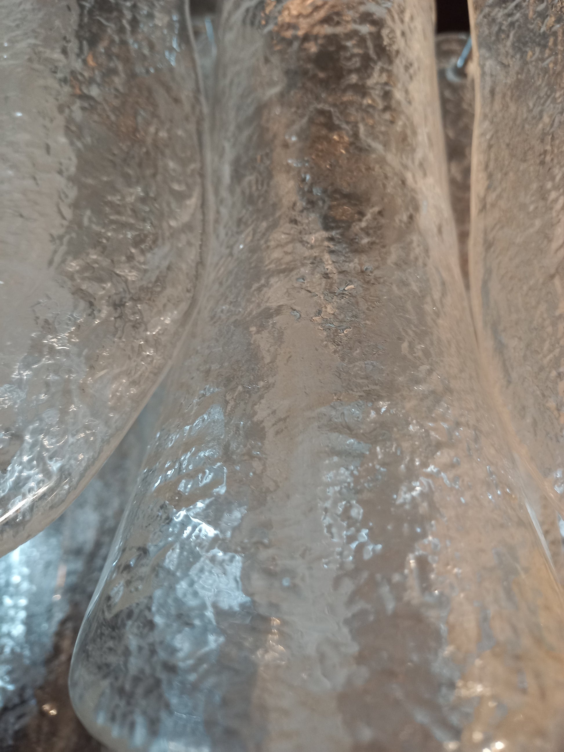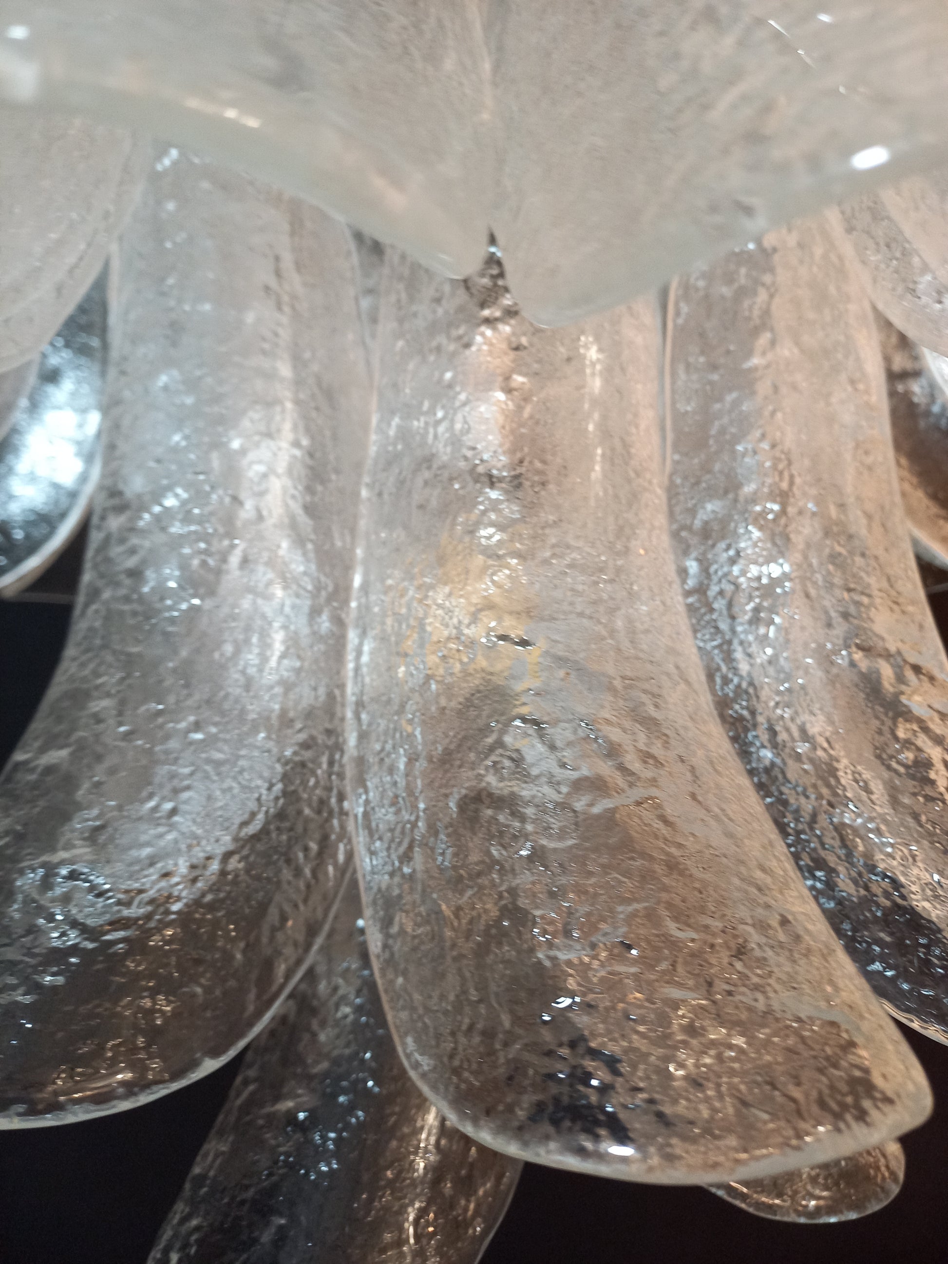 Lampadario stile Barovier anni'80, vintage, rotondo, adatto ad ogni ambiente. Questo lampadario è composto da vetri petali di Murano ,cristallo con un particolare effetto martellato . Il lampadario stile vintage ha riflessi di luce molto speciali visti dalle diverse angolazioni. I vetri petali cristallo martellato regalano un senso di regalità e raffinatezza. Finitura in un bellissimo cromo lucido, molto elegante. Molto esclusivo, riempie la stanza con una ventata di novità. Con la sua forma riempitiva e completa non riuscirai a smettere di guardarlo dalle mille angolazioni di luce. Il lampadario visto da sotto ricorda un fiore sbocciato in primavera, con i petali bagnati di rugiada, grazie al tipico effetto di martellatura sui vetri. Questo lampadario ha diametro 75 cm. ed altezza 65 cm. Porta n. 6 luci E27.