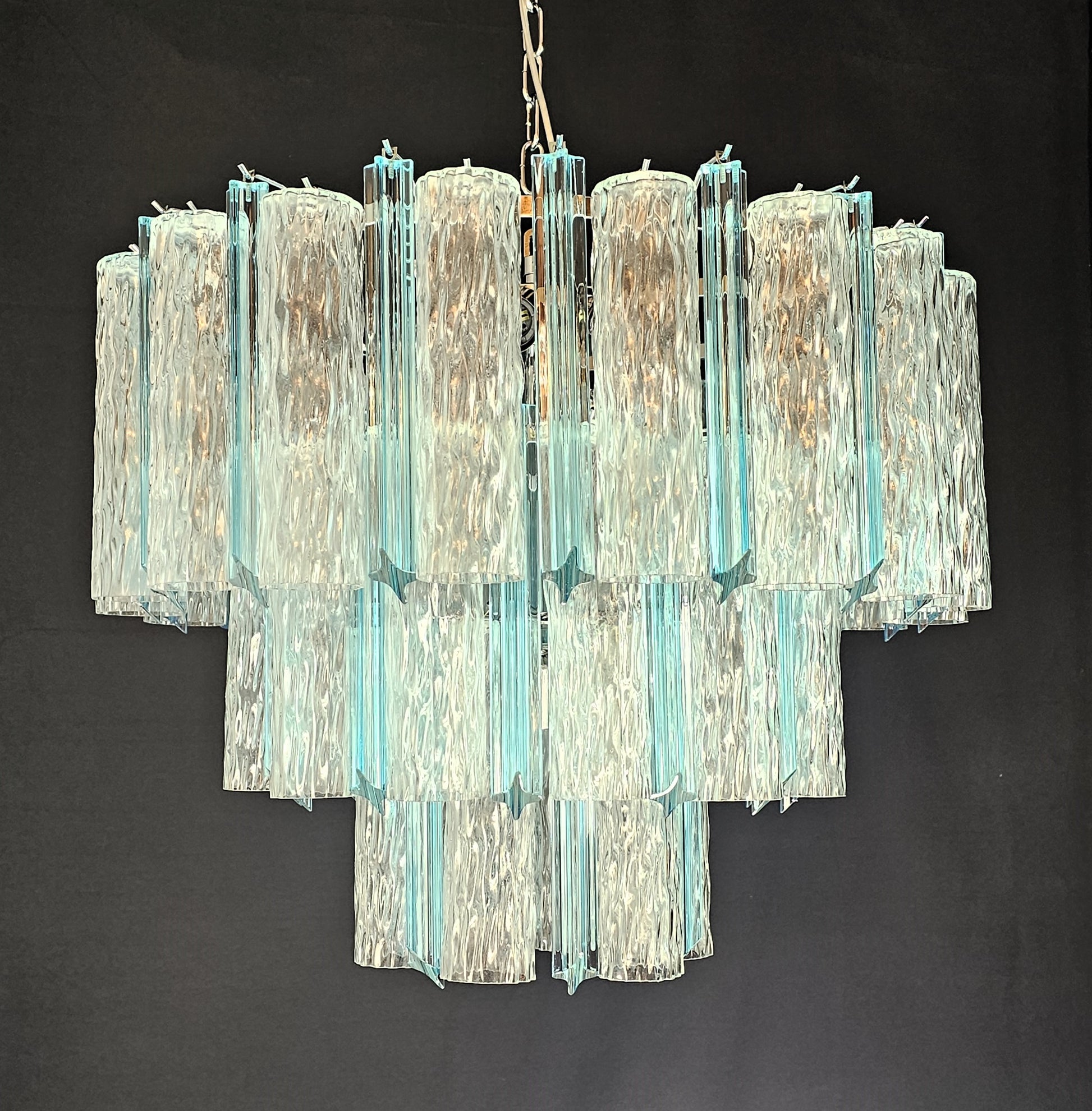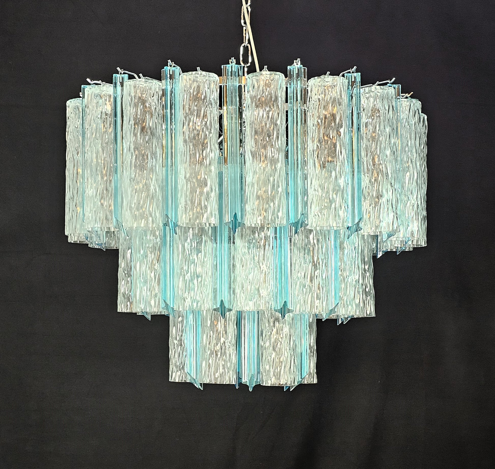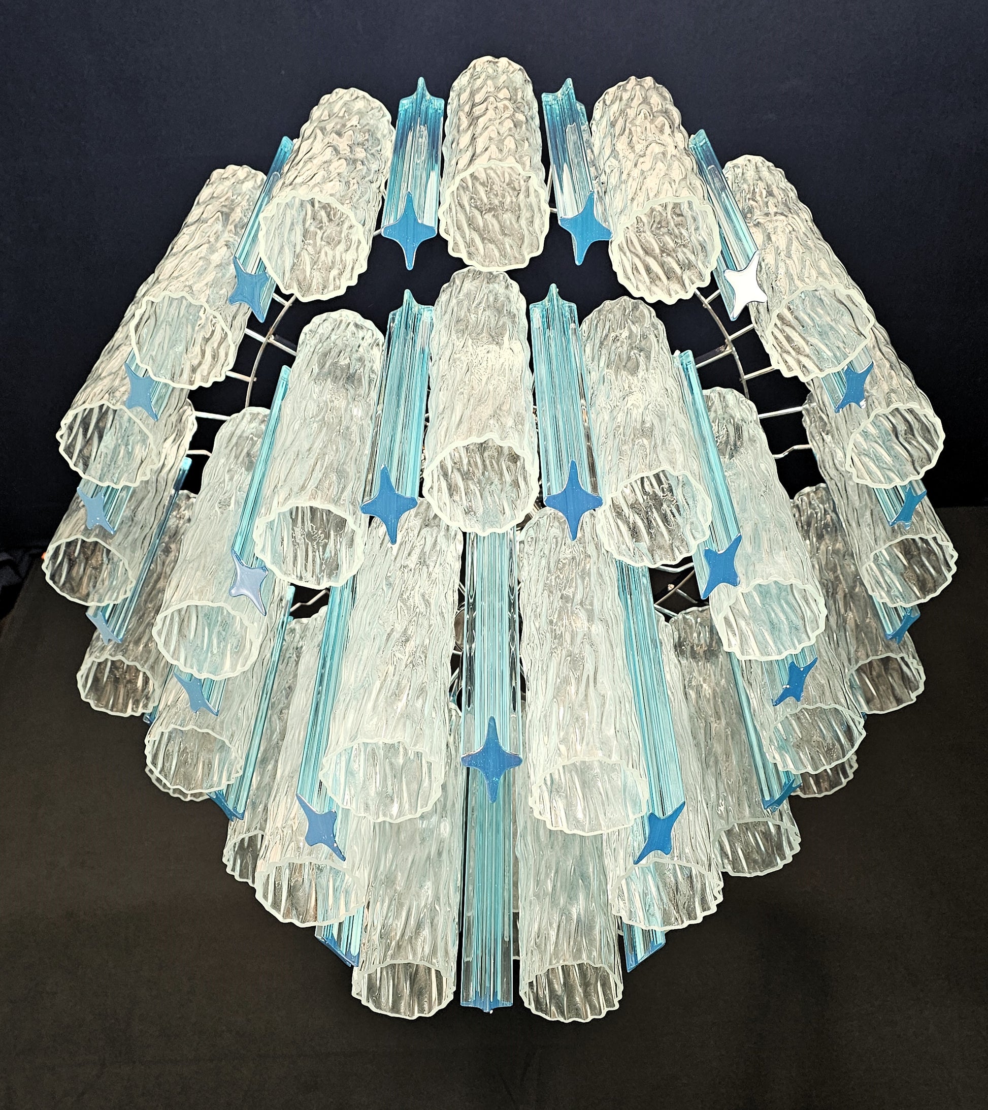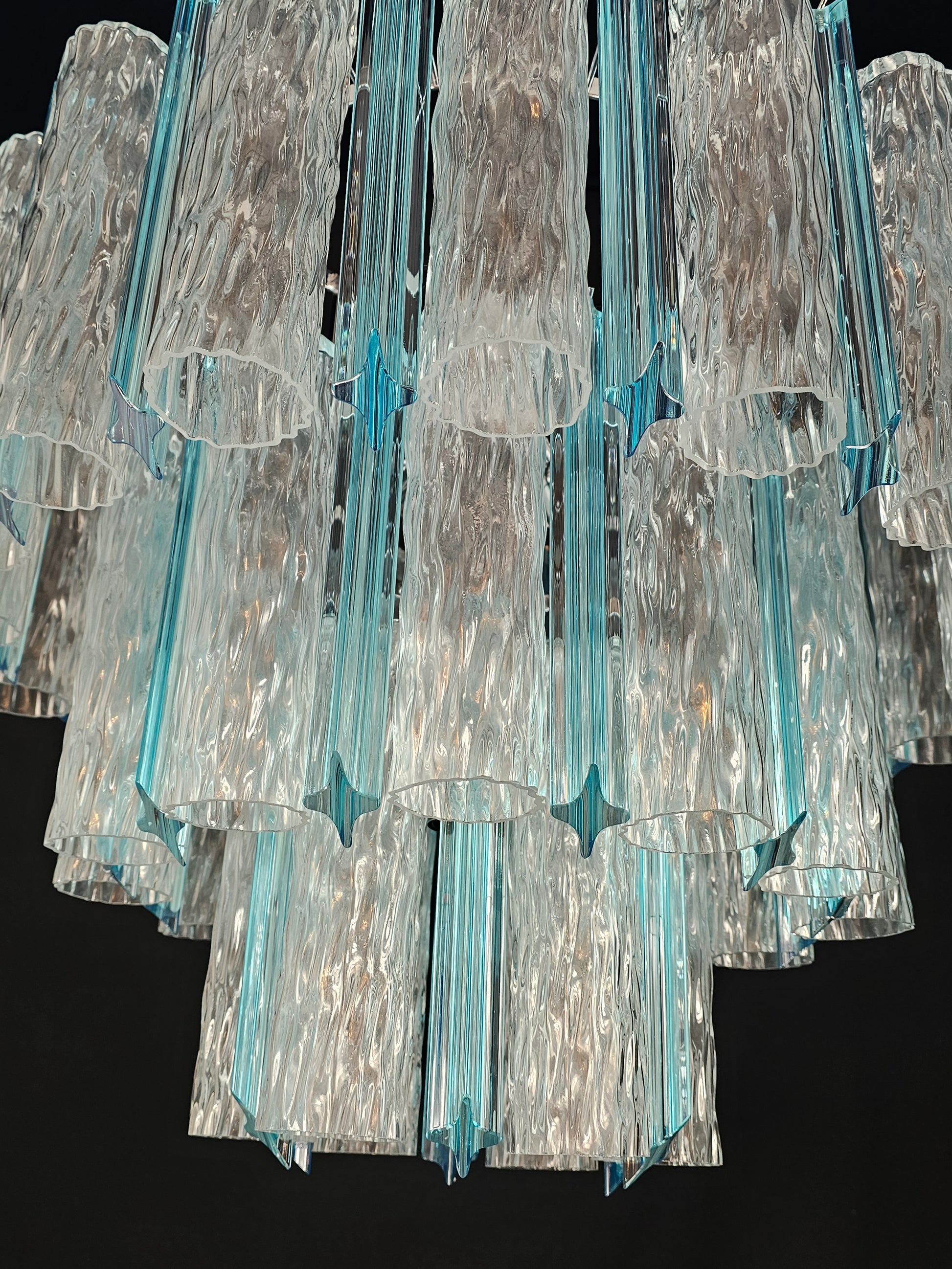 Lampadario Vintage di Murano, stile Barovier, anni'80. Lampadario con tre piani di vetri rotondo, e due diversi tipi di vetri di Murano, alternati. Sono presenti infatti vetri prismi quadriedri, in cristallo colore azzurro acquamare. E vetri di Murano tubi cilindro, dalla particolare trama increspata, in cristallo, per un totale di n.72 vetri. Con uno stile che si intreccia tra il moderno e il vintage, questo lampadario senza tempo si adatta perfettamente a tutti gli ambienti, creando molto design. La finitura del lampadario è cromo lucido, che permette di dare maggiormente risalto al colore azzurro acquamare e cristallo dei due tipi di vetri di Murano. Adattabile a qualsiasi ambiente, renderà il tuo ambiente luminoso e decorativo. Le sue misure sono diametro 70 cm. ed altezza 55 cm. Porta n. 10 lampadine E27. Questo lampadario è stata inventato ,ideato e creato da noi. E Vi ricordo che tutti i nostri lampadari sono prodotti artigianalmente a mano dai nostri Maestri, presso la nostra fabbrica.