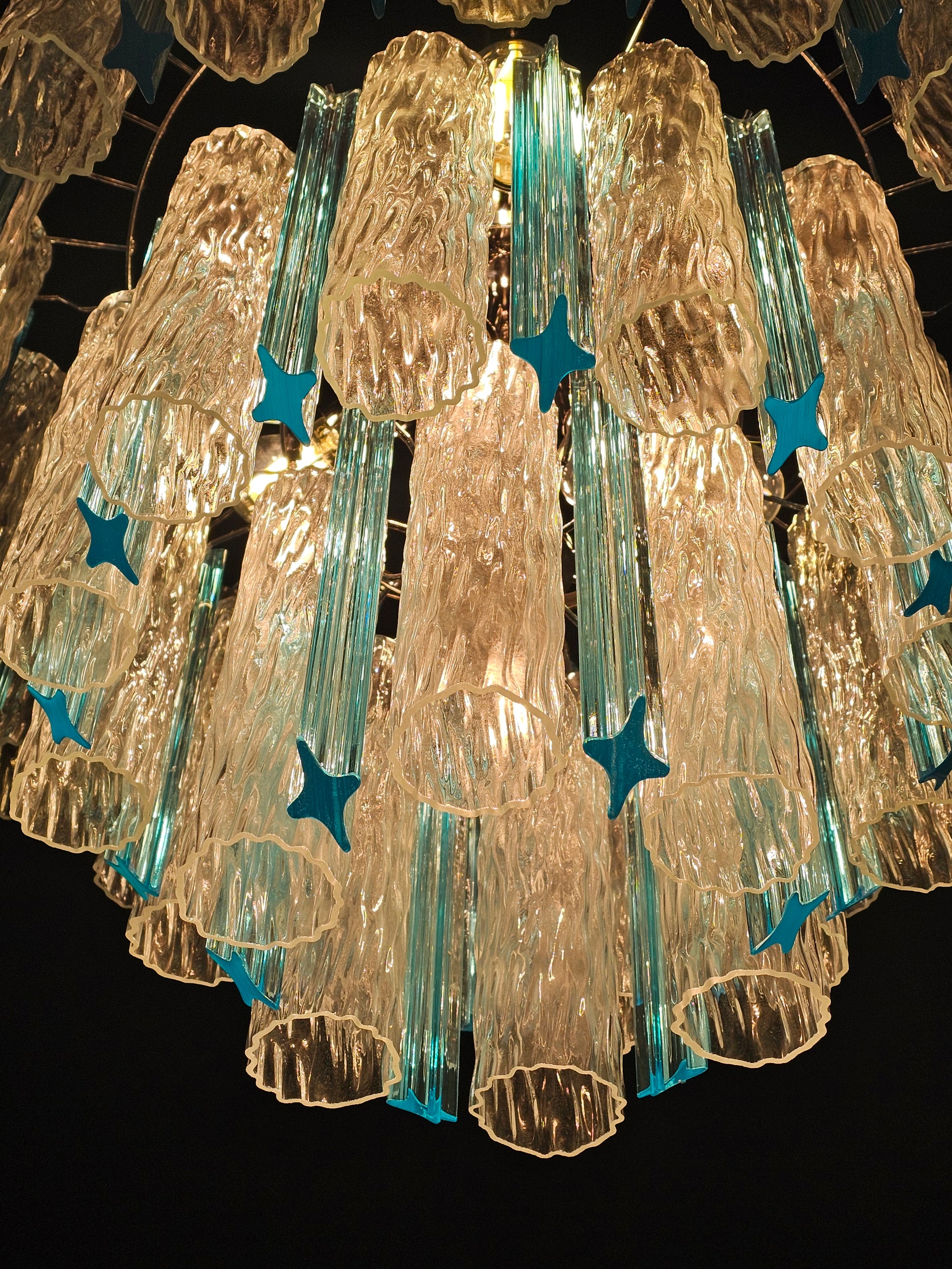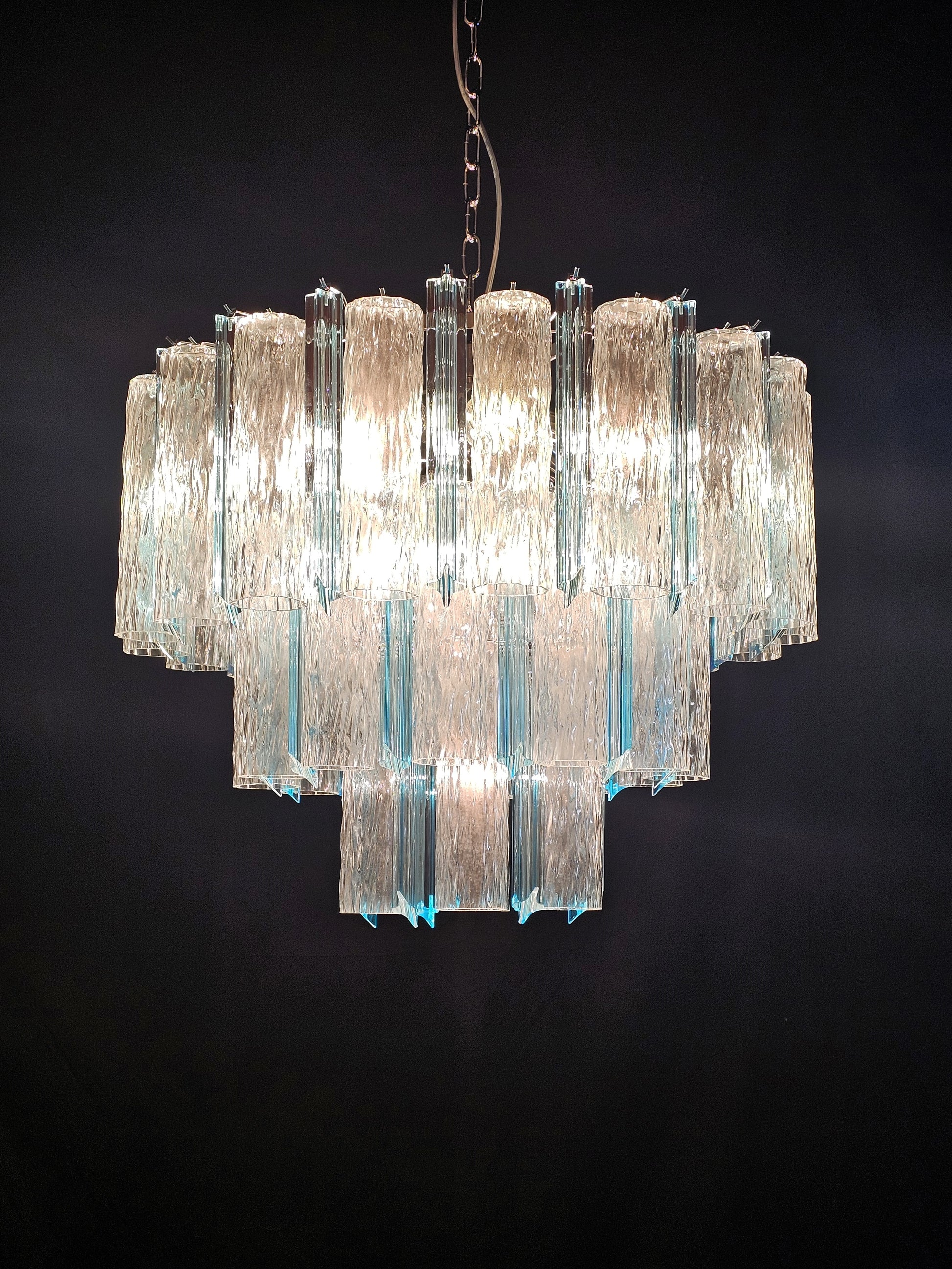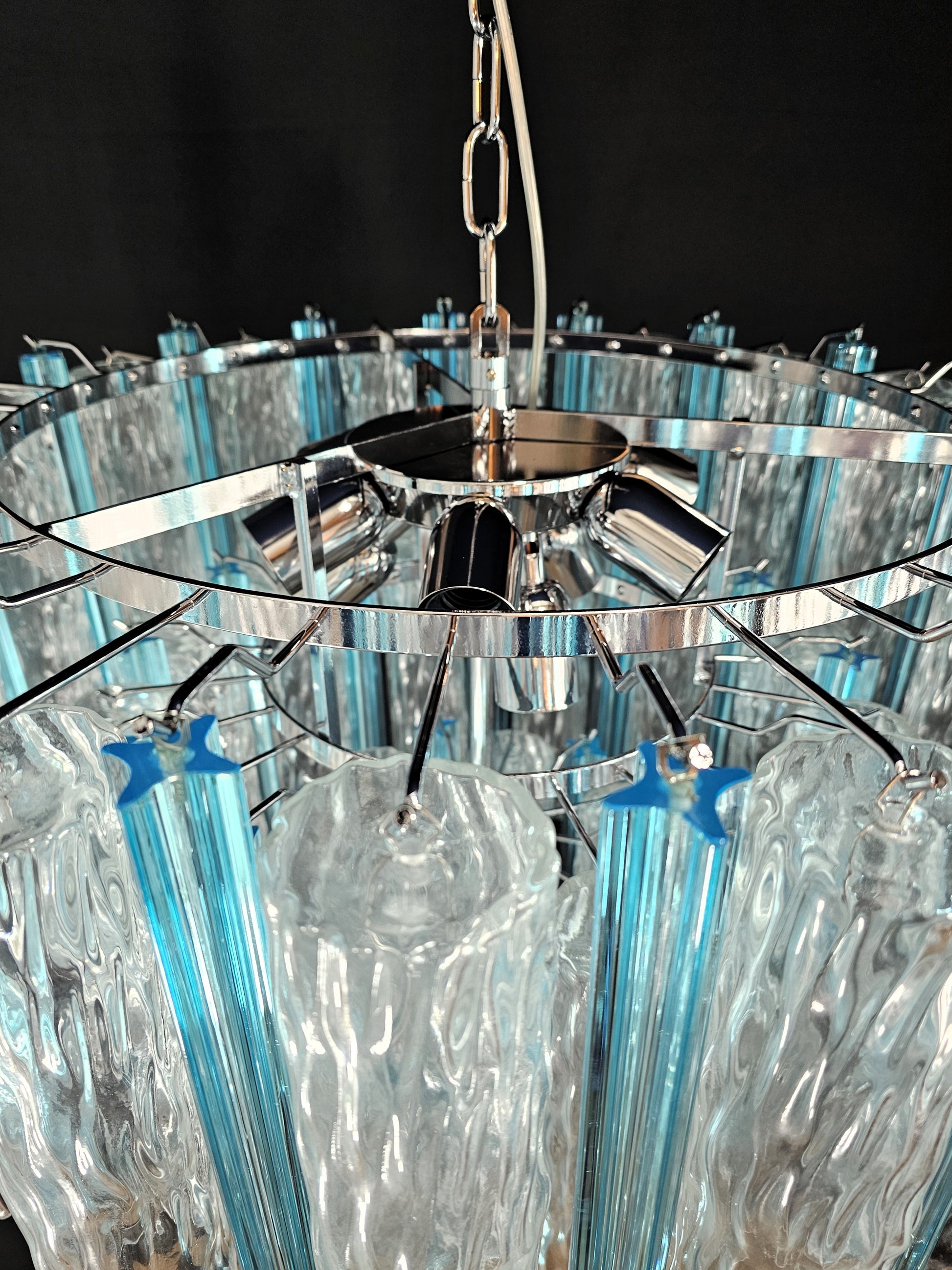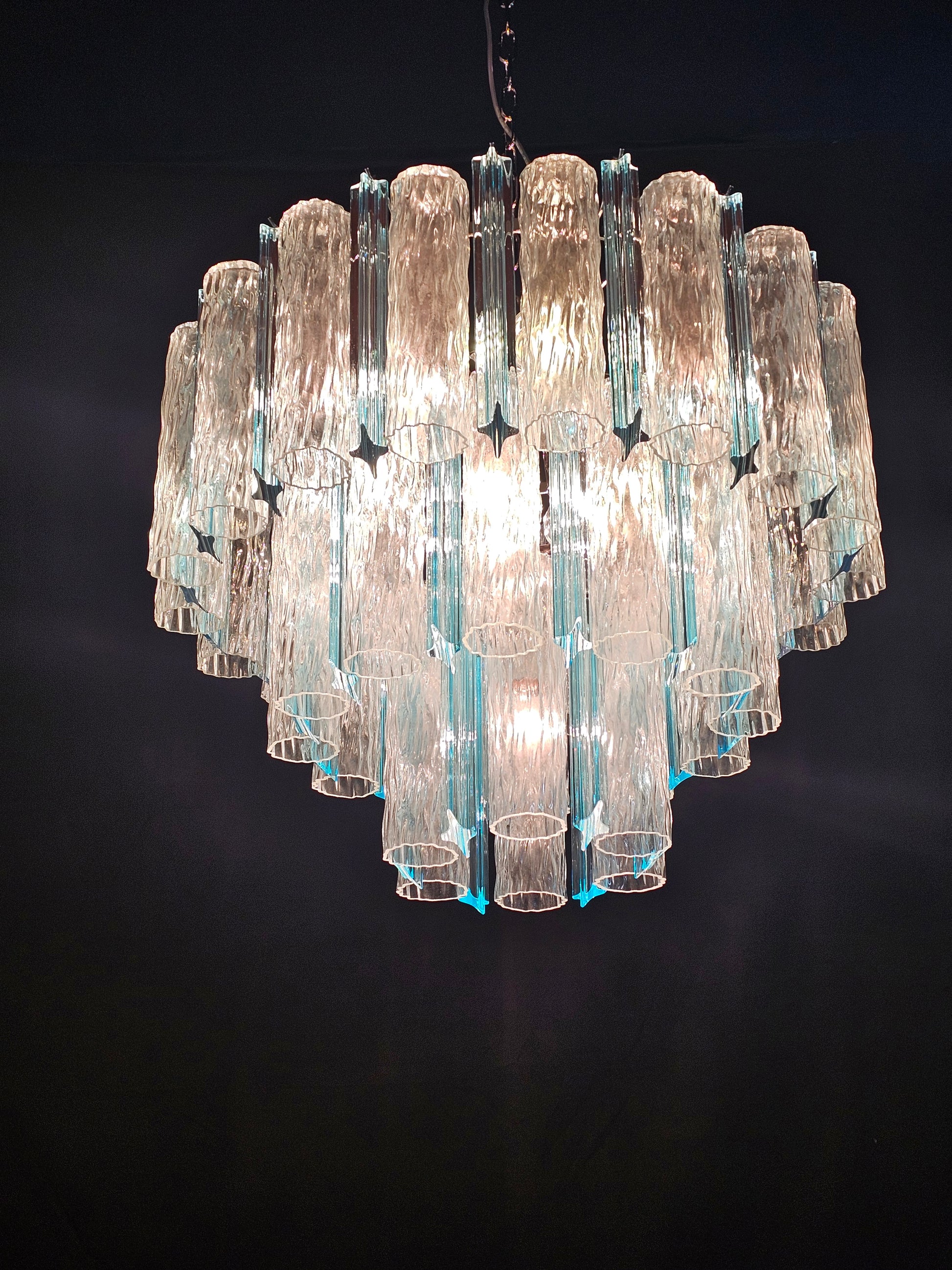 Lampadario Vintage di Murano, stile Barovier, anni'80. Lampadario con tre piani di vetri rotondo, e due diversi tipi di vetri di Murano, alternati. Sono presenti infatti vetri prismi quadriedri, in cristallo colore azzurro acquamare. E vetri di Murano tubi cilindro, dalla particolare trama increspata, in cristallo, per un totale di n.72 vetri. Con uno stile che si intreccia tra il moderno e il vintage, questo lampadario senza tempo si adatta perfettamente a tutti gli ambienti, creando molto design. La finitura del lampadario è cromo lucido, che permette di dare maggiormente risalto al colore azzurro acquamare e cristallo dei due tipi di vetri di Murano. Adattabile a qualsiasi ambiente, renderà il tuo ambiente luminoso e decorativo. Le sue misure sono diametro 70 cm. ed altezza 55 cm. Porta n. 10 lampadine E27. Questo lampadario è stata inventato ,ideato e creato da noi. E Vi ricordo che tutti i nostri lampadari sono prodotti artigianalmente a mano dai nostri Maestri, presso la nostra fabbrica.