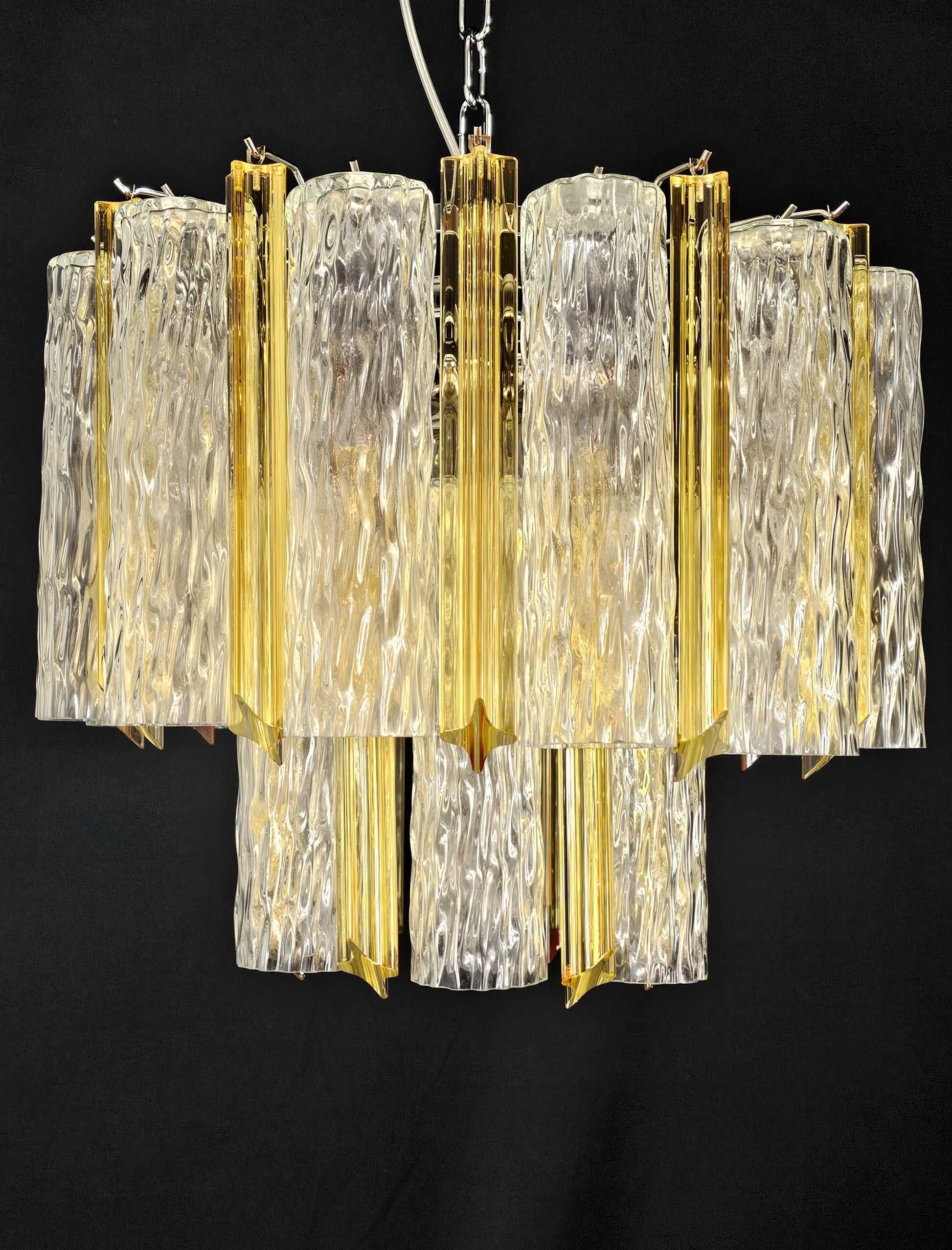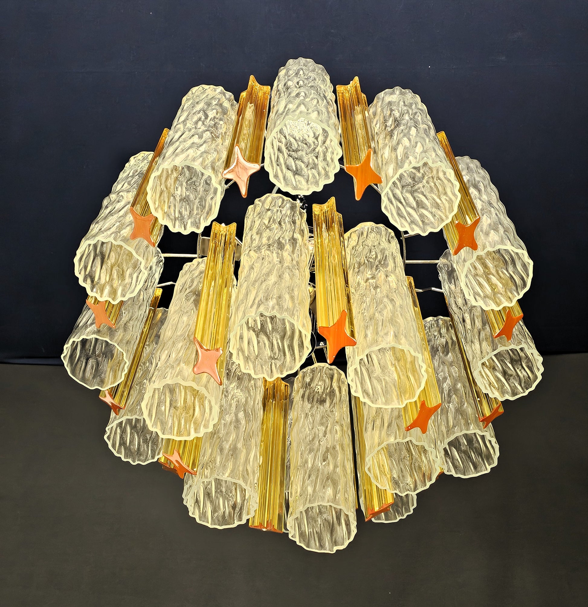 Lampadario Vintage di Murano, stile Barovier, anni'80. Vetri di Murano prismi ambra e tubi cilindro cristallo. Designed and made in Italy
