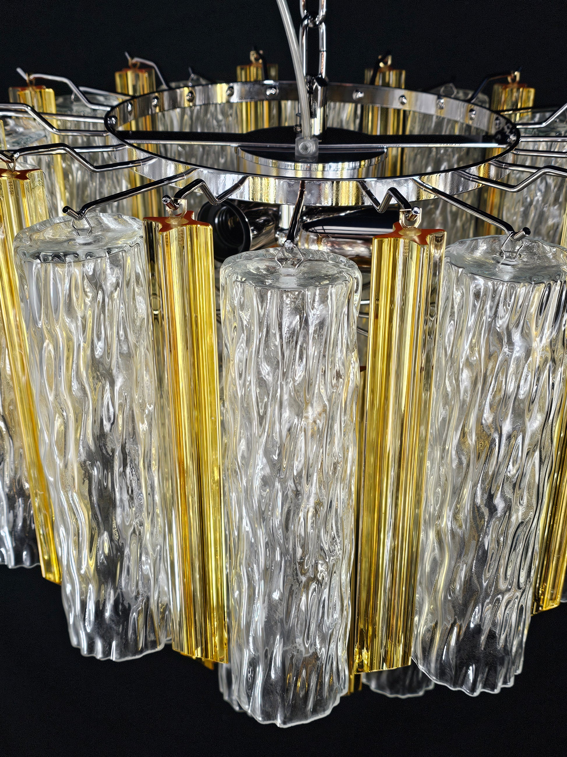 Lampadario Vintage di Murano. Stile Barovier, anni'80. Con due piani di vetri, rotondo e due diversi tipi di vetri di Murano, alternati. Sono presenti infatti vetri prismi quadriedri, in cristallo colore ambra. E vetri di Murano tubi cilindro, dalla particolare trama increspata, in cristallo. Questo lampadario ha un totale di n. 36 vetri. Con uno stile che si intreccia tra il moderno e il vintage, questo lampadario senza tempo si adatta perfettamente a tutti gli ambienti, creando molto design. La finitura del lampadario è cromo lucido, che permette di dare maggiormente risalto al colore ambra e cristallo dei due tipi di vetri di Murano. Adattabile a qualsiasi ambiente, si può inserire da solo in piccole stanze, oppure in stanze più grandi si può usare in coppia dello stesso colore, o abbinato all'altra plafoniera della stessa serie, ma di colore cristallo e azzurro acquamare. Le sue misure sono diametro 40 cm. ed altezza 40 cm. Porta n. 4 lampadine E27. Questo lampadario è stata inventato ,ideato e creato da noi. E Vi ricordo che tutti i nostri lampadari sono prodotti artigianalmente a mano dai nostri Maestri, presso la nostra fabbrica.
