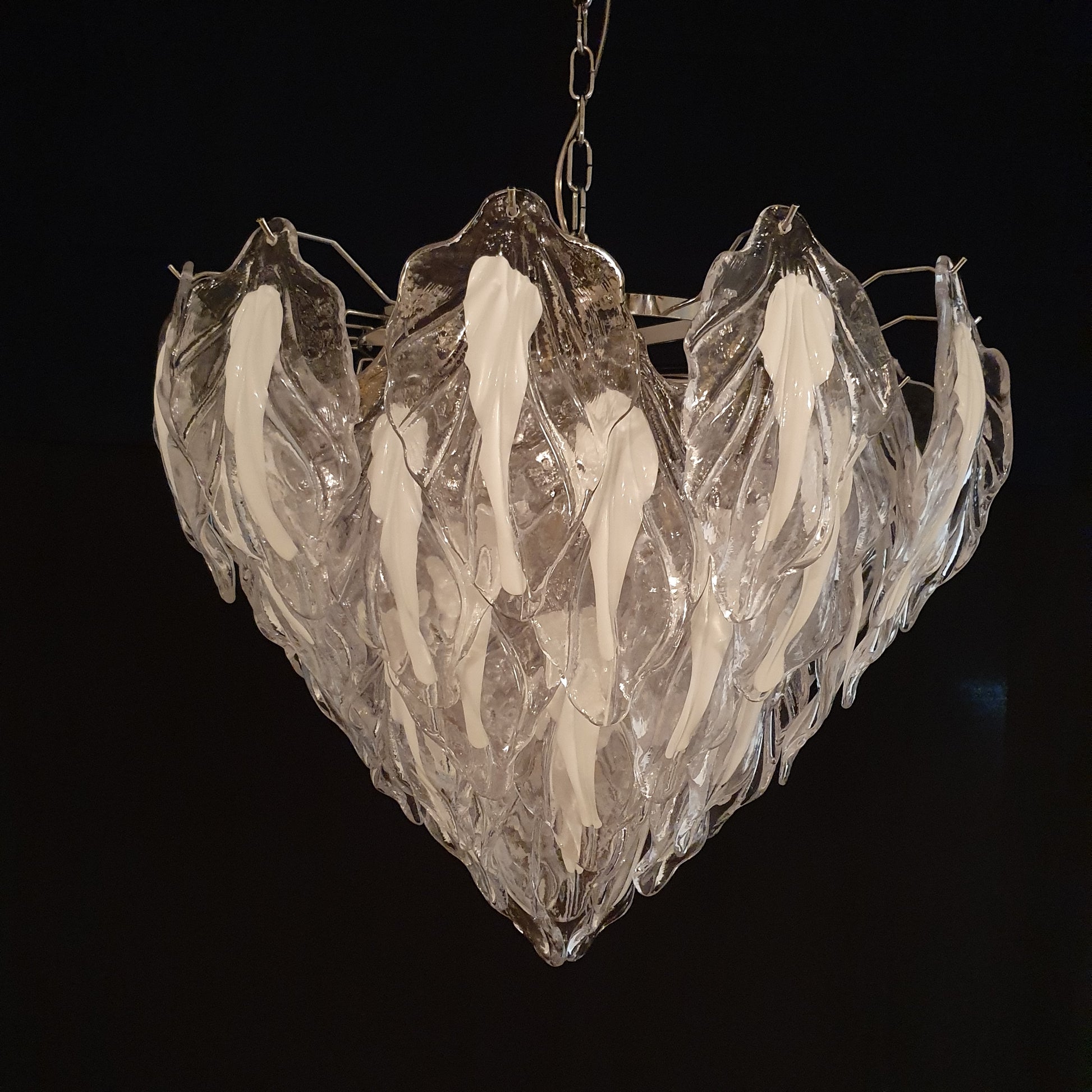 Lampadario Vintage Murano, stile Mazzega,anni '80. Con vetro di Murano foglia cristallo con anima bianca. Designed and Made in Venice Italy