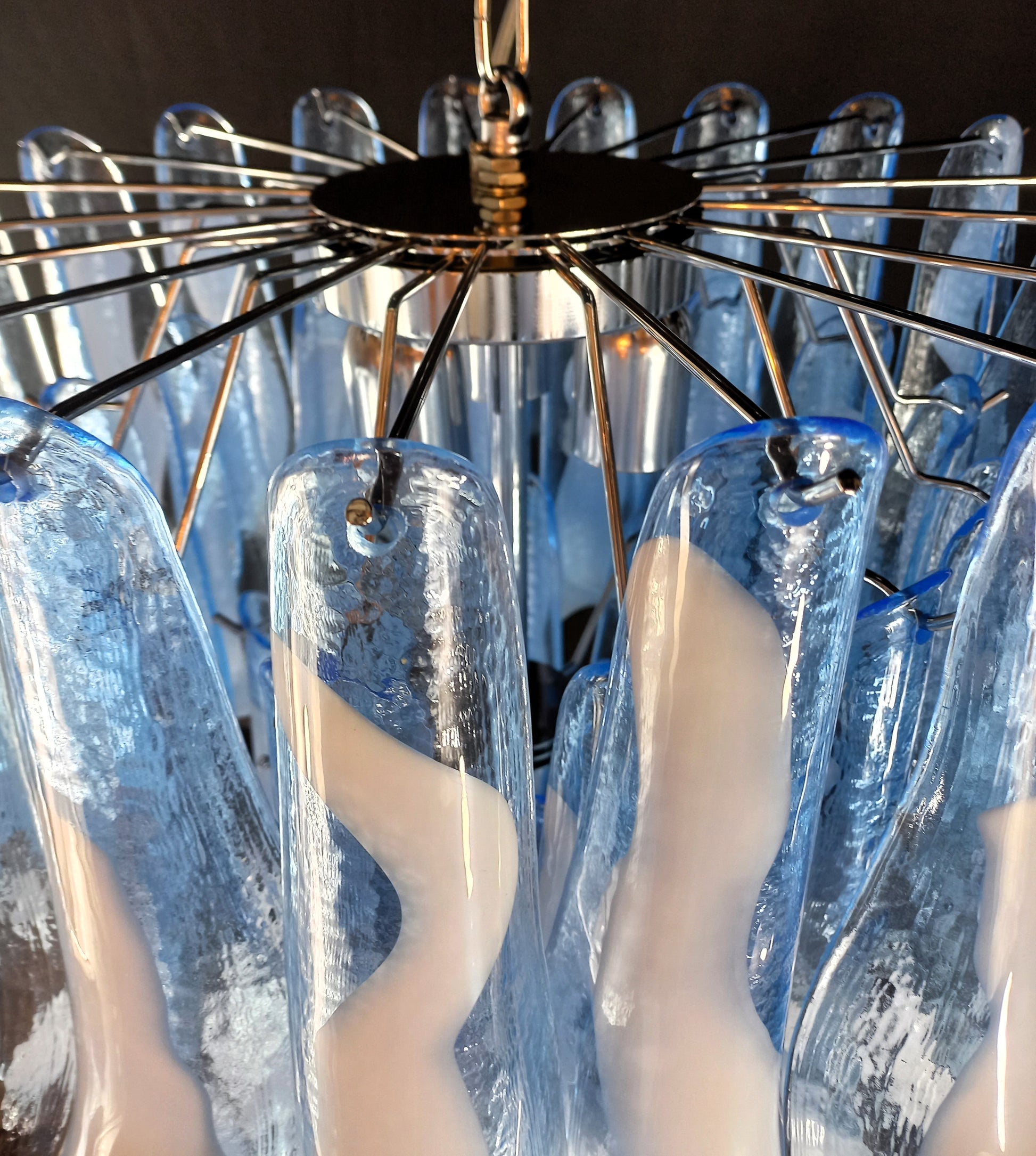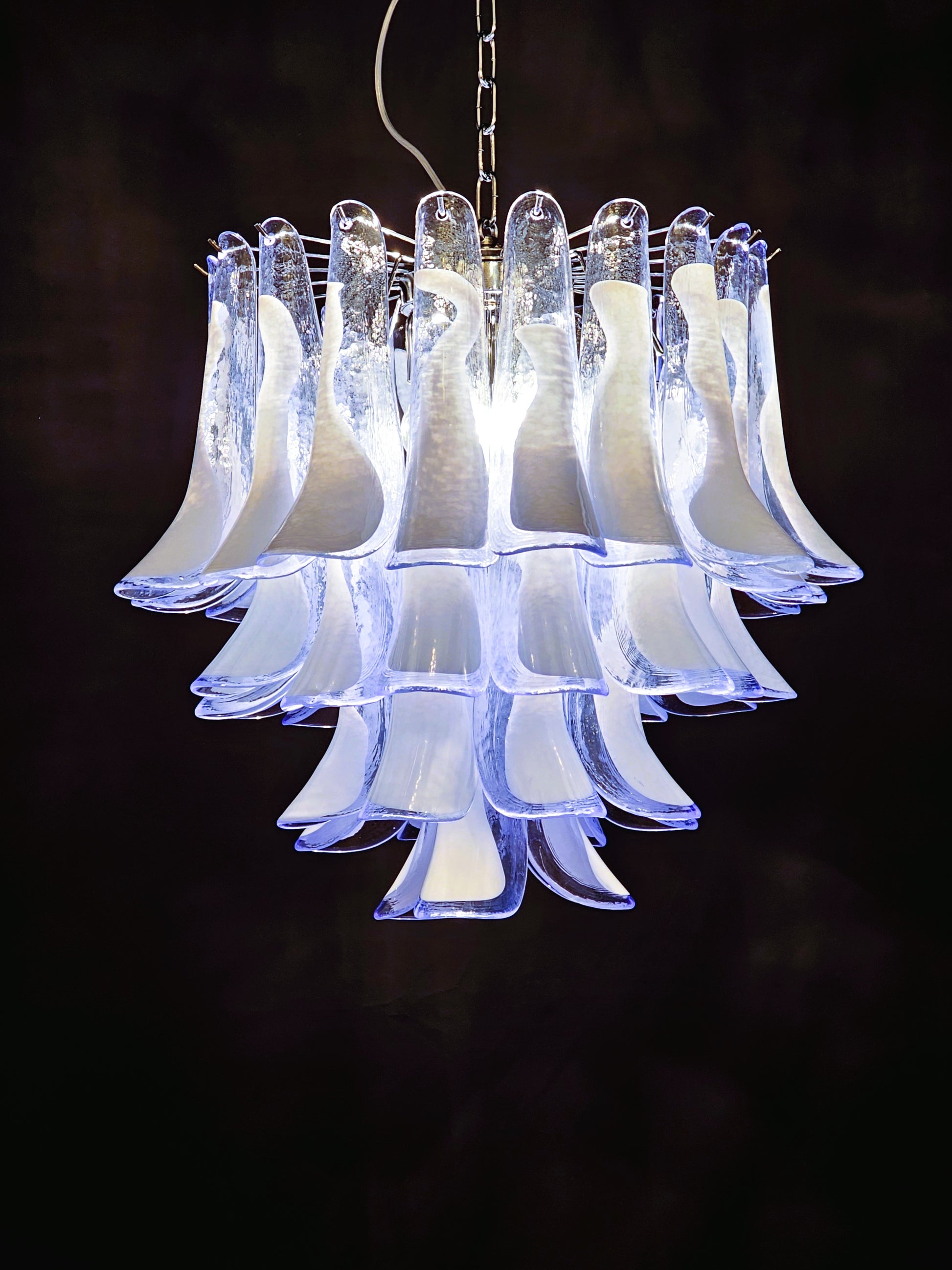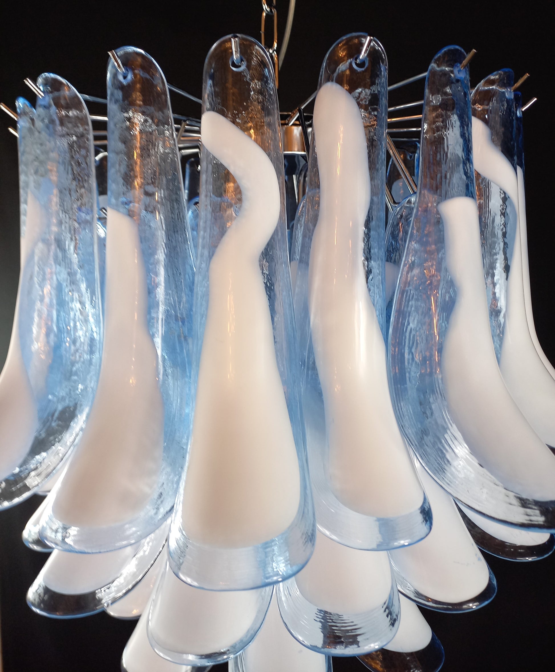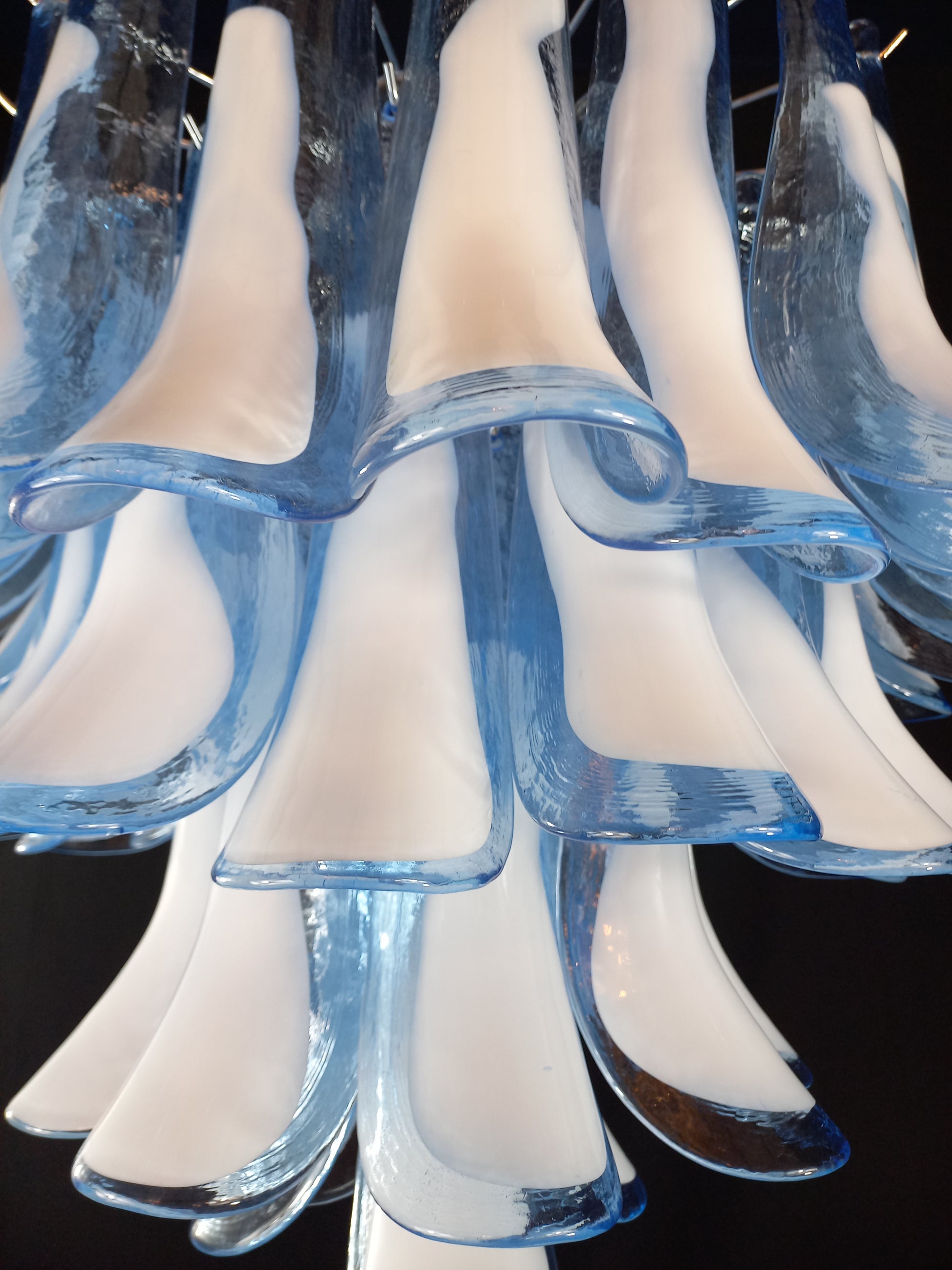 Lampadario Vintage Murano, stile Mazzega, anni'80. Vetri di Murano petali blu chiaro con anima bianca. Designed and Made in Venice, Italy.