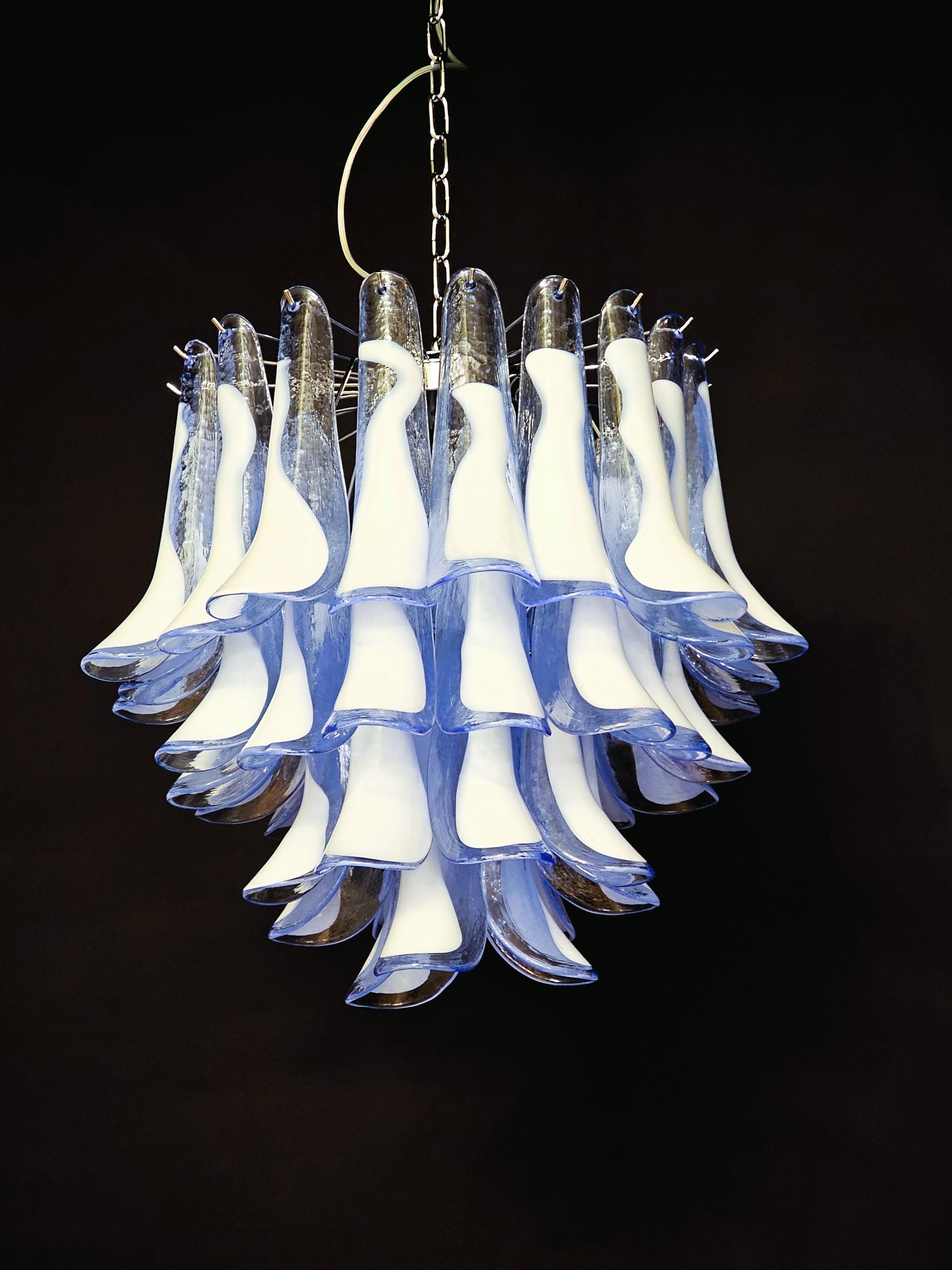 Lampadario Vintage di Murano, stile Mazzega, anni'80. Questo lampadario è composto da n. 44 vetri petali di Murano ,cristallo blu chiaro con anima bianco latte . Il lampadario stile vintage ha riflessi di luce molto speciali visti dalle diverse angolazioni. I vetri petali blu chiaro con anima bianca regalano un senso di regalità e raffinatezza. Finitura in un bellissimo cromo lucido, molto elegante. Molto esclusivo, riempie la stanza con colore ma sobrietà. Con la sua forma riempitiva e completa non riuscirai a smettere di guardarlo dalle mille angolazioni di luce. Il lampadario visto da sotto ricorda un fiore sbocciato in primavera sotto il cielo azzurro. Questo lampadario ha diametro 65 cm. ed altezza 60 cm. Porta n. 3 luci E27. Questa lampada è stata creata e prodotta dai nostri Maestri, presso la nostra azienda.