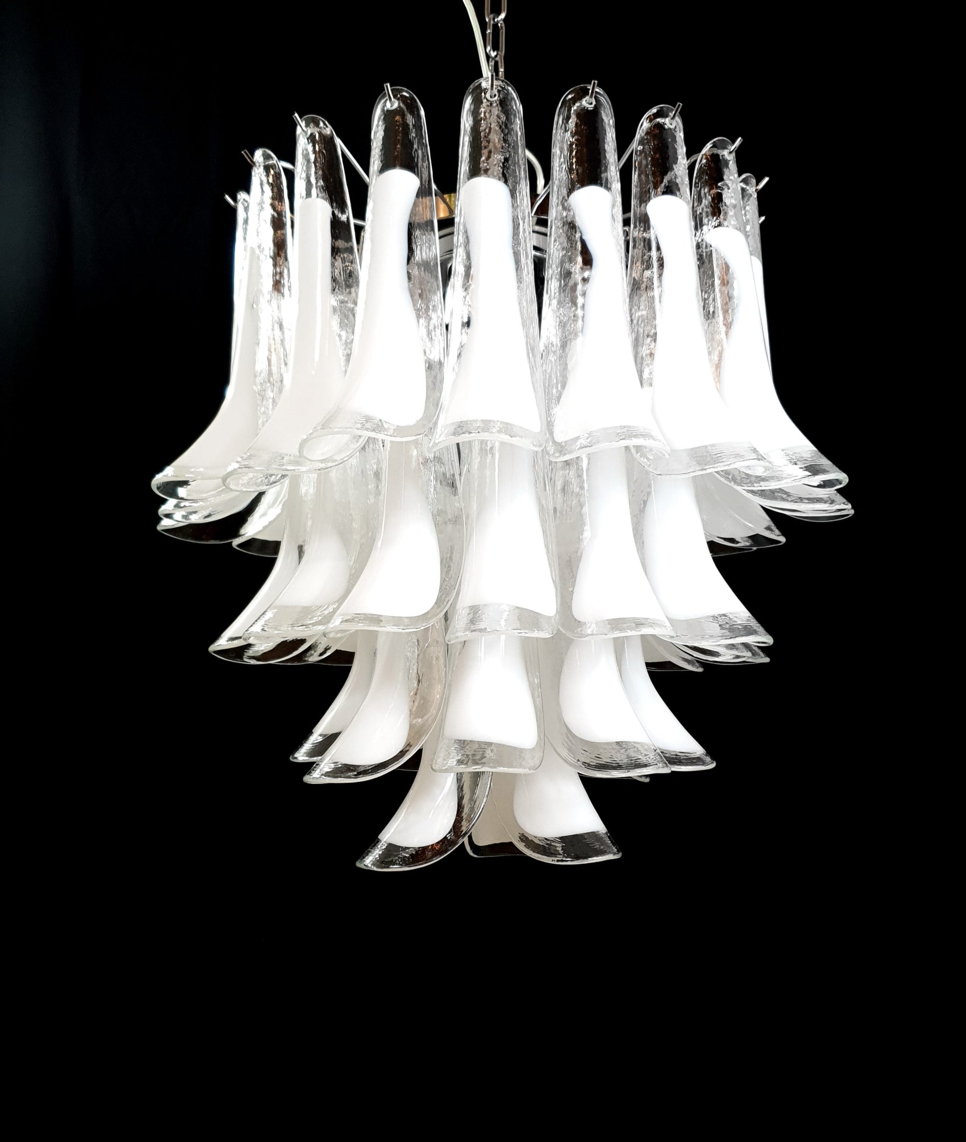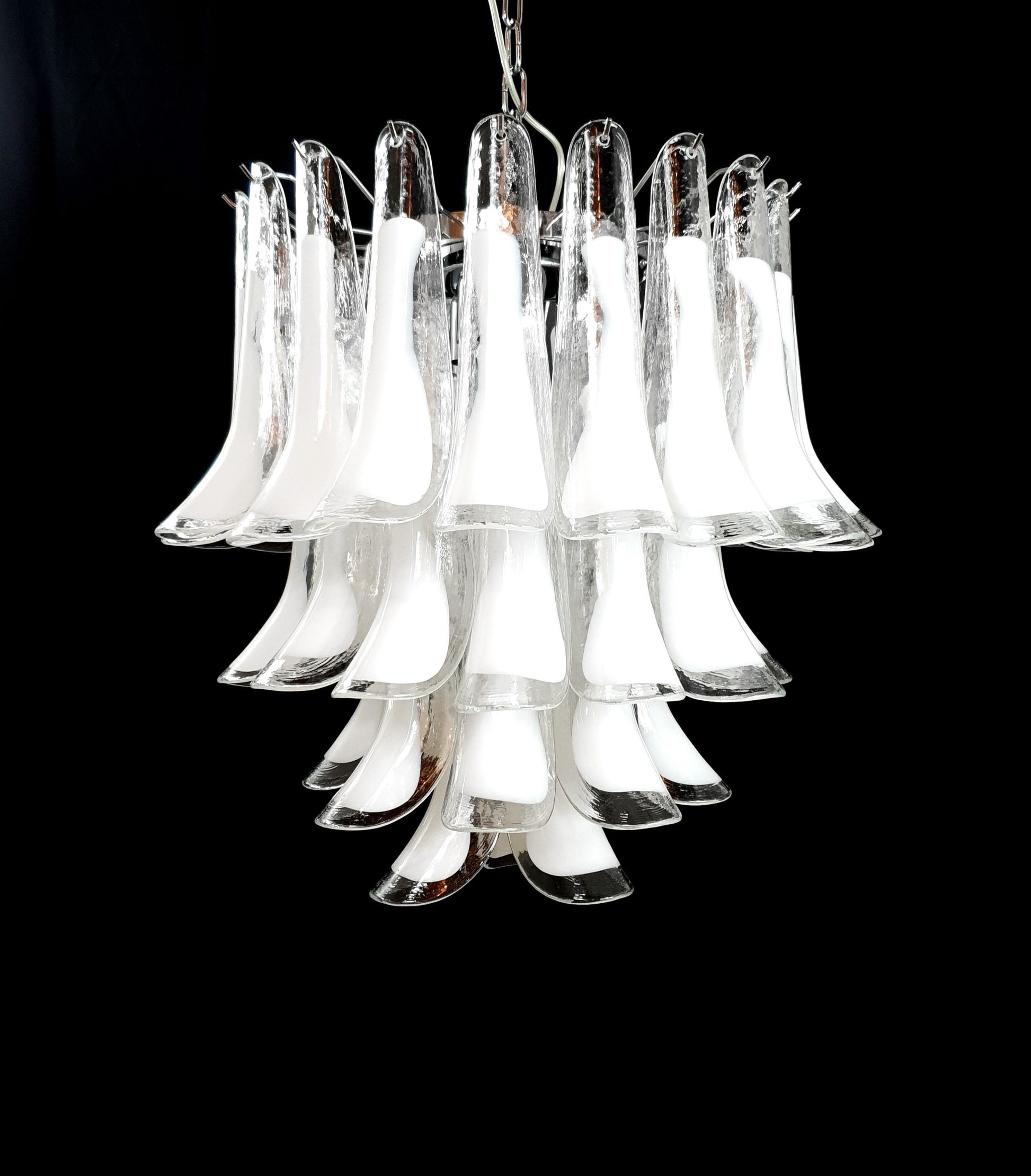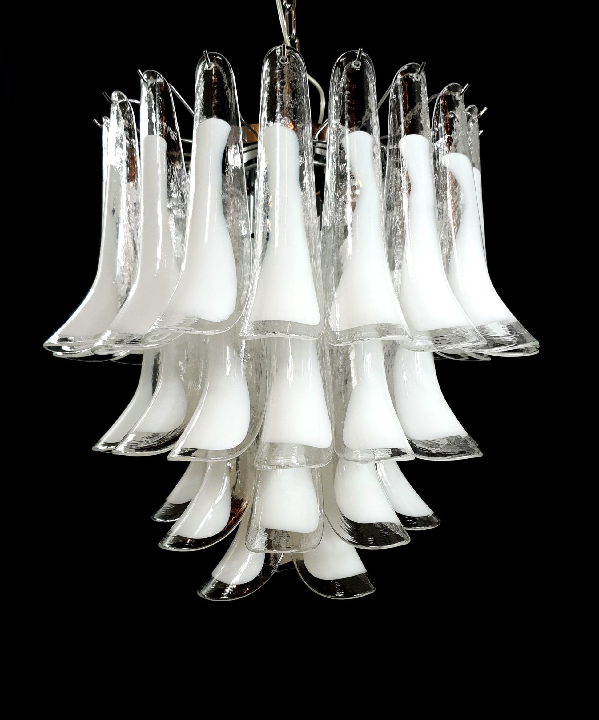 Lampadario Vintage di Murano, stile Mazzega, anni'80, rotondo ed adatto ad ogni ambiente. Questo lampadario è composto da n. 44 vetri petali di Murano ,cristallo con anima bianco latte . Il lampadario ha riflessi di luce molto speciali visti dalle diverse angolazioni. I vetri petali cristallo con anima bianca regalano un senso di regalità e raffinatezza. Finitura in un bellissimo cromo lucido, molto elegante. Molto esclusivo, riempie la stanza con colore ma sobrietà. Con la sua forma riempitiva e completa non riuscirai a smettere di guardarlo dalle mille angolazioni di luce. Il lampadario visto da sotto ricorda un fiore sbocciato in primavera, una profumata margherita. Questo lampadario ha diametro 65 cm. ed altezza 60 cm. Porta n. 3 luci E27. Questo lampadario è stato creato e prodotto presso la nostra fabbrica, dai nostri Maestri.