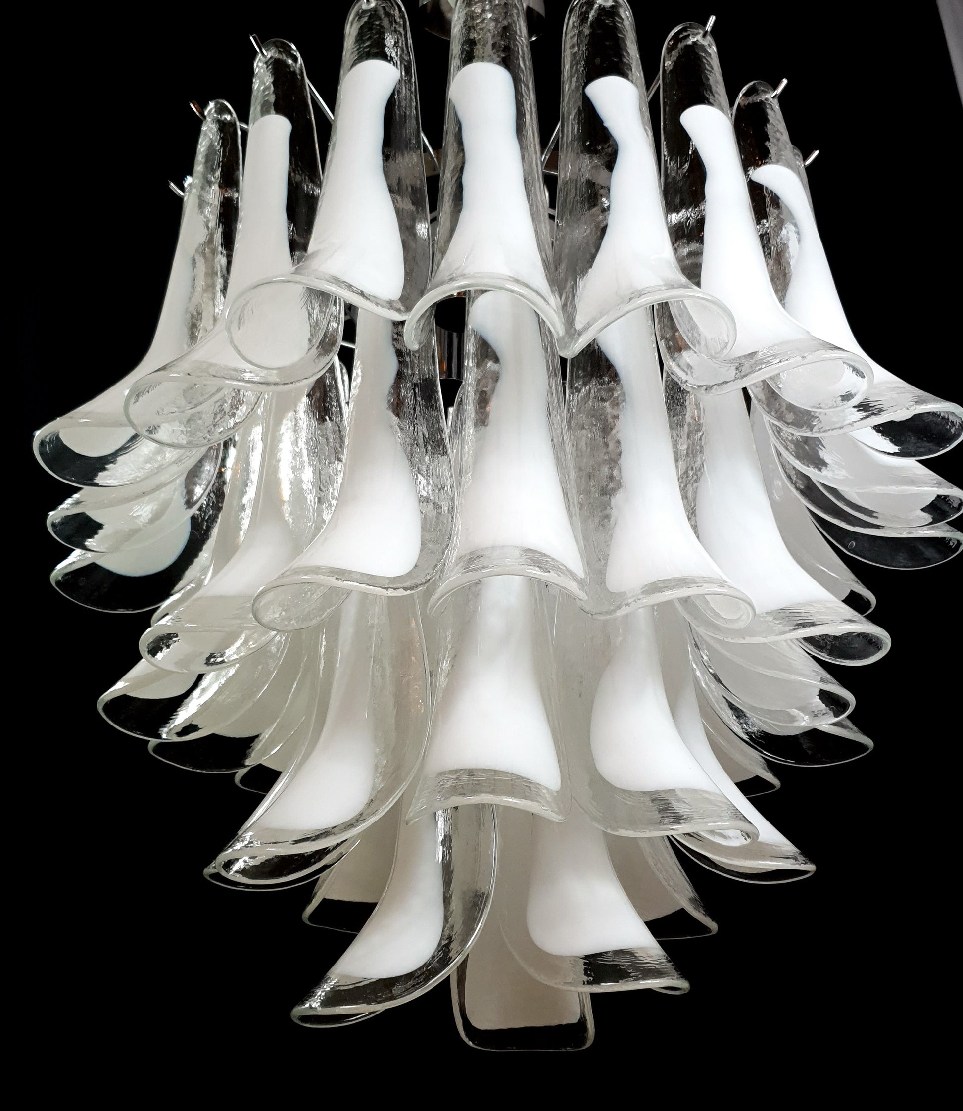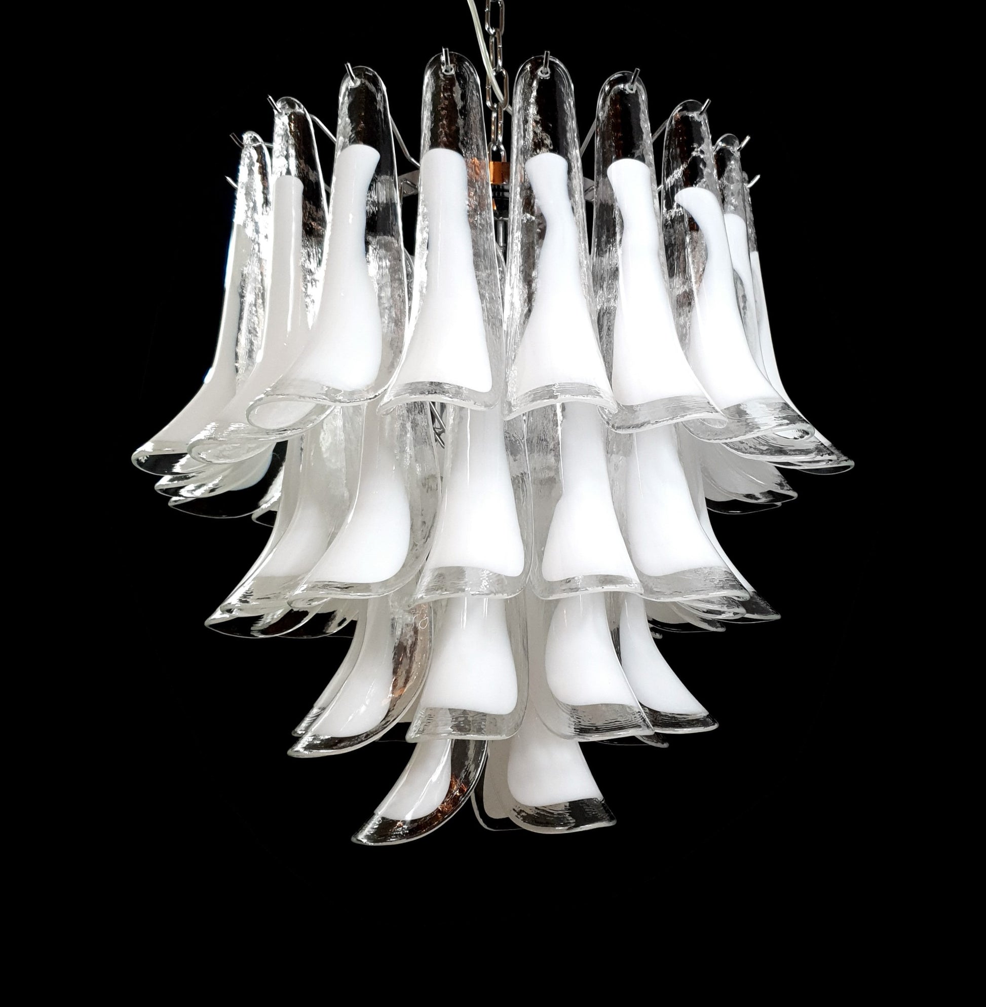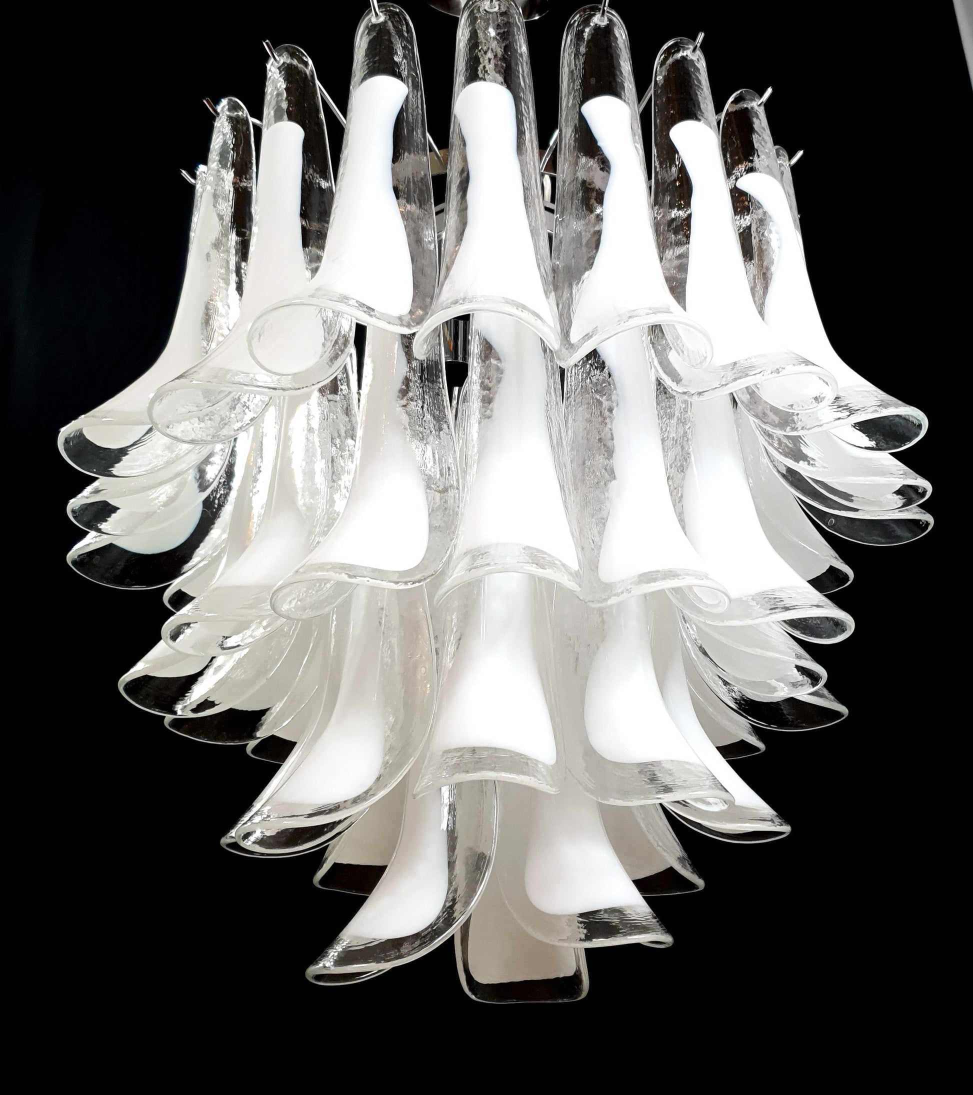Lampadario Vintage di Murano, stile Mazzega, anni'80, rotondo ed adatto ad ogni ambiente. Questo lampadario è composto da n. 44 vetri petali di Murano ,cristallo con anima bianco latte . Il lampadario ha riflessi di luce molto speciali visti dalle diverse angolazioni. I vetri petali cristallo con anima bianca regalano un senso di regalità e raffinatezza. Finitura in un bellissimo cromo lucido, molto elegante. Molto esclusivo, riempie la stanza con colore ma sobrietà. Con la sua forma riempitiva e completa non riuscirai a smettere di guardarlo dalle mille angolazioni di luce. Il lampadario visto da sotto ricorda un fiore sbocciato in primavera, una profumata margherita. Questo lampadario ha diametro 65 cm. ed altezza 60 cm. Porta n. 3 luci E27. Questo lampadario è stato creato e prodotto presso la nostra fabbrica, dai nostri Maestri.