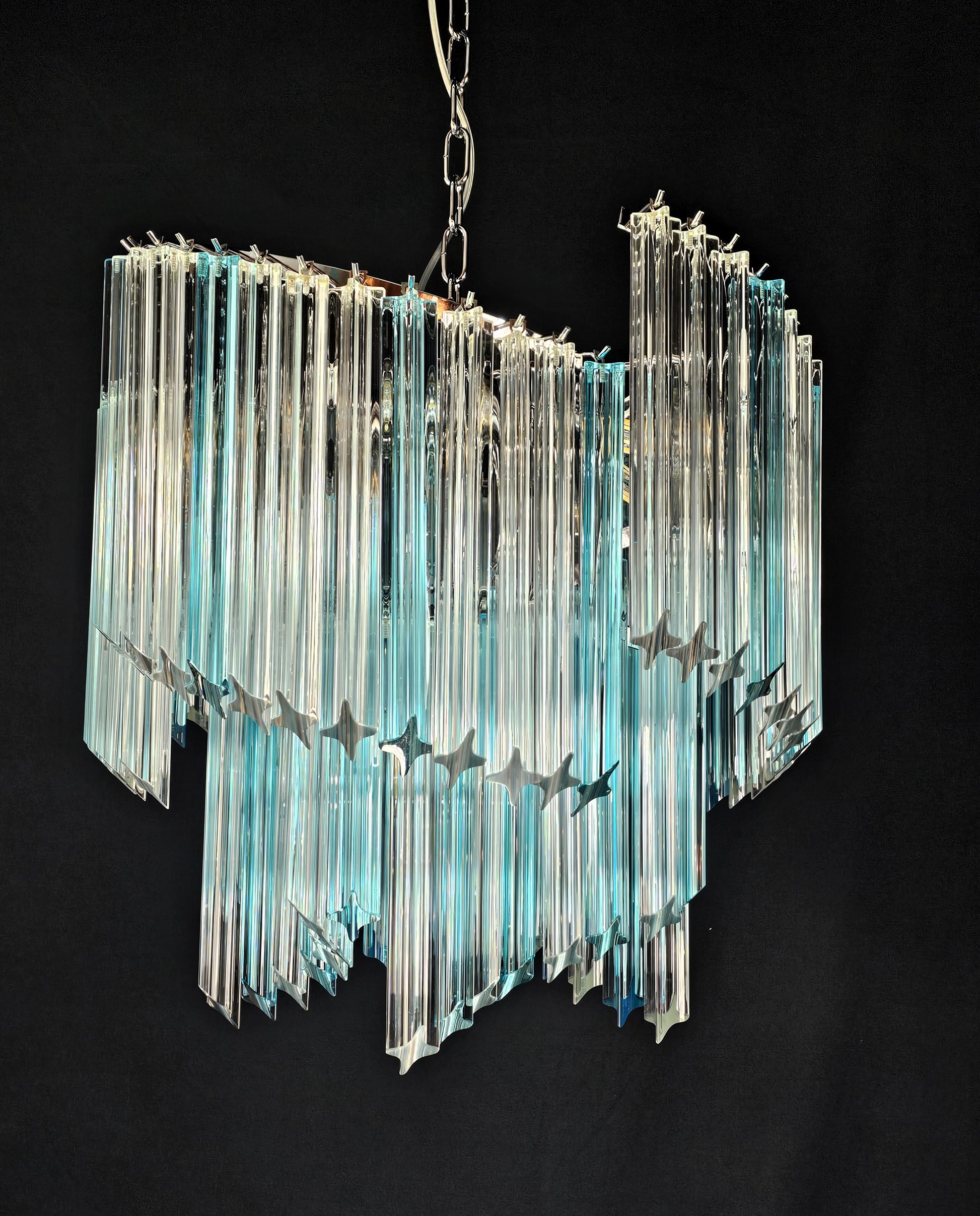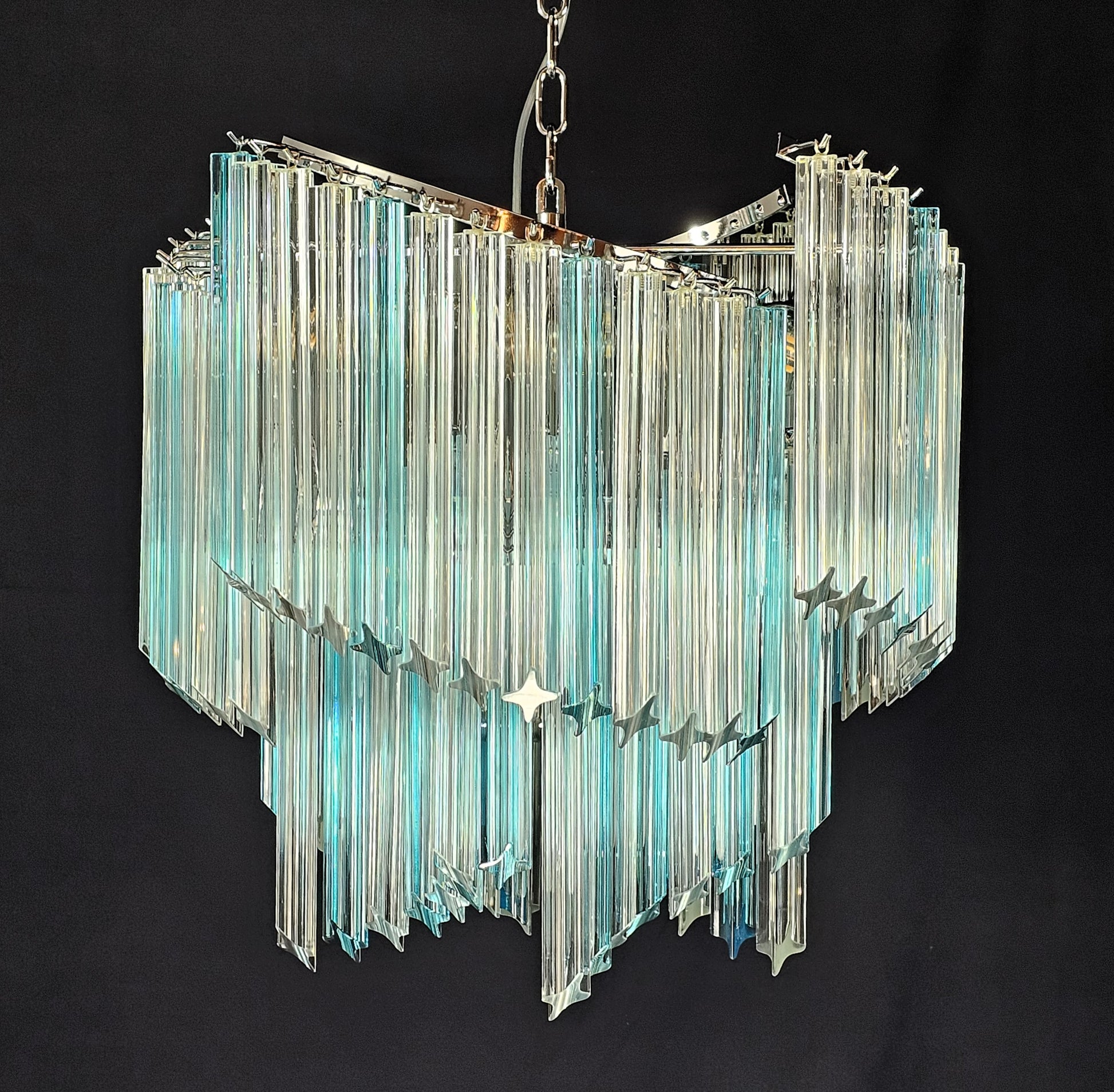 Lampadario Vintage Murano, stile Venini, anni'80.Modello Ventaglio.Vetri prismi di Murano cristallo e acquamare. Designed and Made in Italy.