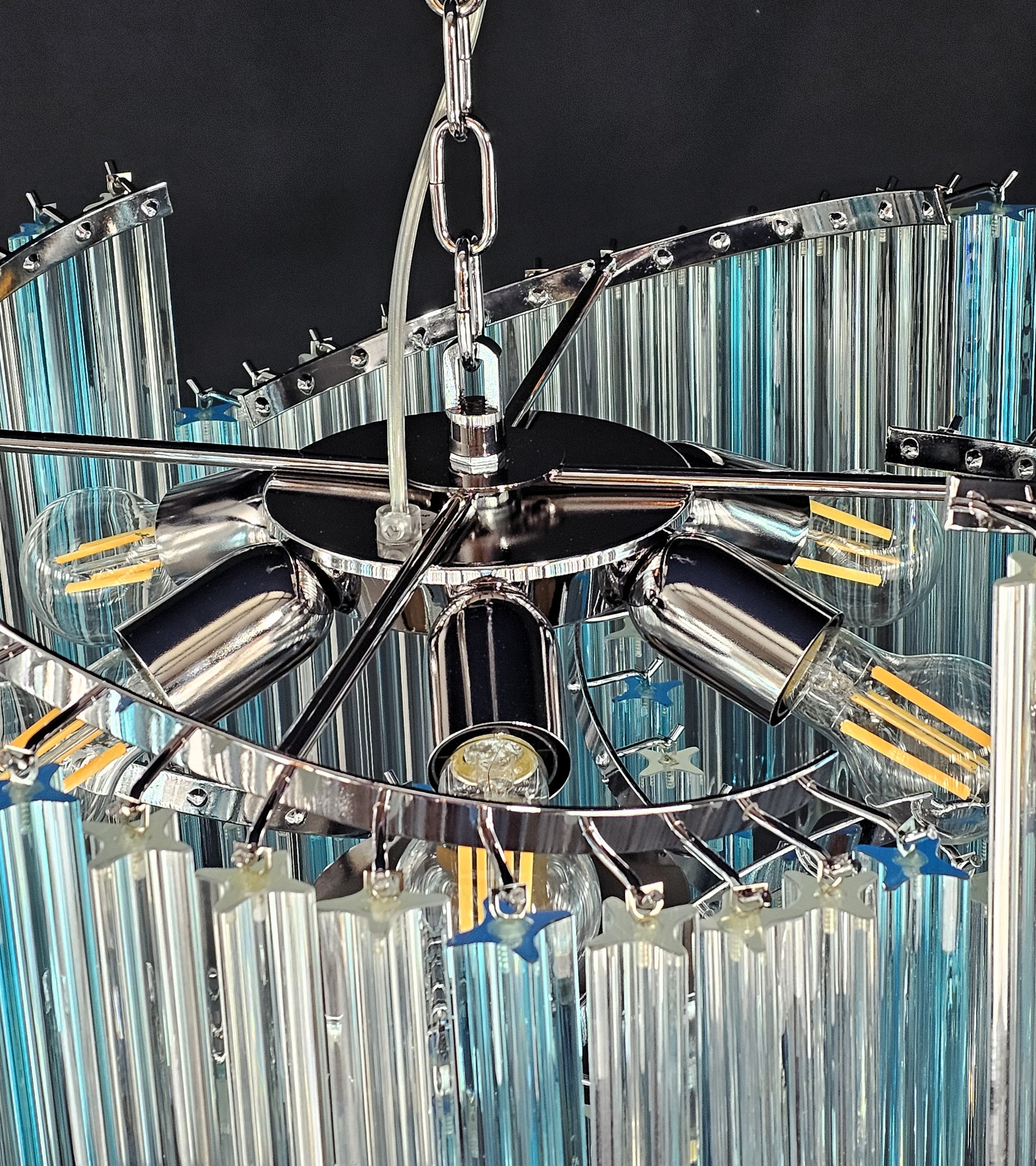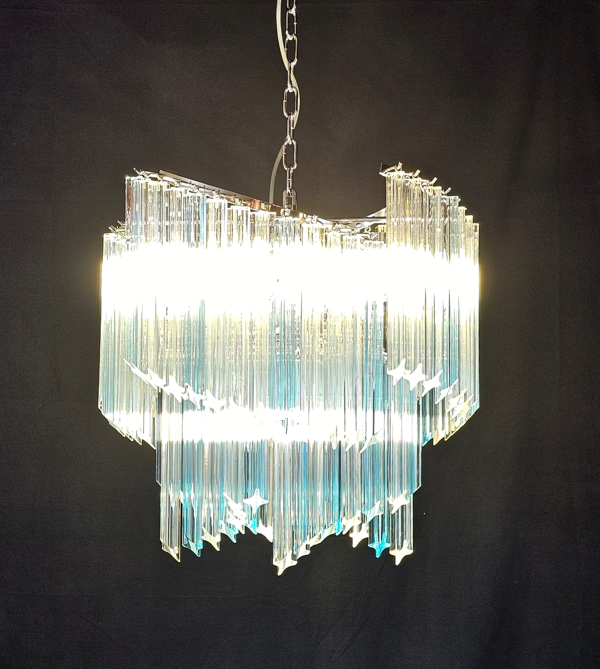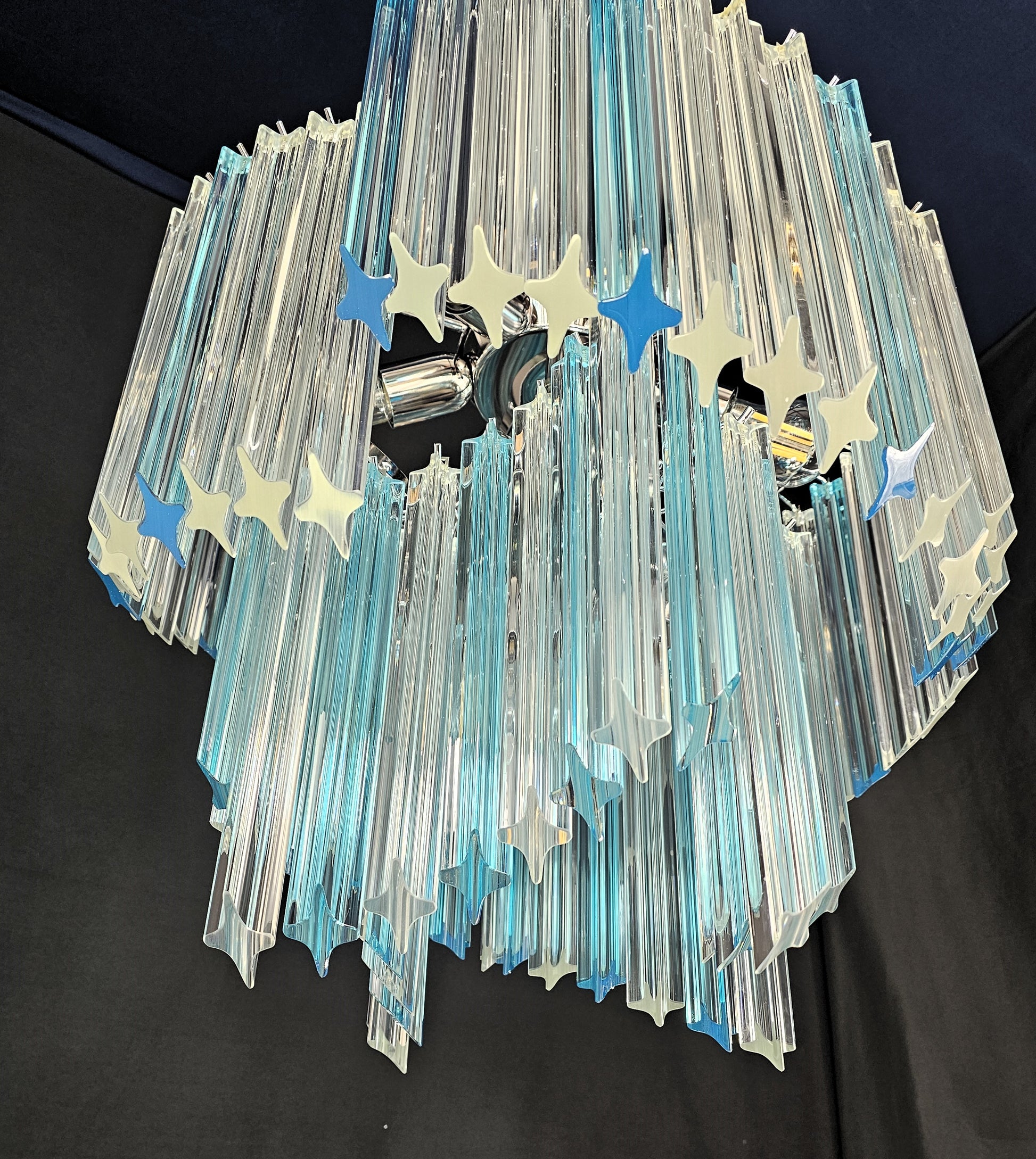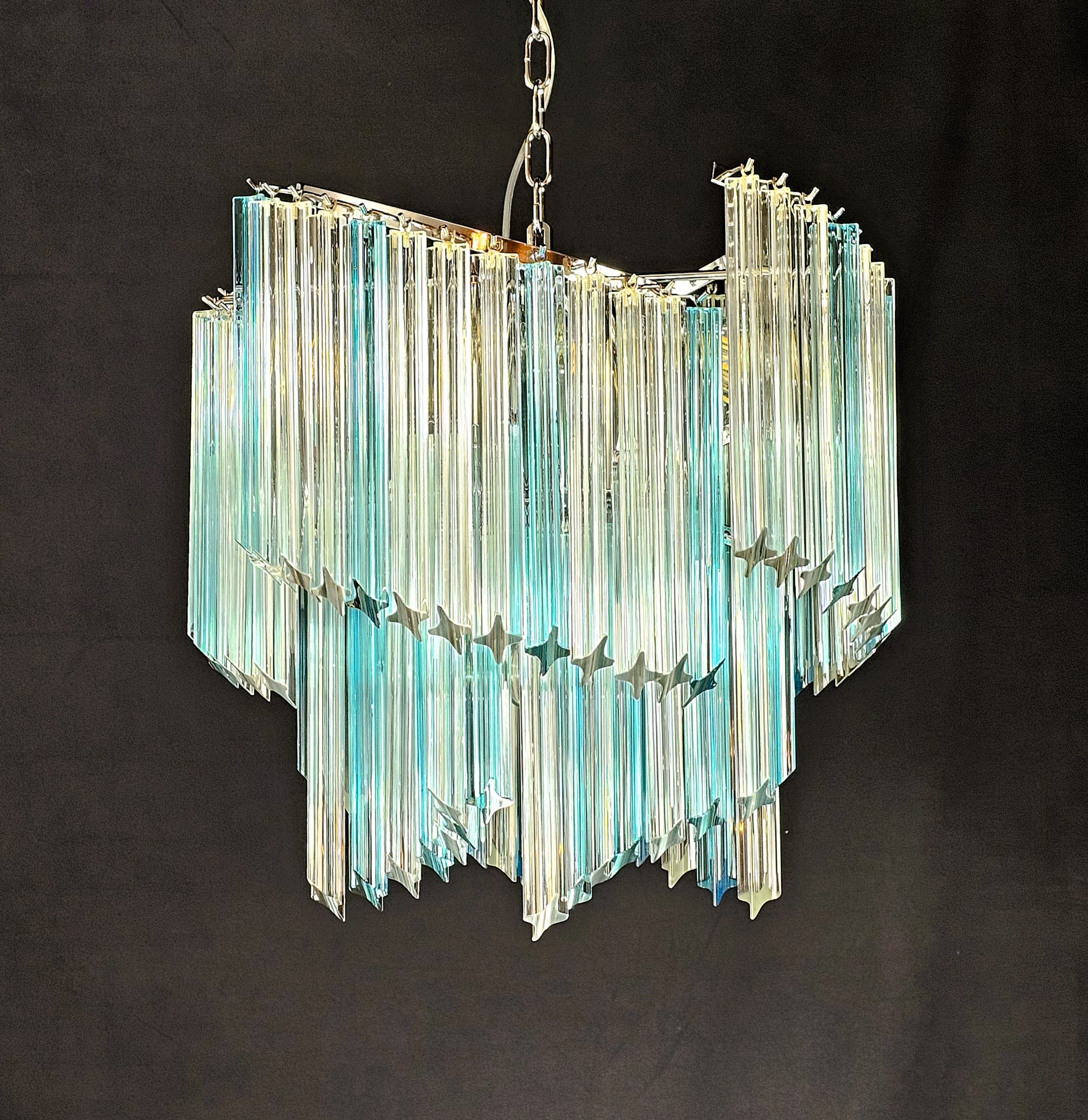 Da notare: nelle foto del lampadario visto da sotto, eventuali parti finali dei vetri prismi di colore celesti diverso dal colore azzurro acquamare, sono solo un effetto della macchina fotografica dovuto al contrasto delle luci. Il colore effettivo di quei vetri è interamente azzurro acquamare.