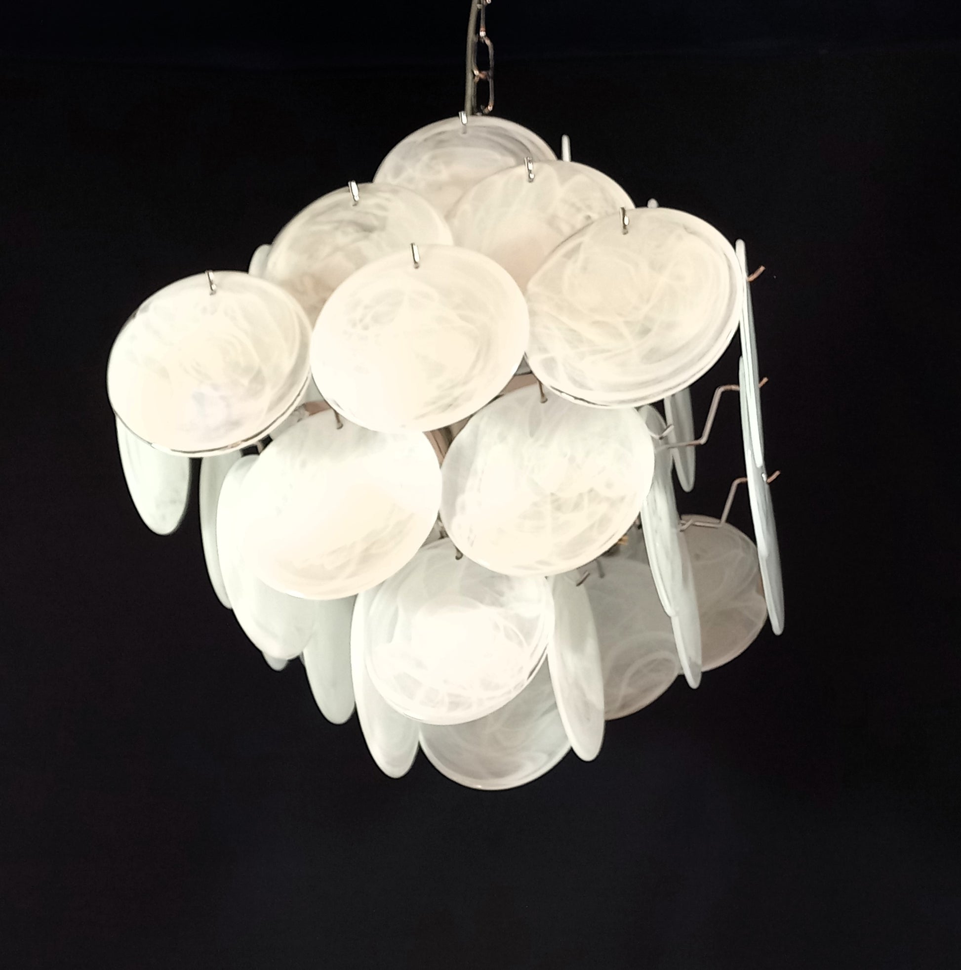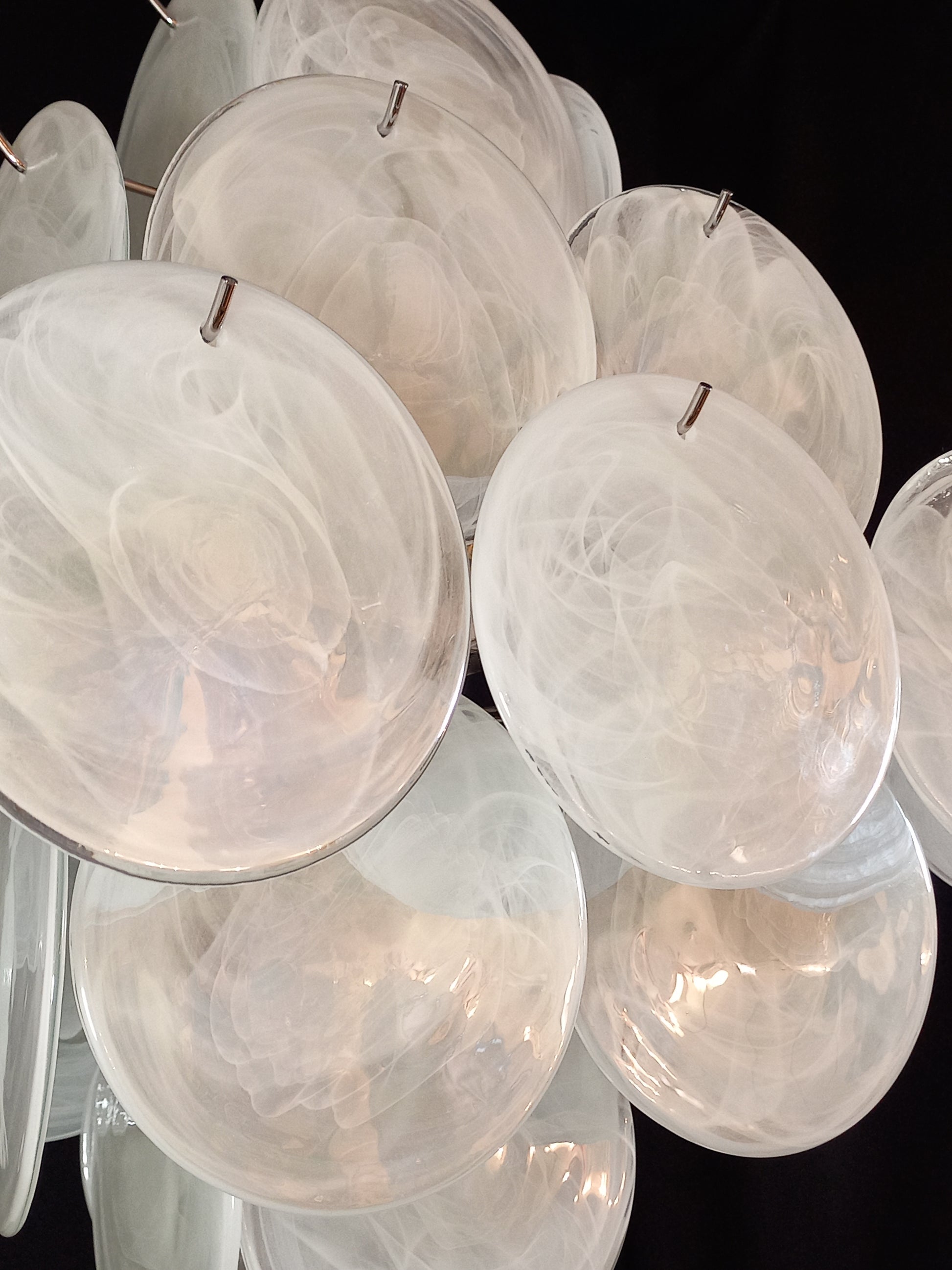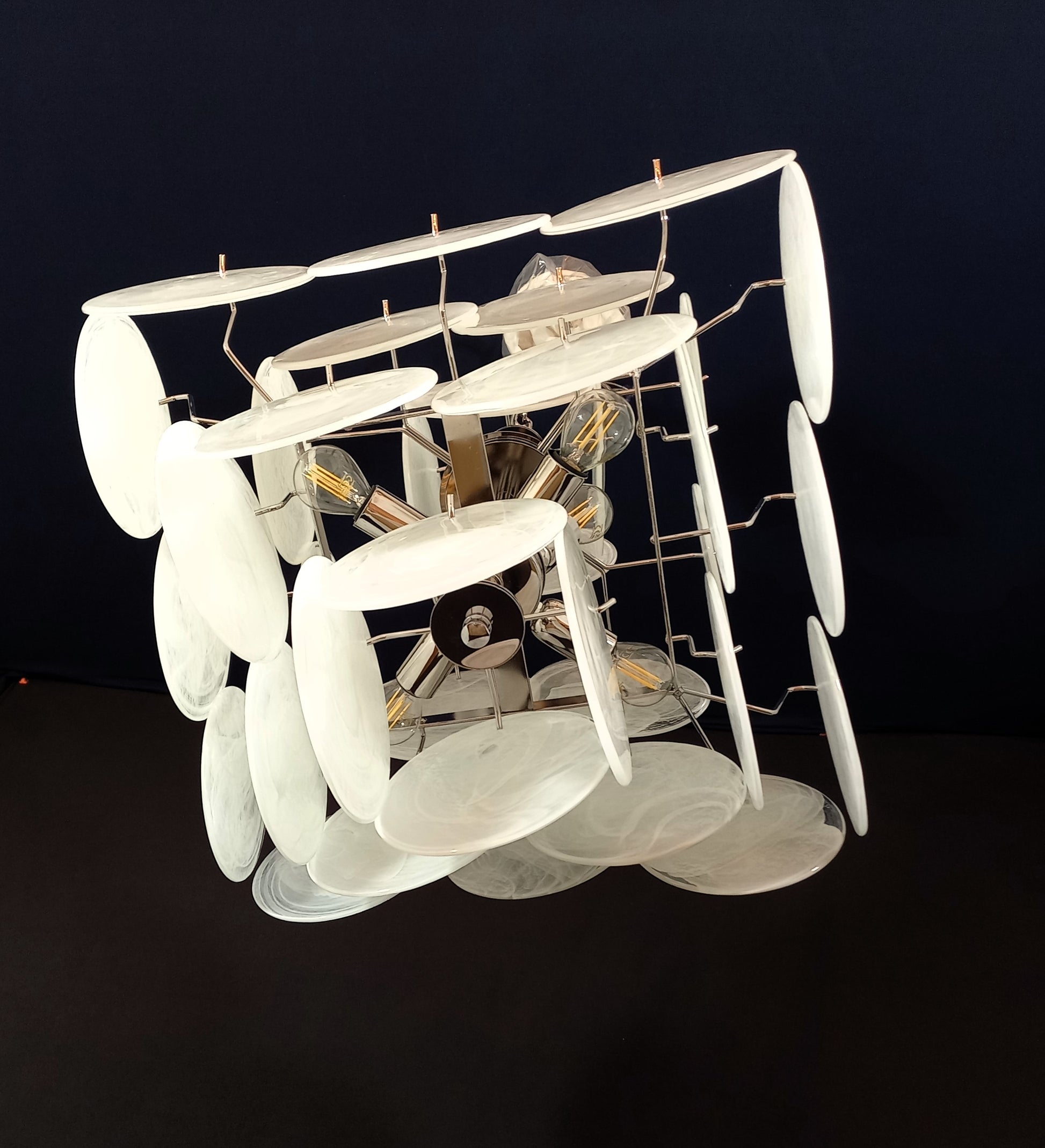 Lampadario Vintage quadrato a vetri dischi. Vetri dischi artigianali in bianco alabastro, made in Murano, Italy