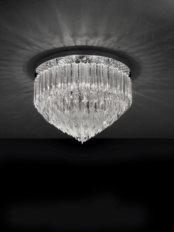 Bellissima plafoniera a soffitto con piatto in acciaio riflettente, cromo lucido. Questa plafoniera ha misure diametro 50 cm. e altezza 36 cm. Ha bellissimi vetri prismi cristallo quadriedri fatti a mano, che riflettono la luce in maniera esemplare. Questa plafoniera è ideata e creata dai nostri Maestri, nella nostra azienda, artigianalmente fatta a mano. La forma del lampadario è quello di una pigna a punta , dove il piatto di acciaio fa riflettere ancor più i bagliori luccicanti emanati dalle lampadine e dai vetri. Il numero delle luci è n. 6 luci E14 (lampadine non incluse). Il peso del lampadario è 25 kg.