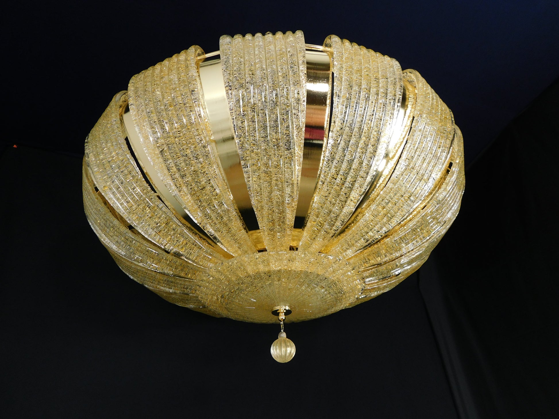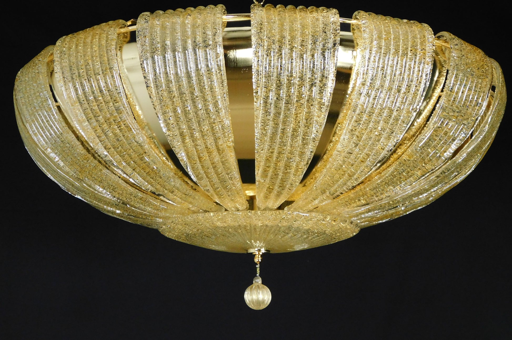 Plafoniera di Murano fatta a mano, artigianalmente, stile saturno. Raffinata ed elegante plafoniera a soffitto, ispirata al mondo delle spazio. Plafoniera con finitura in oro. Sormontata da bellissimi vetri di Murano, fatti a mano in graniglia ambra. Completa il tutto un disco di vetro di Murano sotto la plafoniera, sempre in graniglia ambra, e un bellissimo e prezioso finalino, una piccola sfera di vetro soffiato a mano. Molto regale e più bella da vedere da vivo che da spiegare. Un tripudio di riflessi dorati da mille e una notte. Dimensione diametro 76 e altezza 30 cm.