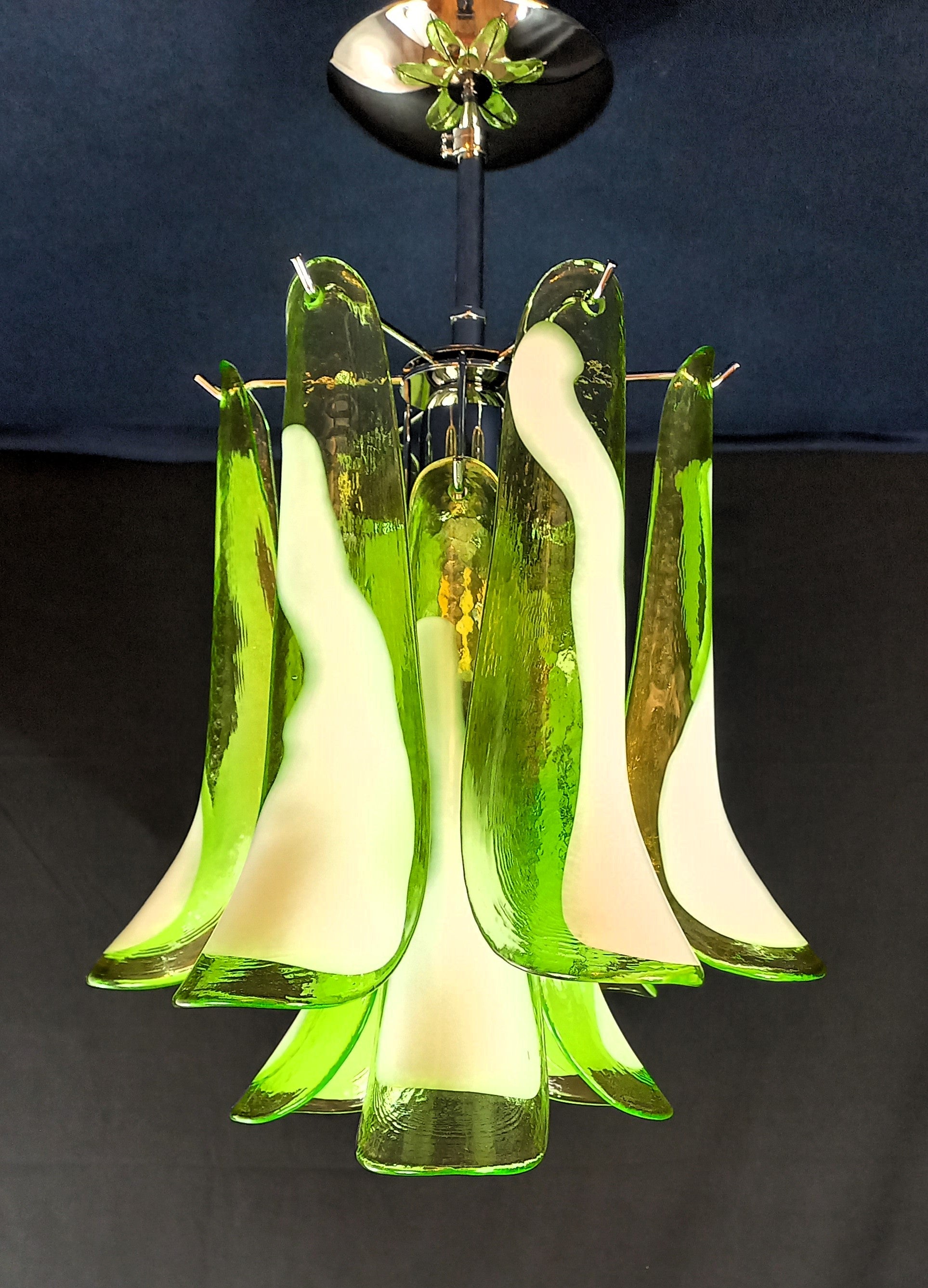 Plafoniera lampadario Vintage Murano, stile Mazzega, anni'80. Vetri di Murano petali verde con anima bianca. Designed and Made in Italy.