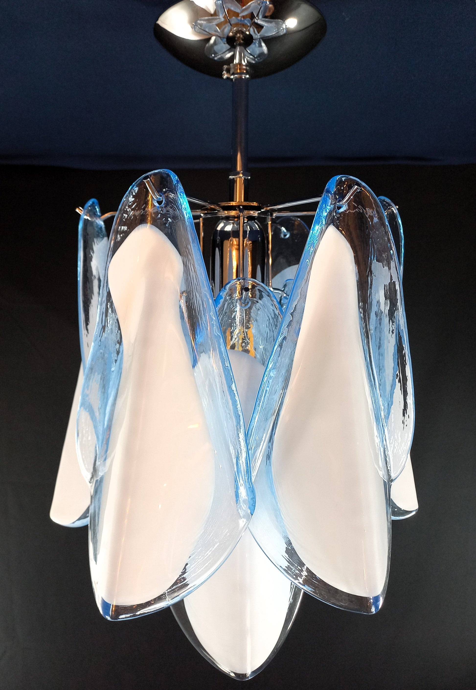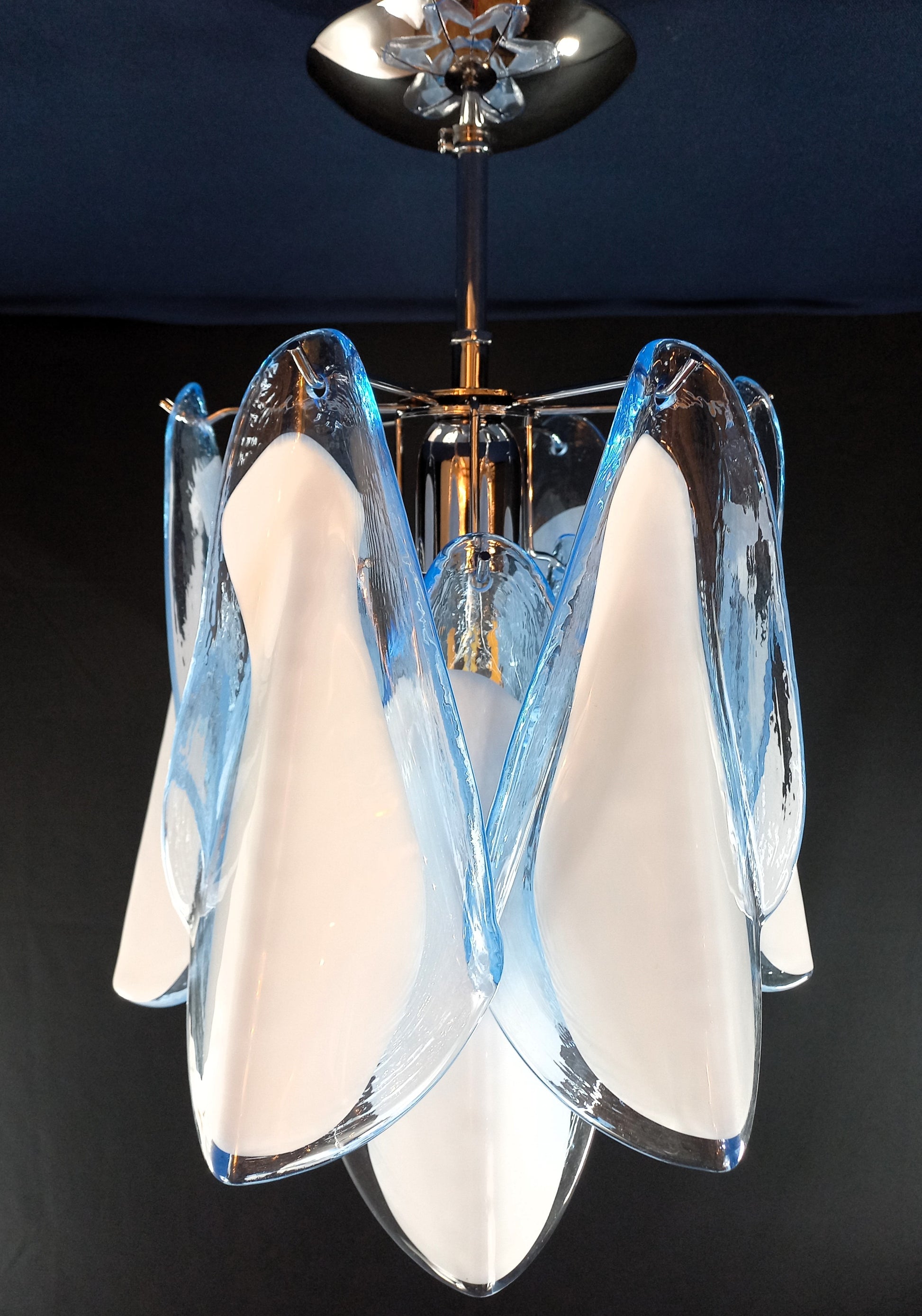 Plafoniera Vintage Murano, stile Mazzega, anni'70. Vetri di Murano rondine in cristallo blu chiaro, anima bianca. Designed and Made in Italy