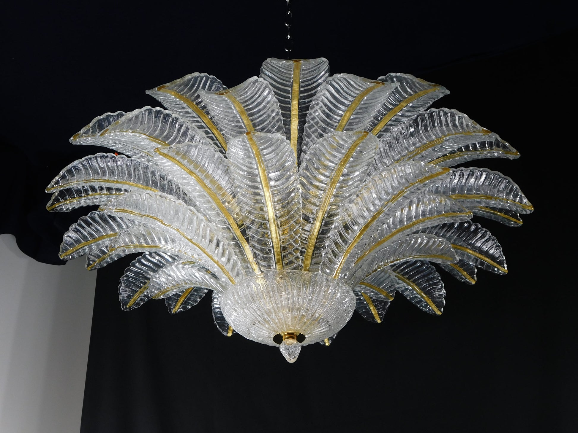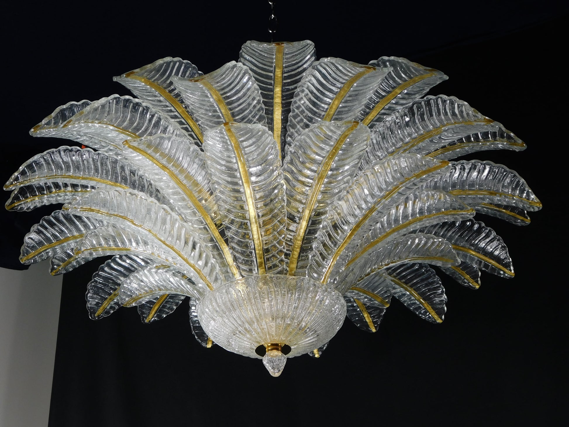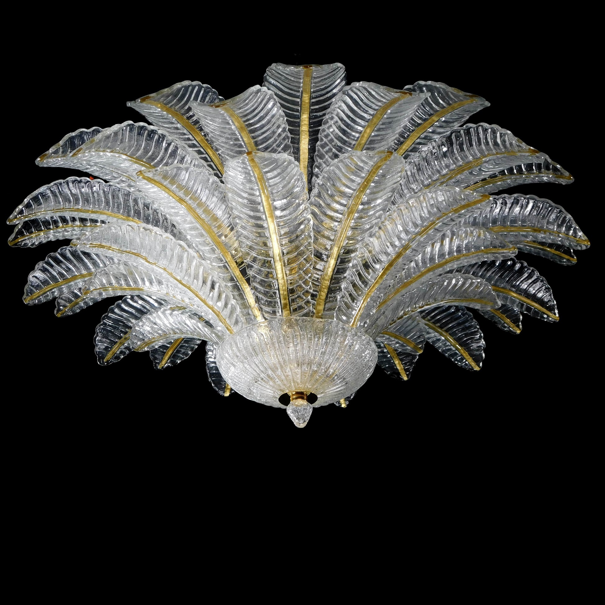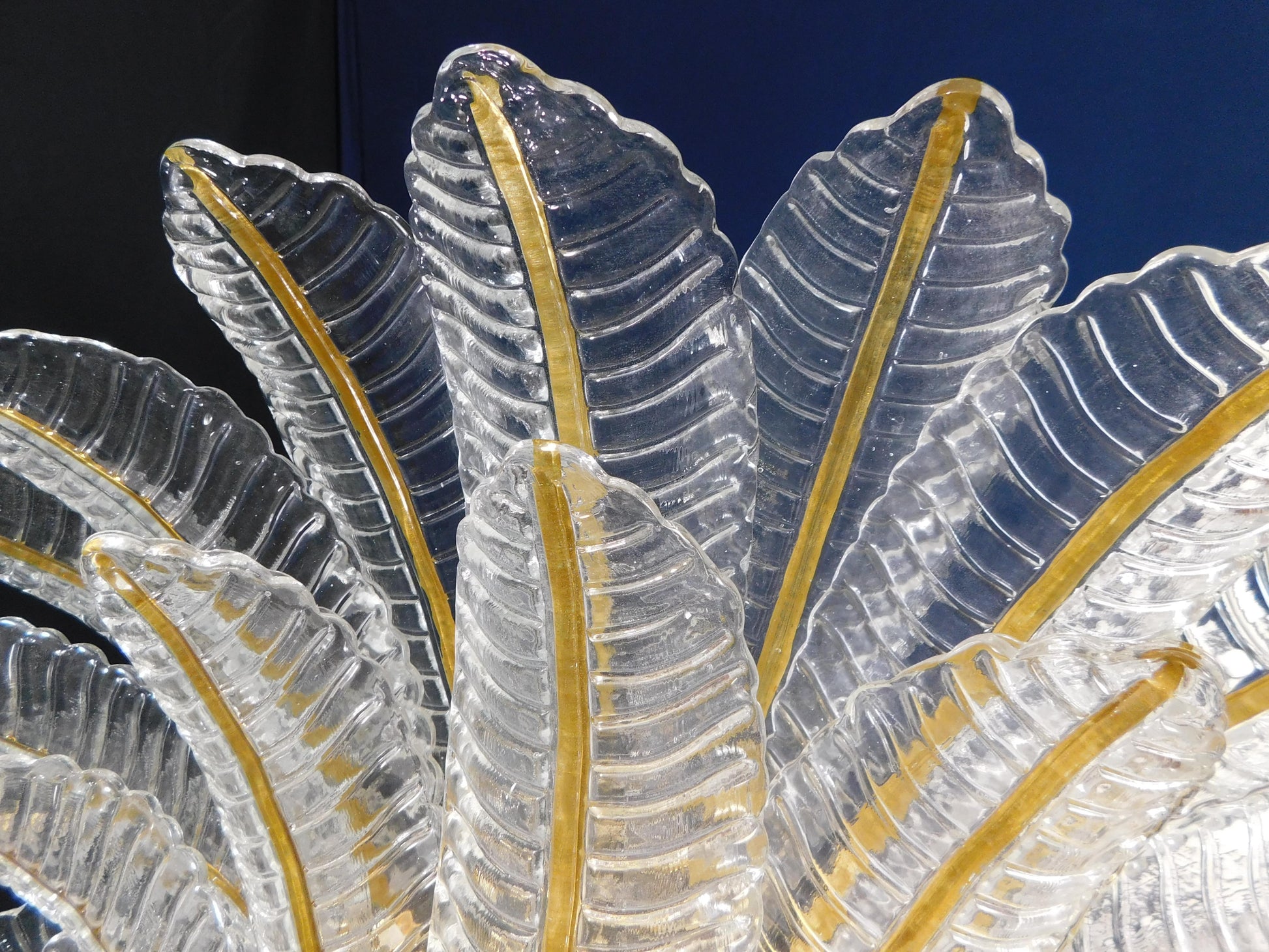 Spettacolare ed importante lampadario vintage a soffitto (plafoniera) completamente realizzato a mano dal nostro Maestro in maniera artigianale. Questa pregiata plafoniera degli anni'80 è composta da vetri a forma di foglia in vero vetro cristallo di Murano ,fatte a mano, e con filo d'oro interno sulla venatura centrale della foglia. Il lampadario è completato da un' elegante coppa di vetro in cristallo soffiato sotto, con ulteriore goccia di cristallo soffiato, sempre artigianale, che va ad abbellire ulteriormente e chiudere il lampadario. Di unica eleganza, rende i vostri ambienti regali ed importanti. La finitura interna del lampadario è in oro lucido, che fa brillare ancor di più questa stupenda creazione. Le misure di questa plafoniera sono diametro 100 cm. ed altezza 45 cm. All'interno ci sono n. 9 luci E27 (lampadine non incluse) e attenzione: possiamo modificare il cablaggio in base al vostro Paese, trasformandolo anche per U.K. e Usa!!